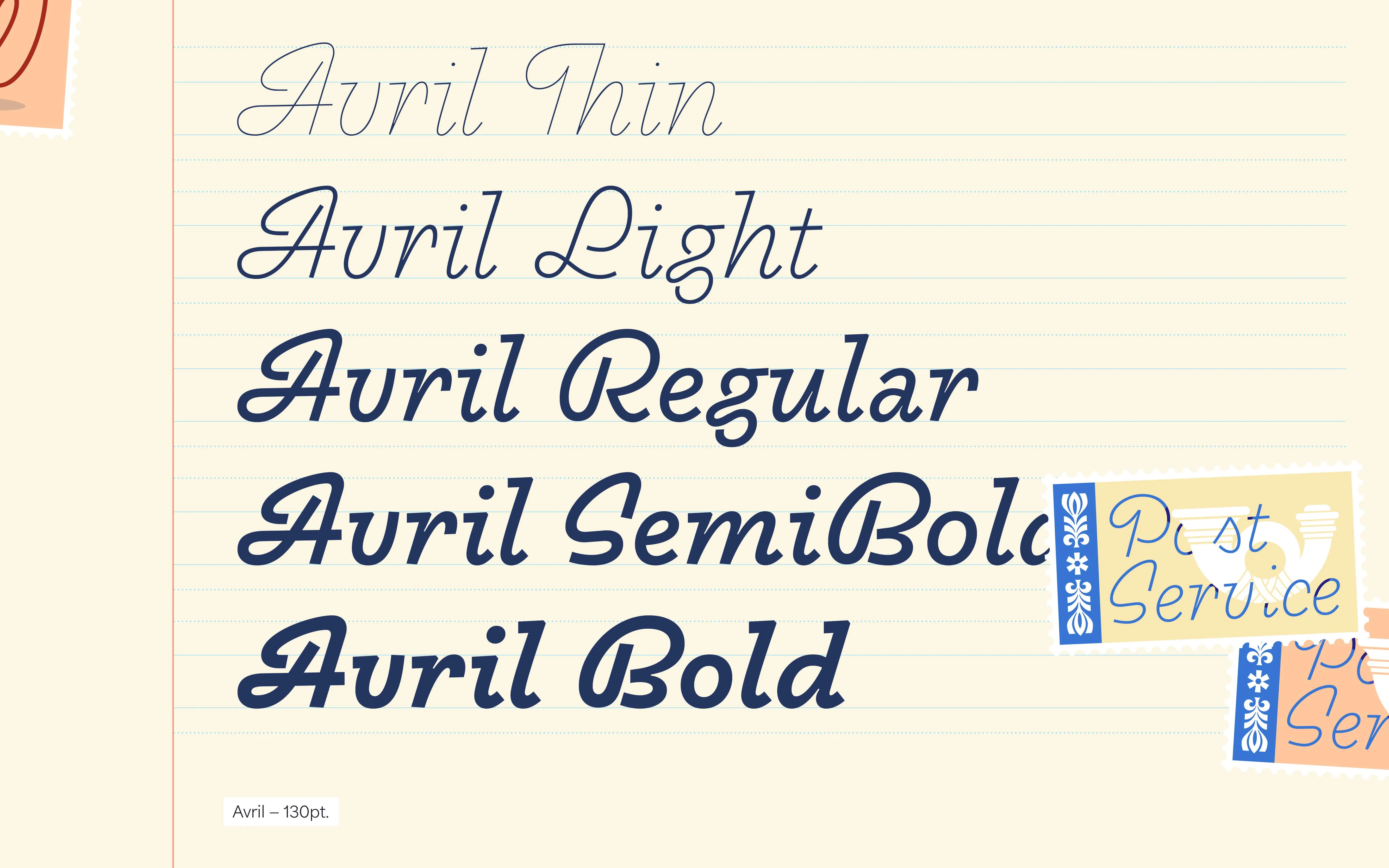 Avril is a revival of a 1950 painter's letter design. The fantasy combined with the restrained virtuosity of this calligraphy makes it a typographic tour de force for your offbeat communications. Again, three weights only.