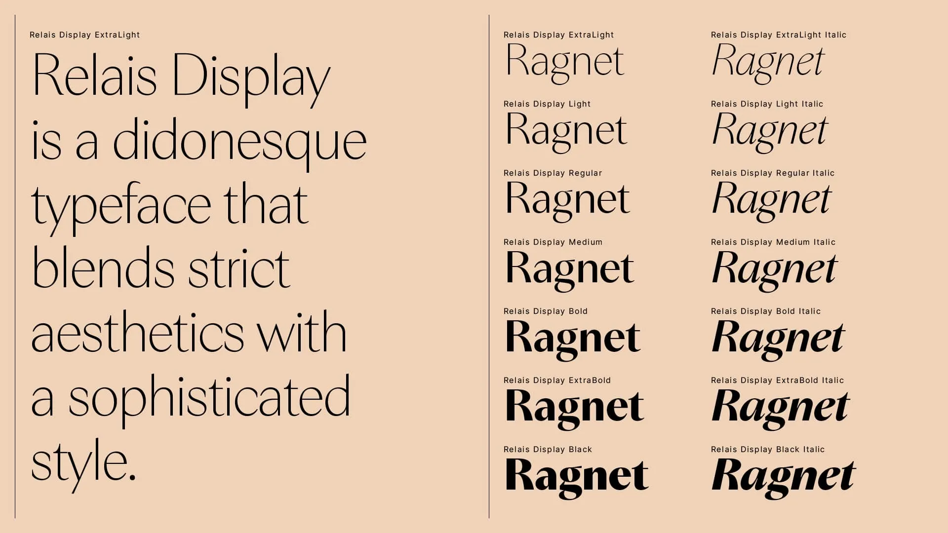 Long-vaunted French elegance doesn't stop at Didot typefaces. Relais proposes a contemporary reinterpretation without the pomp of the past. The recipe isn't as simple as a scalpel cutting up the serifs, but begins all the same with this important operation, accompanied by a skillful adjustment of the curves. 14 fonts for 7 serifs and italics.