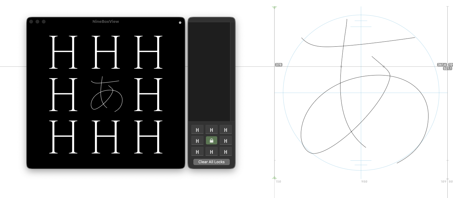 To parameterize central alignment, I relied on a visual metaphor that often helps me: I imagine Japanese letters as pieces of meat skewered on a barbecue rod. While the Latin alphabet rests on a baseline, Japanese characters float, requiring perfect central piercing along an axis. The challenge is doubled, since this optical balance must be precise both horizontally and vertically. To ensure this accuracy, I used the Nine Box View plugin in Glyphs, which allows the glyph to be viewed surrounded by neighbors in all directions. I used the Latin H as a constant reference; because it is a solid, rectilinear shape that fills almost the entire box, it served as the ideal frame to validate the kana’s volume and central alignment.
