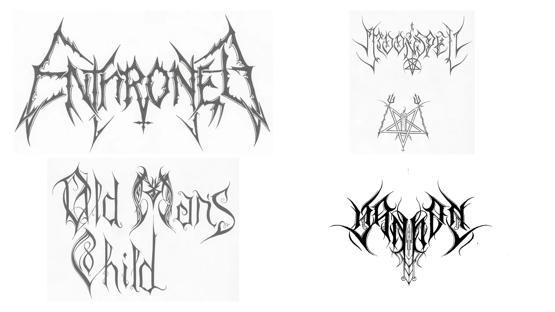 The logos of Black Metal bands generally exploit pentagrams and the lettering is inspired by gothic calligraphy: Watain, Dark Funeral, Marduk, or even King Diamond in a more Heavy Metal musical style.