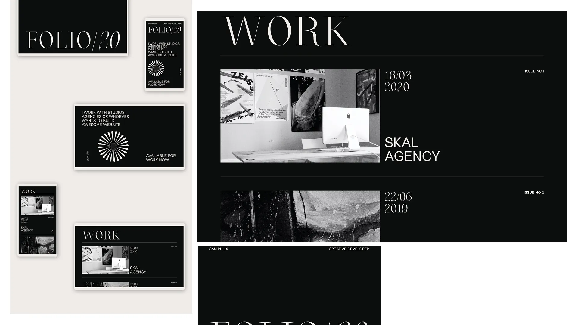 Portfolio website for Sam Phlix, creative developer based in Lyon, France, using Oroban and Surt throughout. The font pairing iw working pretty well with a basic contrast between Serif and Sans.