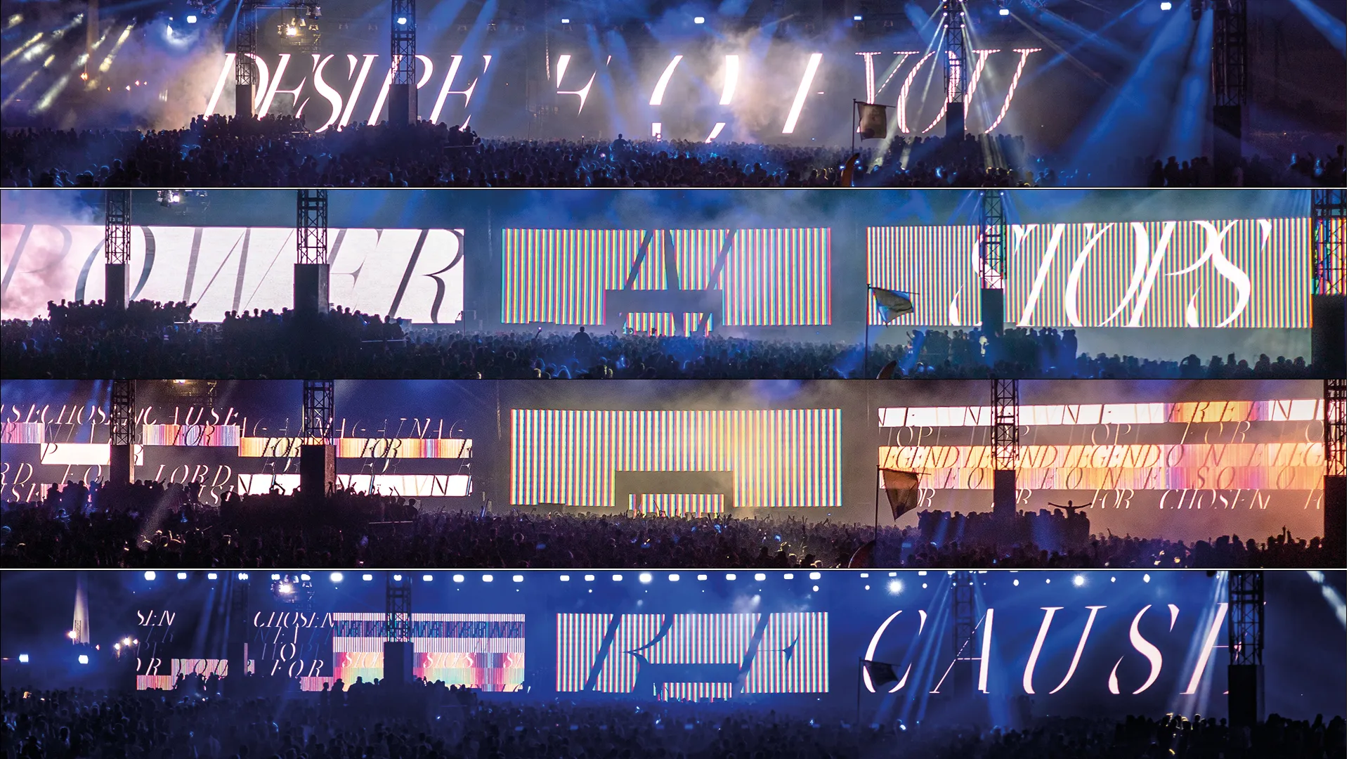 Malo Lacroix designed the live visuals for the Balzaal Redbull Electropedia stage at the Dour Festival 2019, curated by Simon Médard. He worked with Oroban and animated it for an ultra-panoramic scenographic set up, with light and LED system by Arf&Yes. The batch of motion sequences were inspired by short statements from the world of mass media and advertising.