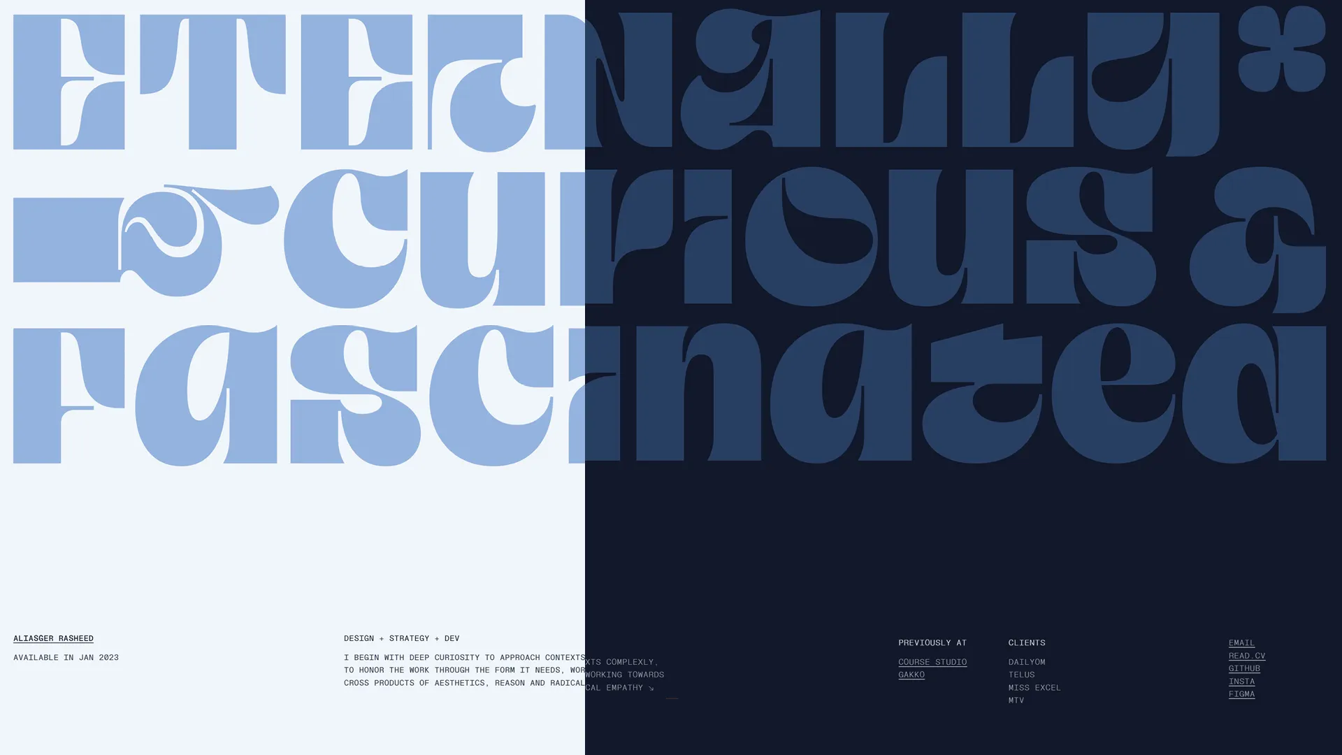 Aliasger Rasheed used for his design and photography portfolio website, Taklobo (The Box) as the animated display type on landing and in the footer.