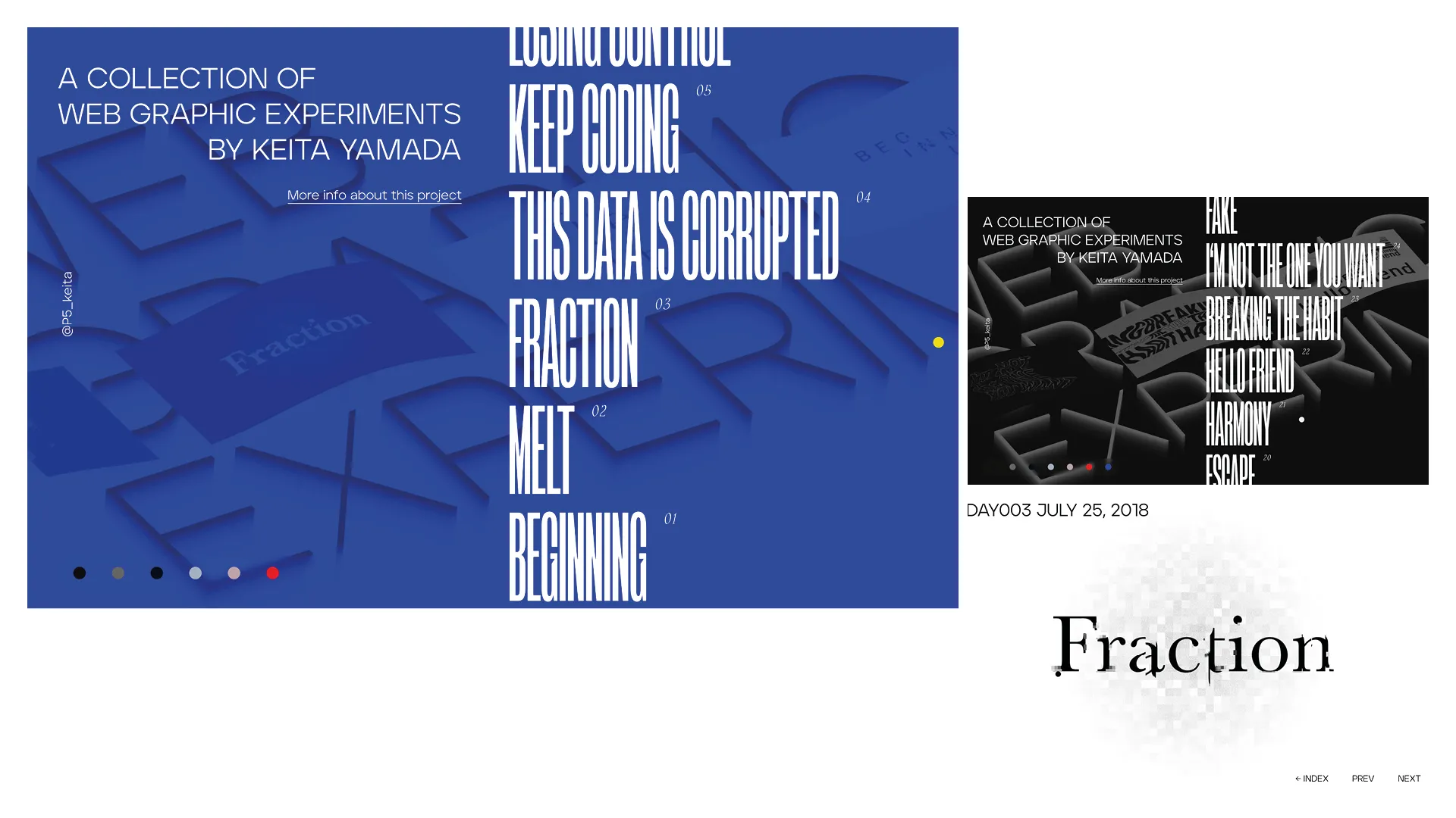 For his personal project “Web Graphic Experiments”, Japanese front-end developer Keita Yamada made a plethora of web animations. In the same shape of a library, we can navigate through his experiments almost infinitely. Typeset in Arges Condensed Black, with numerals from Oroban, the navigation is fluid and baffling.