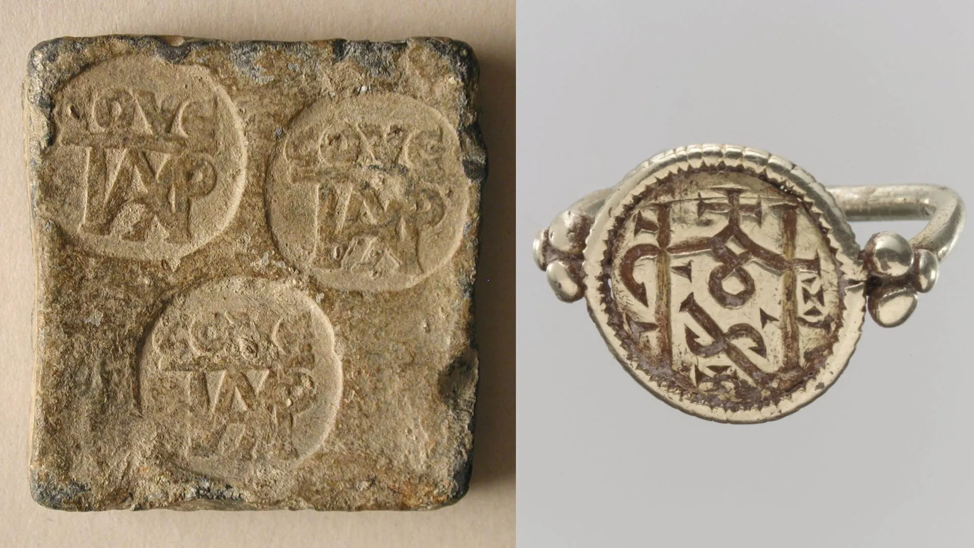 Antiquite monogram on lead ingot ("city eparchy", 6th century, 80 g). Merovingian ring in electrum (mix of gold and silver), 7th century, north of France.