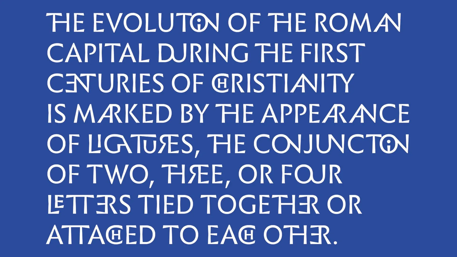 During the first centuries of Christianity, lapidary engravers took up the principle of ligature used in the monogram, while preserving the basic line of the letters. Several operations are possible to create a ligature.