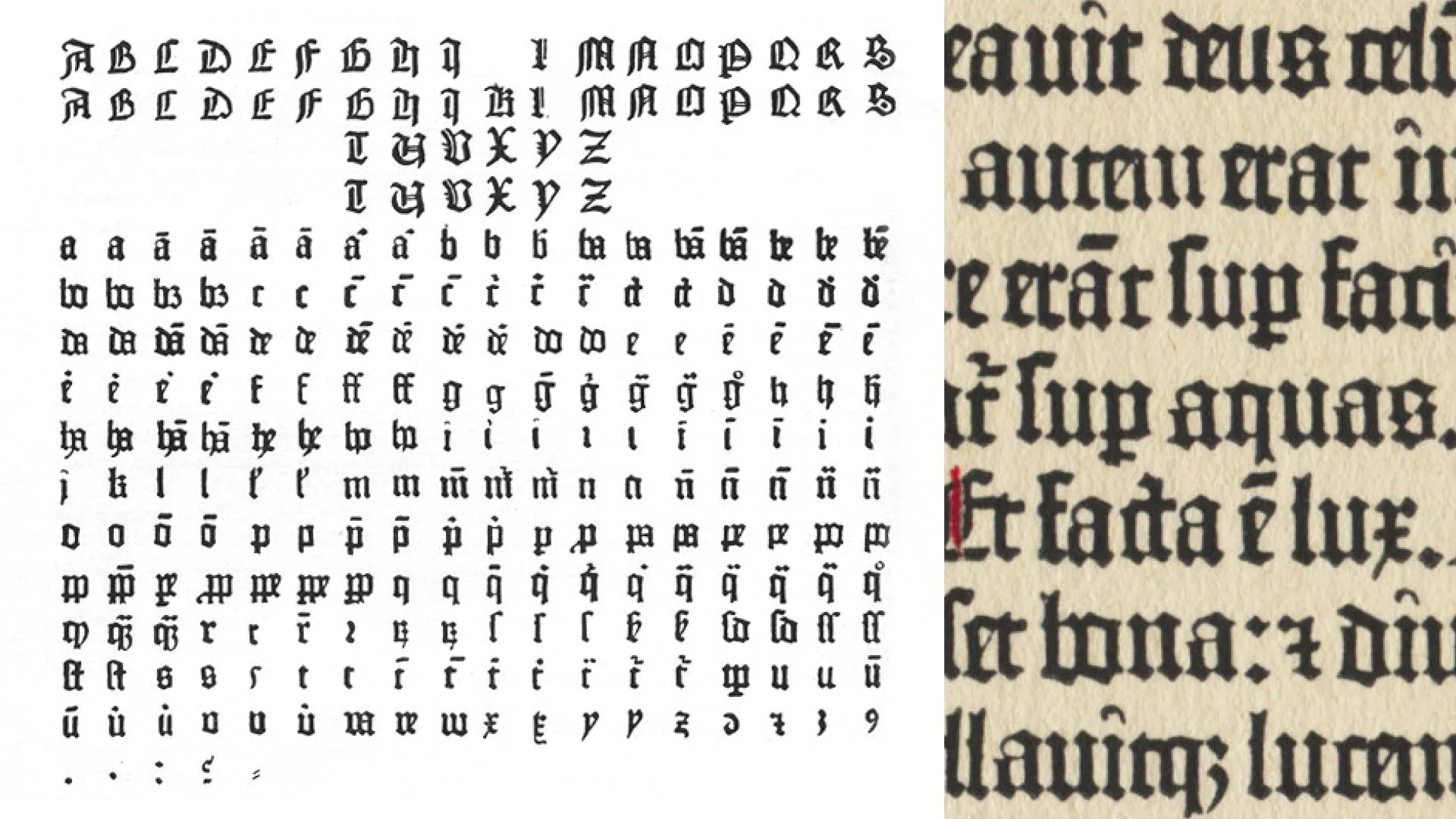 Glyphs of the 42-line Gutenberg-Bible (composed by Gottfried Zedler, 1929), and its printing at right.
