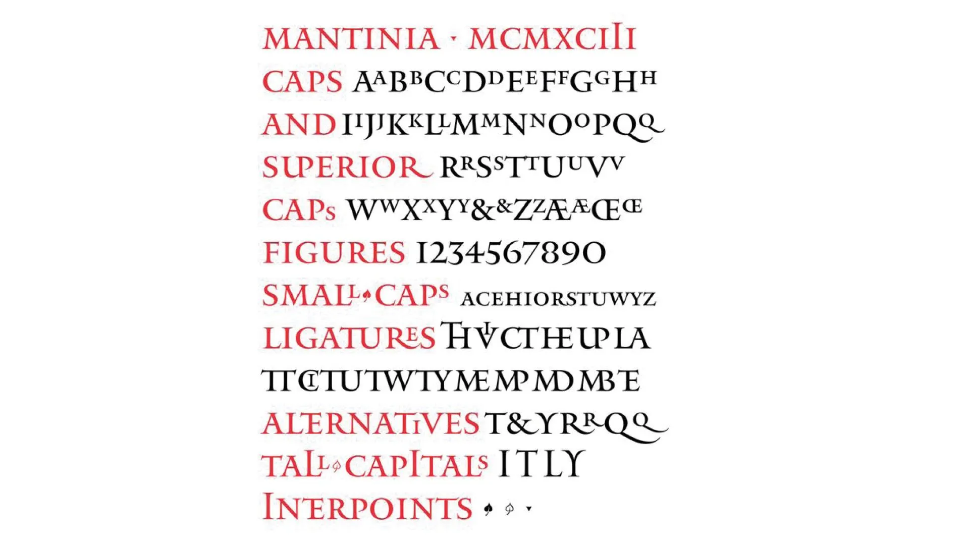 Matthew Carter (1937-) is one of a handful of type designers whose work crosses techniques and computer standards. After his apprenticeship at the Enschedé foundry, he began engraving punches. He went on to design typefaces for Linotype, then phototypesetting, and finally the computer. In 1993, Carter began designing Mantinia, a typeface inspired by Renaissance lapidary engraving, available only in capital letters. However, intended to be married with Galliard (1978), Carter exploited his epigraphic sources and included an extended set of typefaces. A few taller capitals coexist with a vast set of 16 ligatures, as well as superscript letters allowing the creation of ligatures in the counterform of the L. Initially, the composition of a text with ligatures is done by manually substituting the group of characters with the corresponding ligature. A printed manual lists the ligatures and their corresponding keyboard shortcuts. The more ingenious will use search-and-replace functions to automate the operation without errors. Subsequently, the software will provide a palette of glyphs to facilitate visualization of the characters available within the digital font.