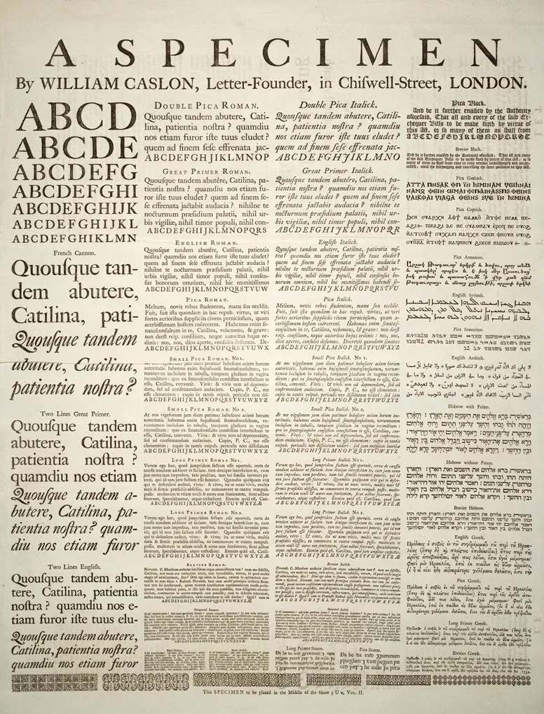 William Caslon's specimen sheet (dated 1734 but actually issued from 1738 onwards). Some of the types shown were not cut by Caslon, most notably the French Canon roman (probably cut by Joseph Moxon).