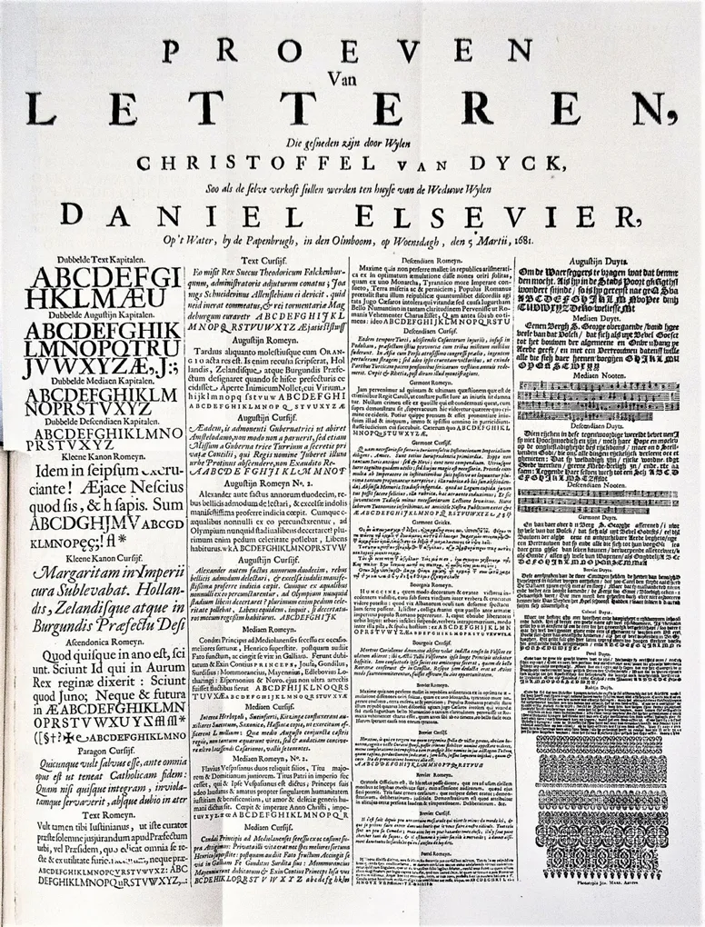 Specimen of printing types issued by the widow of Daniel Elsevier, most of the specimen showing types cut by Christoffel van Dijck (possibly some by his son Abraham), and some older types. Printed by January 1681 for the auction of the foundry, to take place on 5th March 1681, although ultimately the sale did not take place as Elsevier died before this date. Many of the types shown are by van Dijck (or possibly his short-lived son Abraham) but not all. Specifically, the type of the word "Proeven" is by van den Keere, the Dubbelde Mediaen Kapitalen, Brevier No. 2 and Augustijn No. 2 romans and Paragon, Augustijn, first Mediaen and Garmont italic by Granjon, the Dubblede Descendiaan titling capitals and Text roman by Garamond, and the Mediaen Romeyn No. 2 probably by Pierre Haultin. The Brevier italic (the showings share many but not all characters) is of uncertain attribution; it seems to be a copy of a Granjon italic, whether van Dijck or someone else cut it. The Dubbelde Text and Dubbelde Augustijn capitals may also be by other engravers.