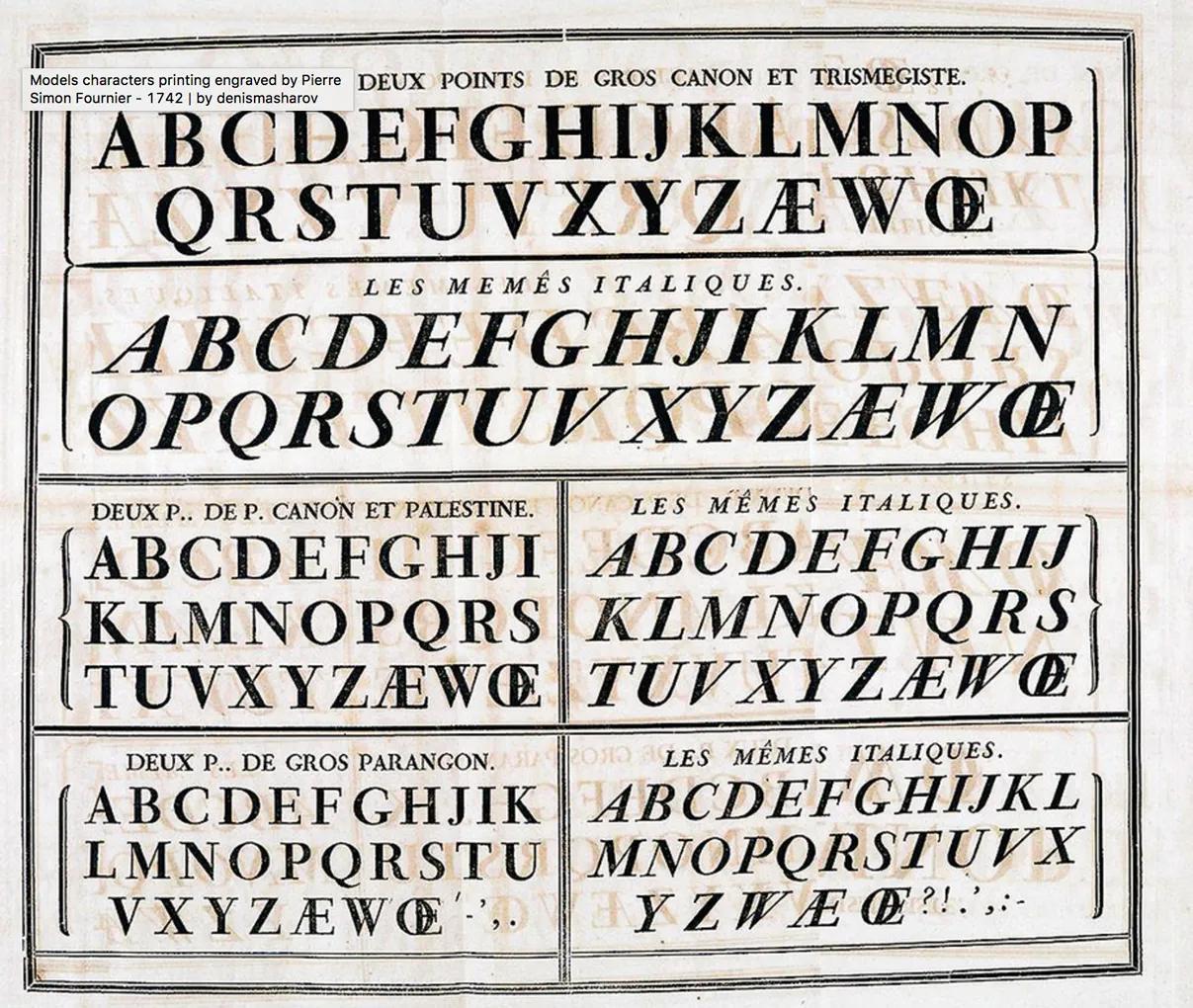 France is still one of the countries at the forefront of typographic reforms, thanks in particular to Pierre Simon Fournier le Jeune. The latter is the inventor of a measurement system corresponding to the current typographic point, but also one of the first to conceive his alphabets as a whole: the various sizes, the roman and the italic, ornate letters, but also a script, borders, vignettes and ornaments are included. The overall harmony is thought out in advance in order to design the book according to a set of appropriate tools.