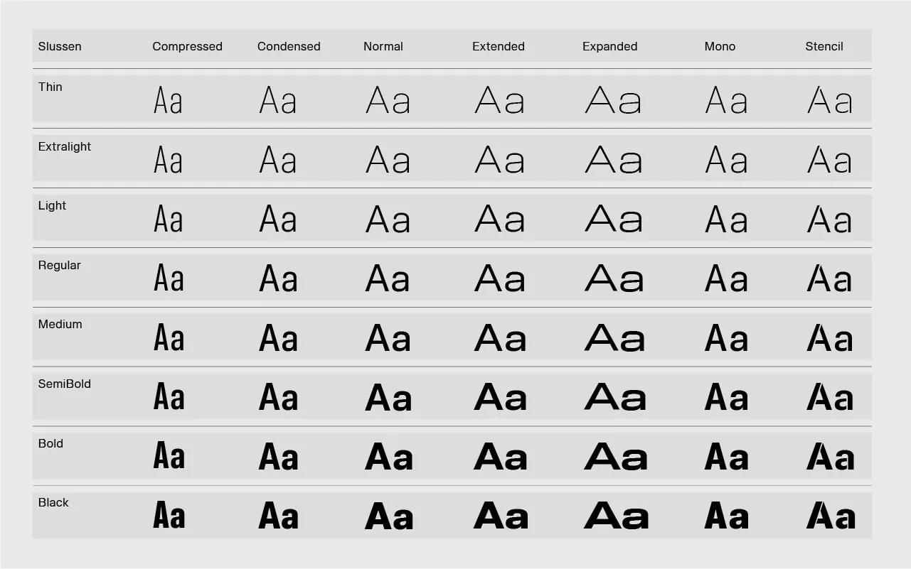I'd been wanting to draw a sans serif for a long time, and thought this was the right time to do it. Originally, Slussen had only one style: a Regular. But I had so much fun drawing it that I went on to create a Thin and a Black, to practice my weight skills. Then I thought, "Wouldn't it be cool to have a Condensed too?", so I drew a Condensed, then an Extended, then an Extra Condensed... and to balance things out, an Extra Extended.