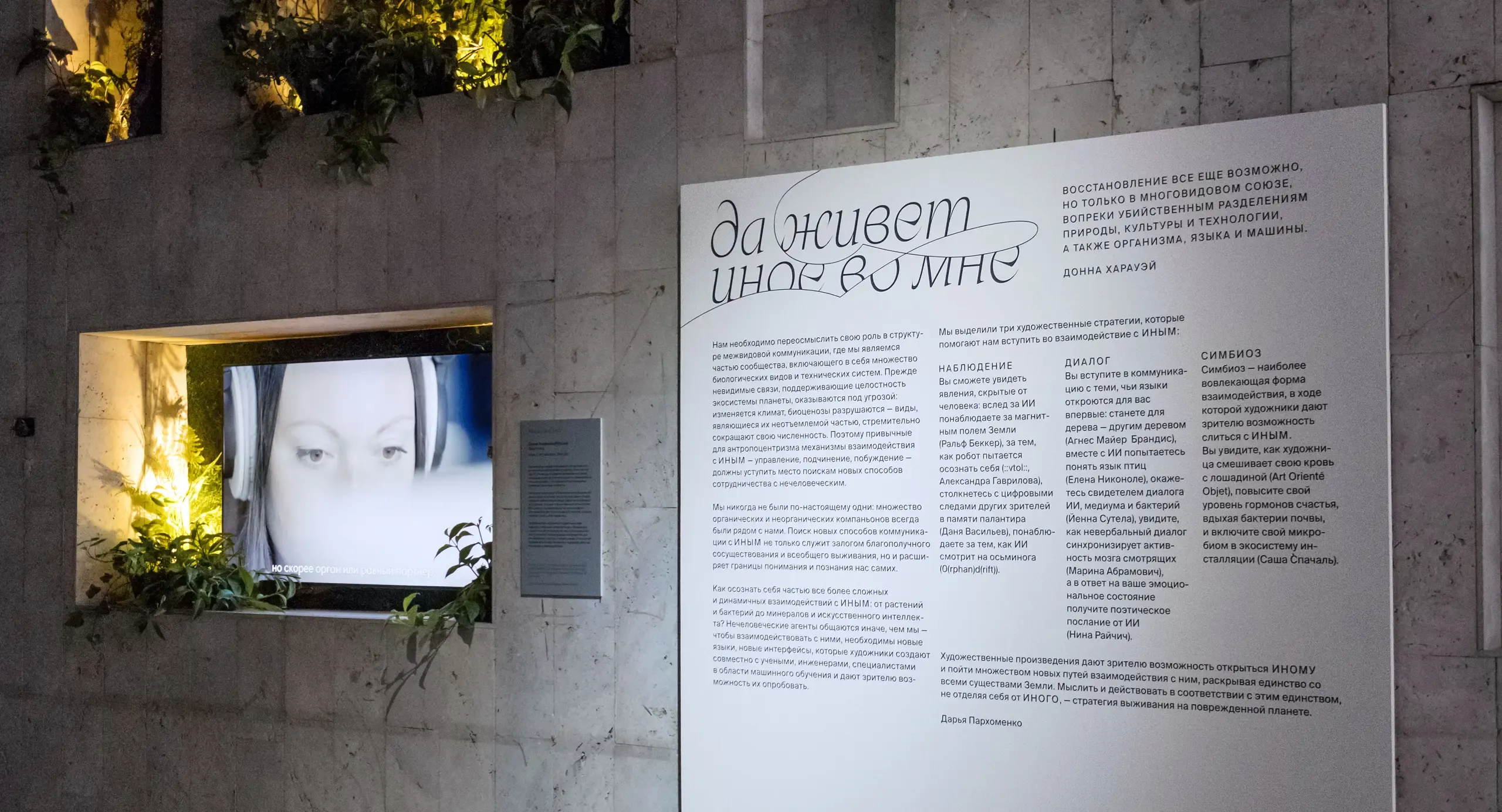 The exhibition was held at the Tretyakov Gallery in the Laboratoria Art & Science space. Among the featured artists were Marina Abramović, Ralf Baecker, Art Orienté objet, Agnes Mayer-Brandis, Saša Spačal, Jenna Sutela, Elena Nikonole, Nina Rajcic, and Danya Vasiliev.