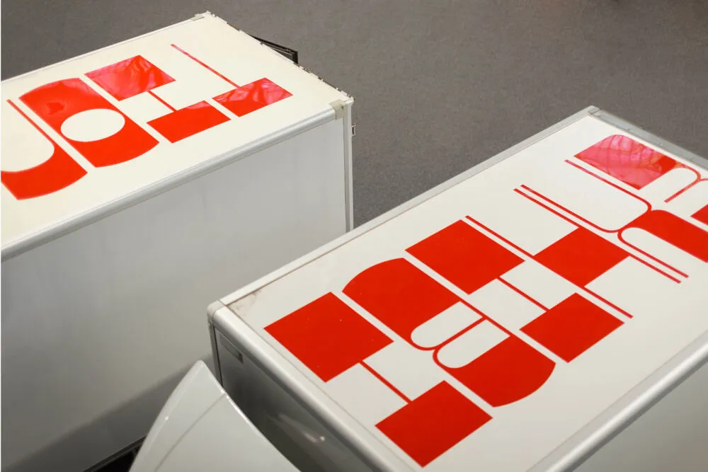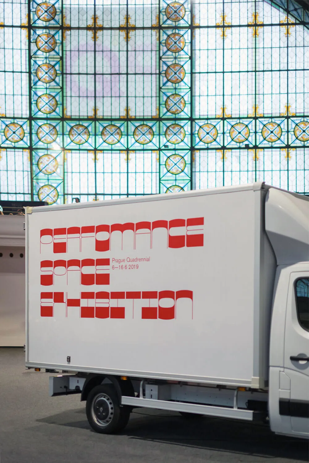 Inside, loading space is repurposed as display cabinet and cinema; on the outside, designers Matěj Činčera and Jan Kloss left no possibility unused to brand the vehicles with vibrant red typography. From the installation art itself and the type on the roof to number plates and the obligatory Wondertree air freshener: the high contrast Zoo (designed by Quentin Coulombier and available from Blaze Type) is used throughout. Its offbeat shapes are counterbalanced by straightforward typography with programme information, using Akzidenz-Grotesk.