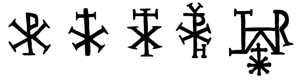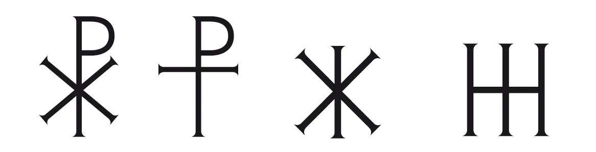 The four Christian monograms, from left to right: chi-rho, tau-rho, iota-chi, iota-eta