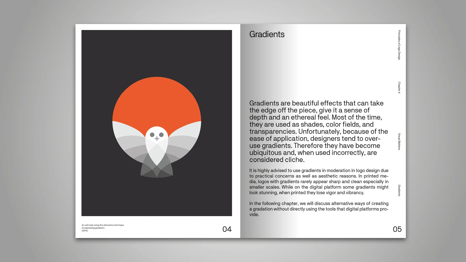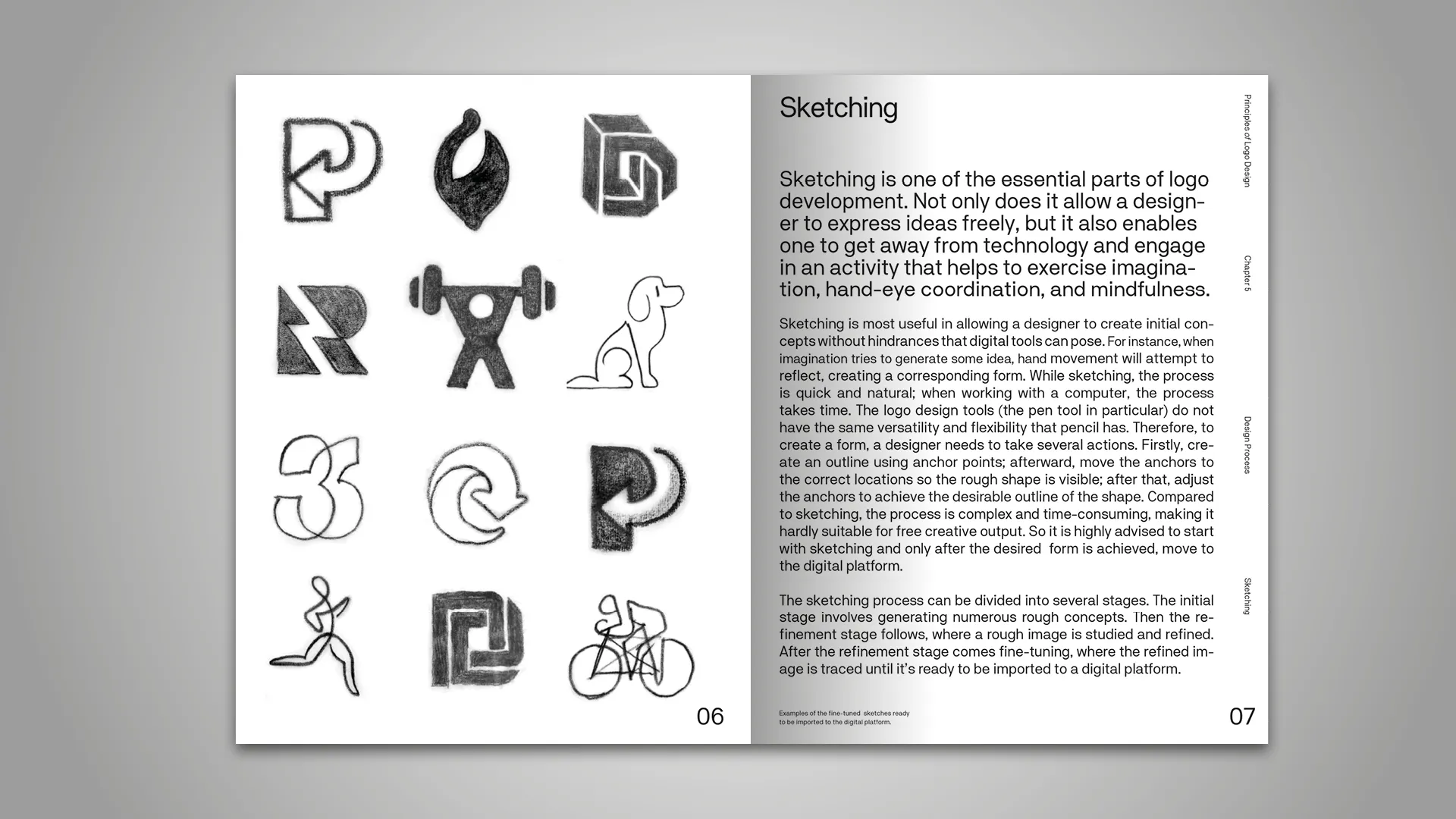 This section takes up just over half the book, and without going into detail, it is an excellent introduction to both creative and formal aspects (gradients, volume, negative spaces, etc.), as well as pragmatic aspects (size, legibility, composition, customer relations, etc.). Separating these two entities would be tantamount to believing that doing and knowing are distinct, whereas they are intertwined throughout the process.