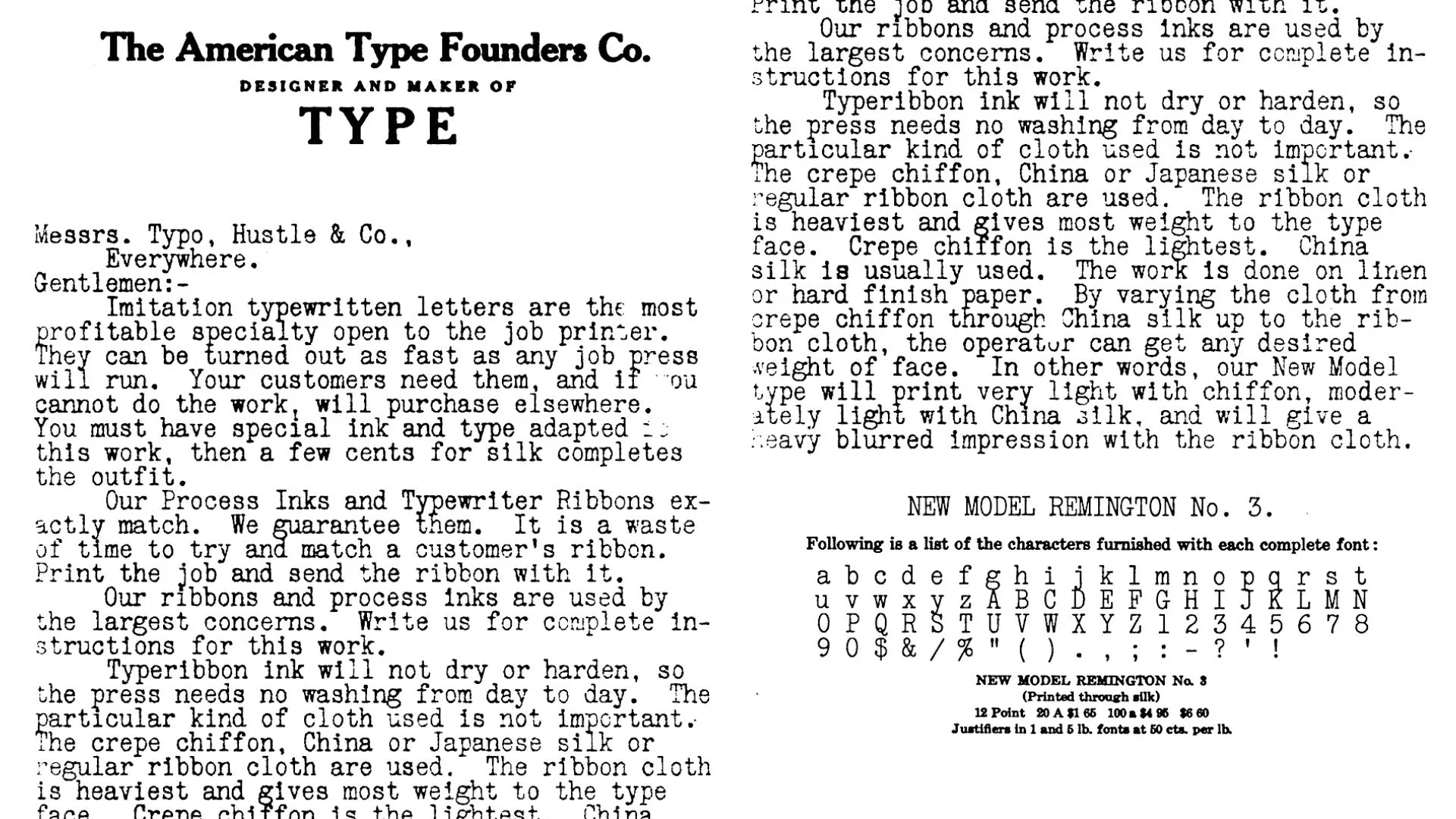 Yet in 1906, the American Type Founder Association published the New Model Remington n°3 after the name of the famous American firm. At the 12-point scale, the typeface's morphology becomes telling: the whole is inspired by a didone with uniform grease; the capitals appear condensed, and the serifs adjust to the free space around the letter. Not surprisingly, this typographic style with long, filiform serifs was also inspired by certain Victorian typefaces found on labels and commercial letterheads. The ingenious inventor of the typewriter may have found here a model for a narrow typeface that could simply be retouched on certain glyphs to obtain a graphic solution adapted to technical constraints.