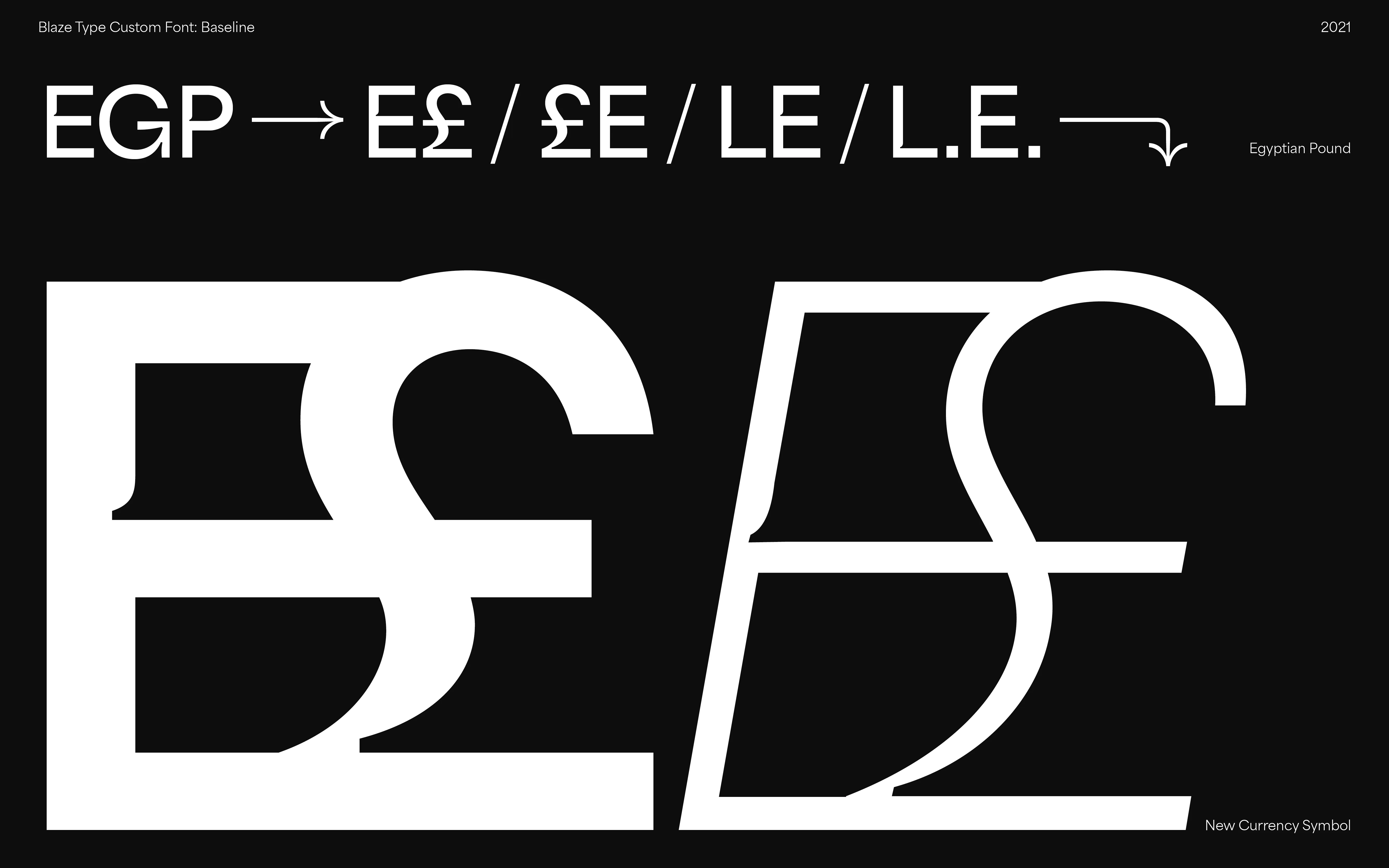 One of the most thrilling part of this project was to work on a full new design concept for the EGP currency. As it is commonly used it is shown as such: EGP or E£ or £E. The idea to turn these glyphs into a full ligature hit us in an instant and we worked on several associations before finding one which would be fit both the whole font's design and remain legibile for day to day users and readers.