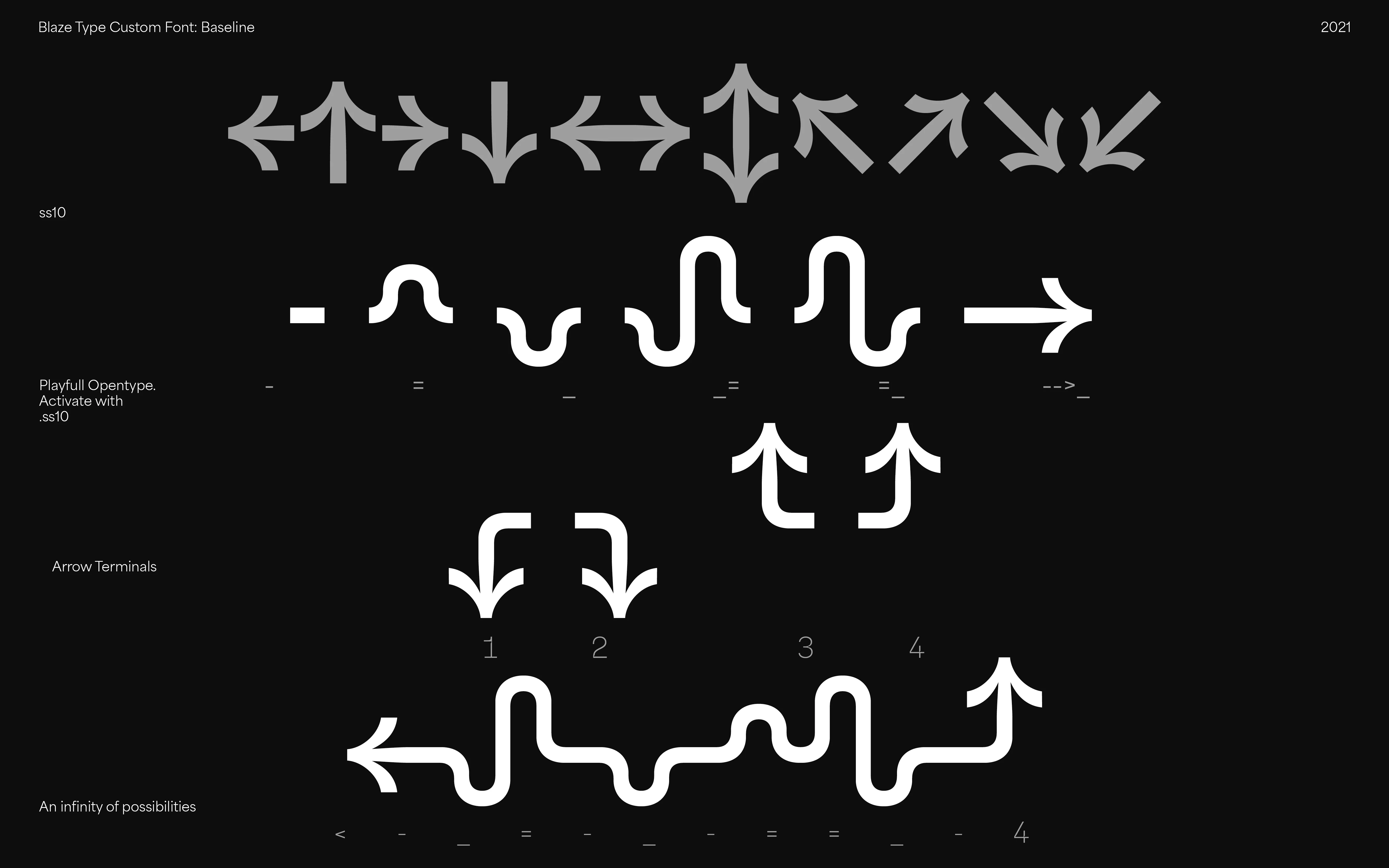 The font contains a wide variety of alternates to allow the brand to easily access different design fetures. Along their general typographic glyphs need, the brand would need production icons, a fresh new set of regular arrows and more playful ones, new ampersands and size guidelines.