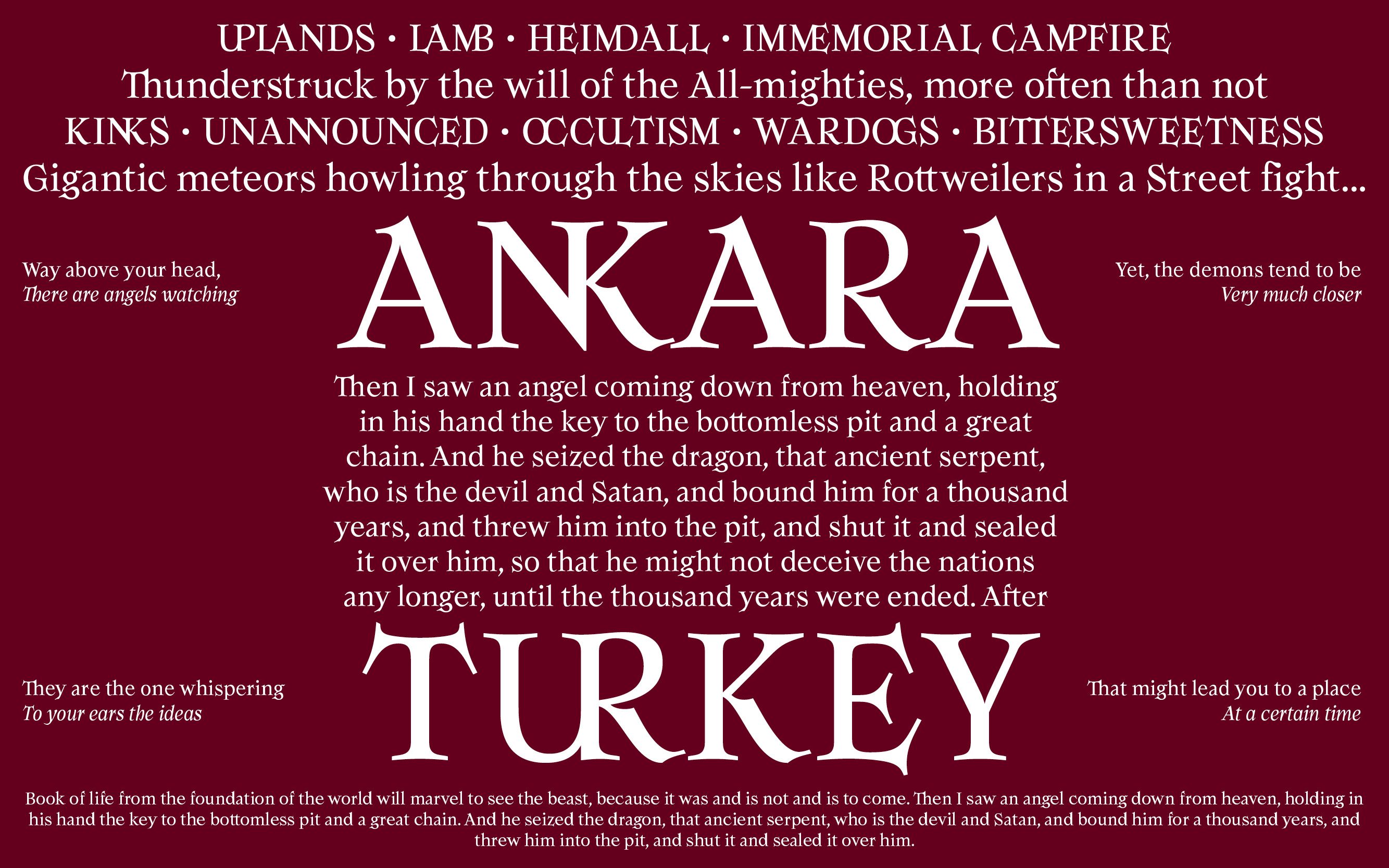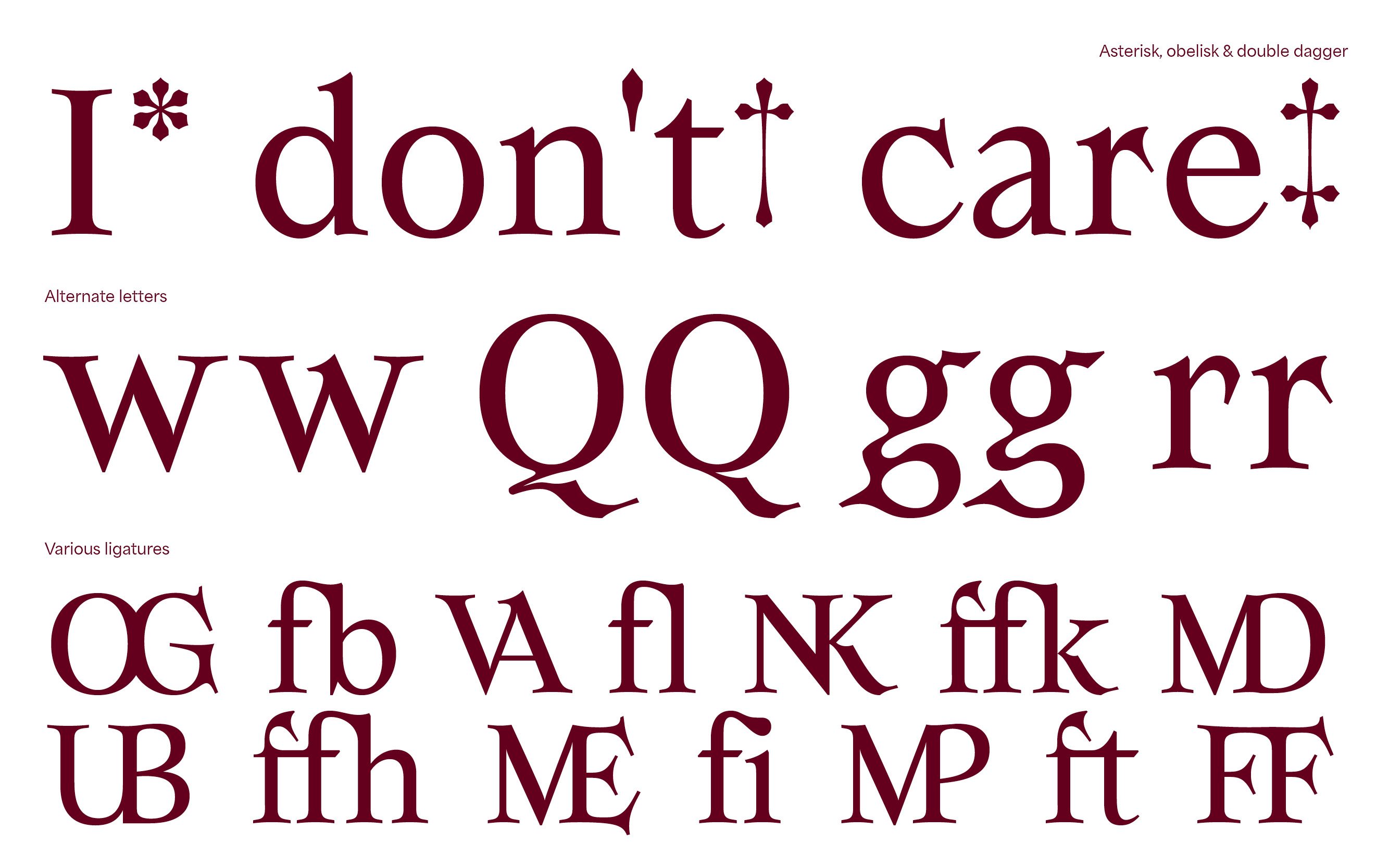 This 20th century serif font has numerous alternates and ligatures, making it a sharp tool allowing more experimentation in any kind of design project. The old fashioned print style give Armag an almost biblical appearance, represented by the evilness of its horned letterform. We are also working on expanding the Armag font-family with various weights, widths and, of course, alternates & ligatures.