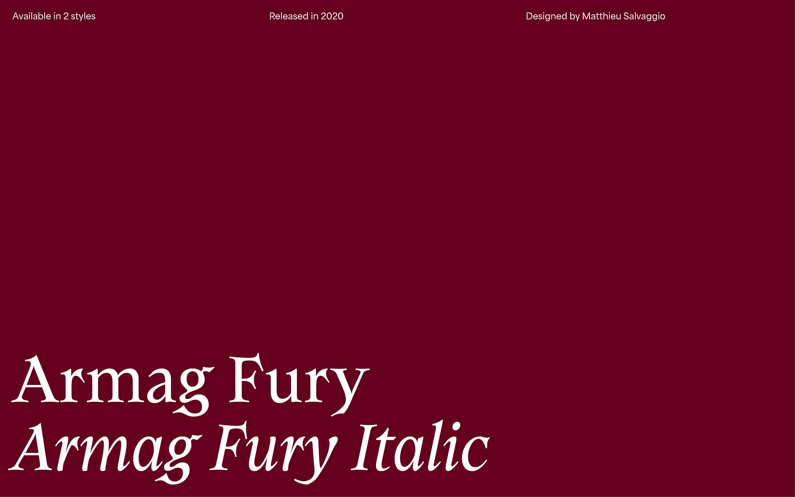 Inspired by early 20th century hand drawing, Armag is a family of two fonts (Fury & Fury Italic) with aggressive and evilish looking endings and, yet, generous organic shapes.