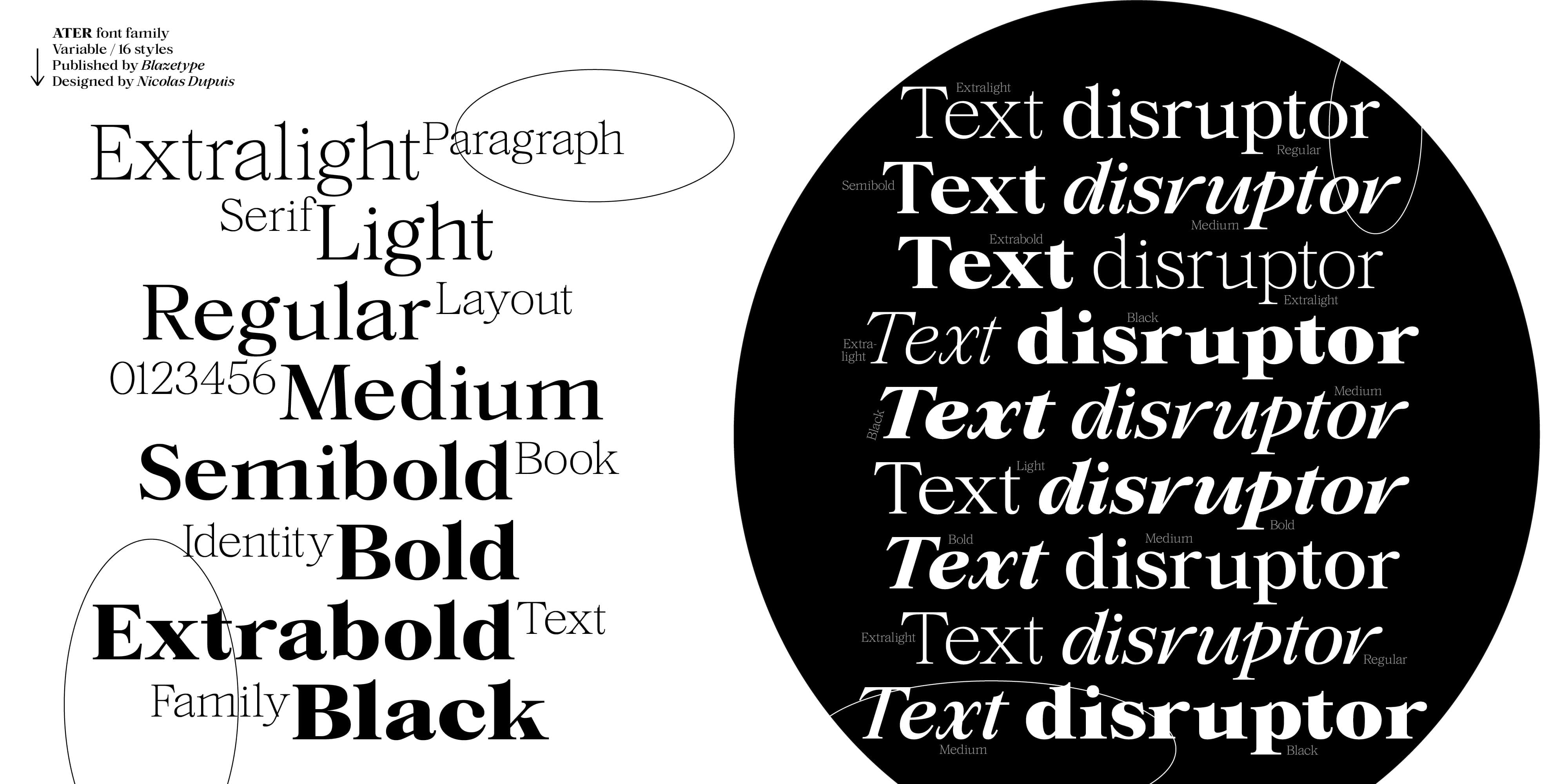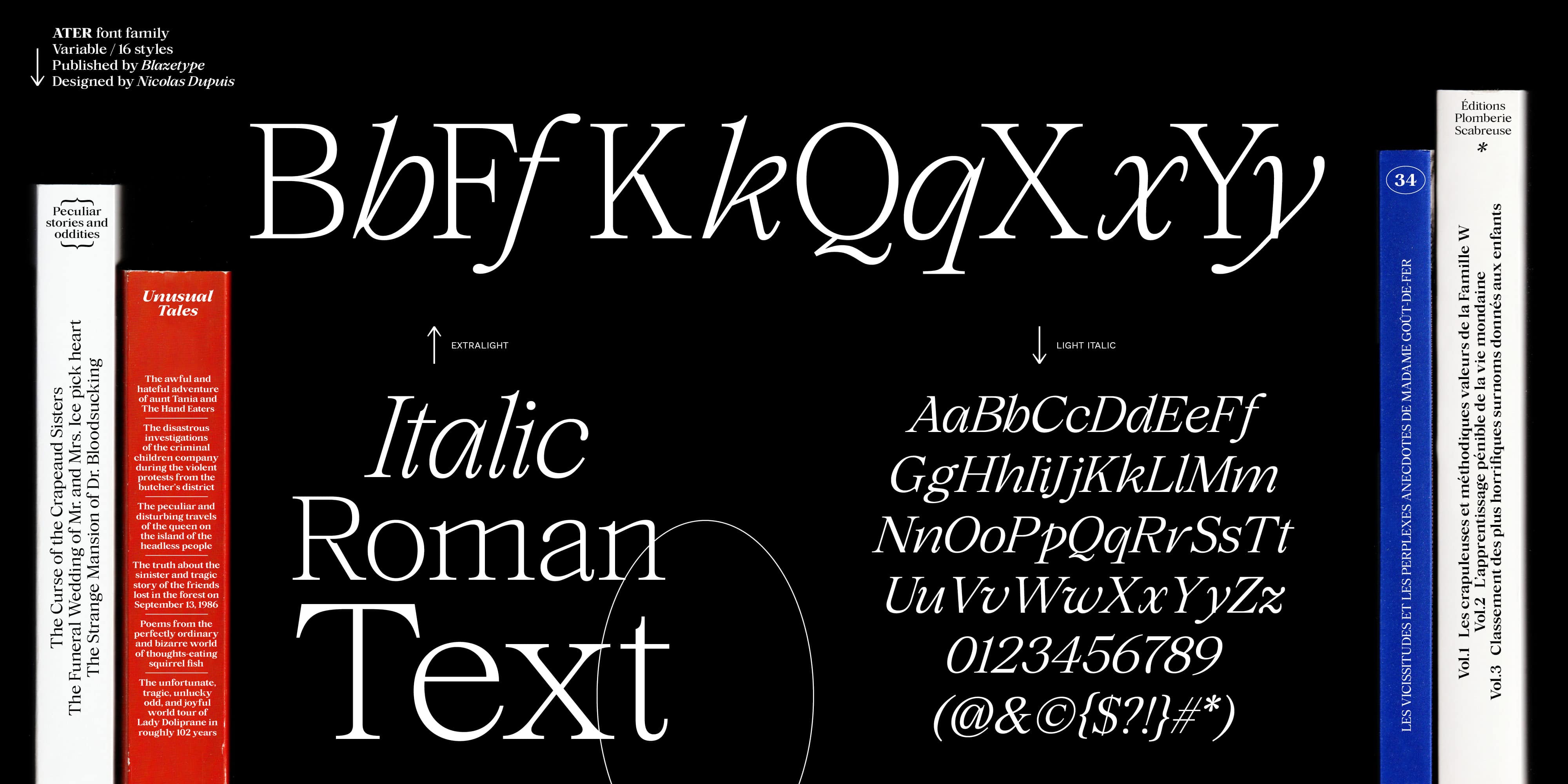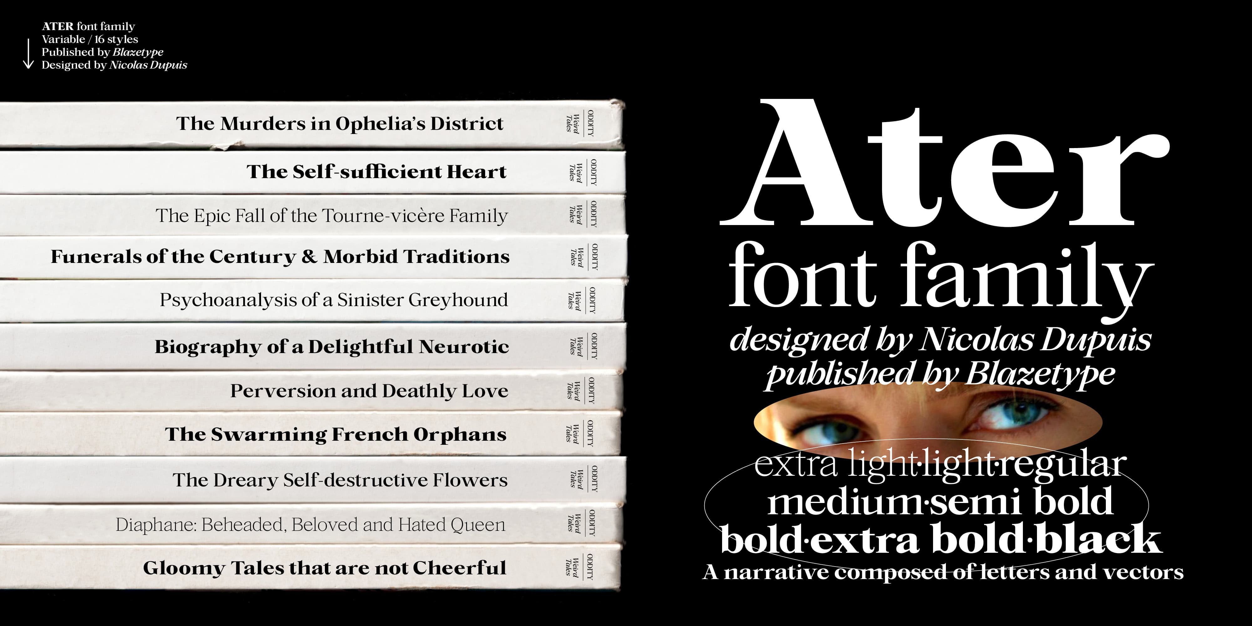 The Ater family was designed with the intention of being used for text editing and also display applications. Whether on a large poster or in a pocket book, the family can adapt to any format. An elegant family which borrows from classic serif typefaces as well as more contemporary forms. In a spirit of bringing together as many different mediums as possible with unity in the shapes. It is a variable typeface with a letter blackening approach, sometimes to the point of appearing in a display-style. The typeface plays with this ambiguity between classic and display shapes thanks to the great contrasts between the finest and darkest styles. This opens up a multitude of possibilities. From Extra light to Black, it goes to the extreme for optimal legibility in both small and large sizes. The word Ater in latin means “matte black,” a fitting name for a family that does not hesitate to fill a white page.