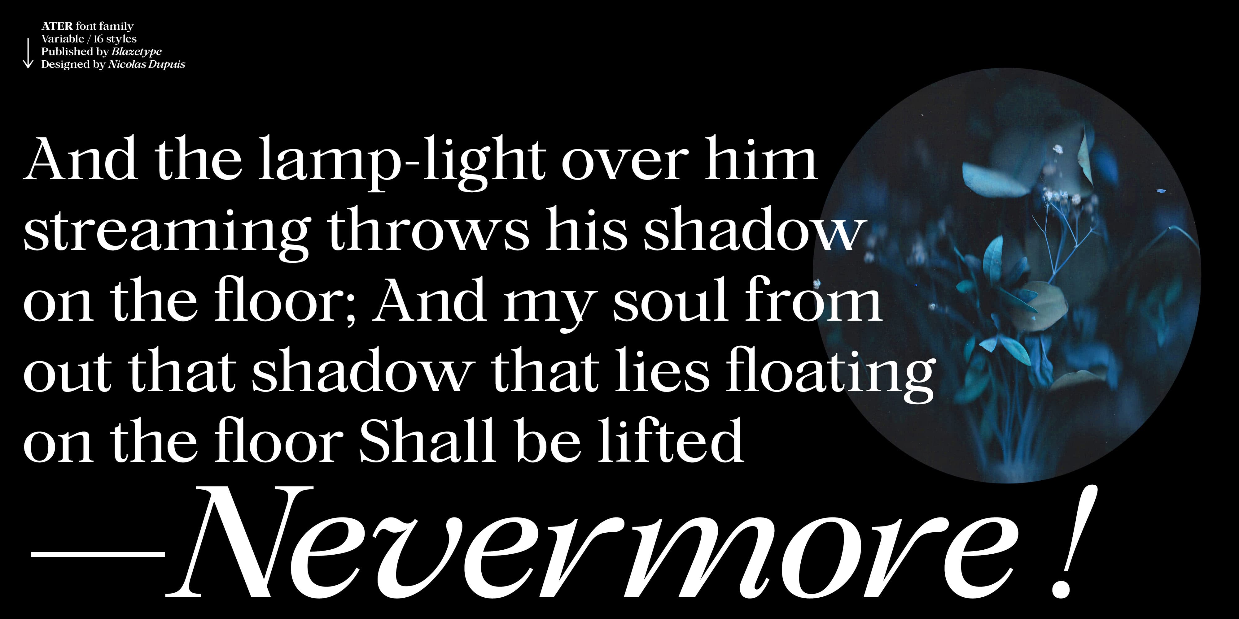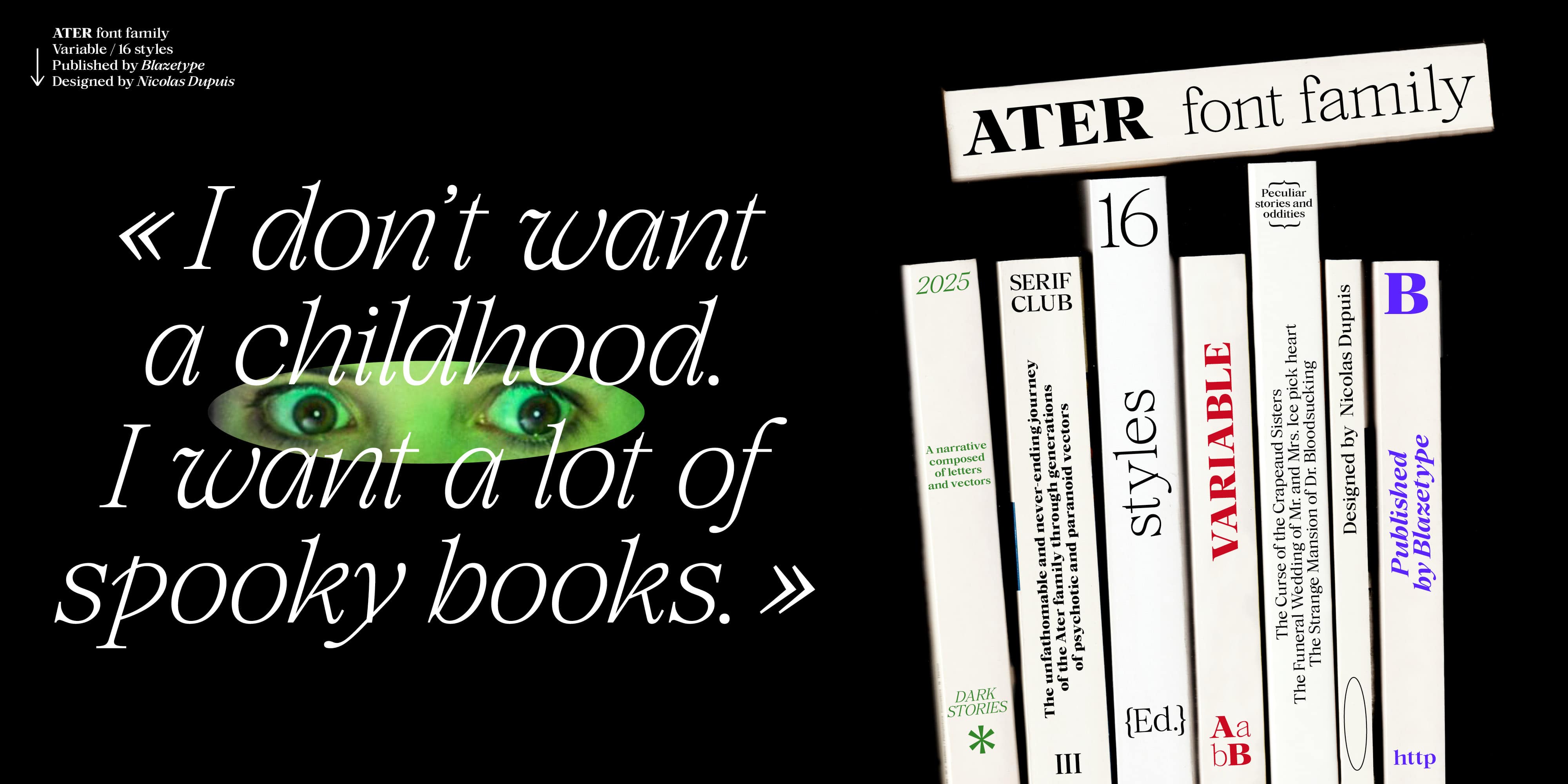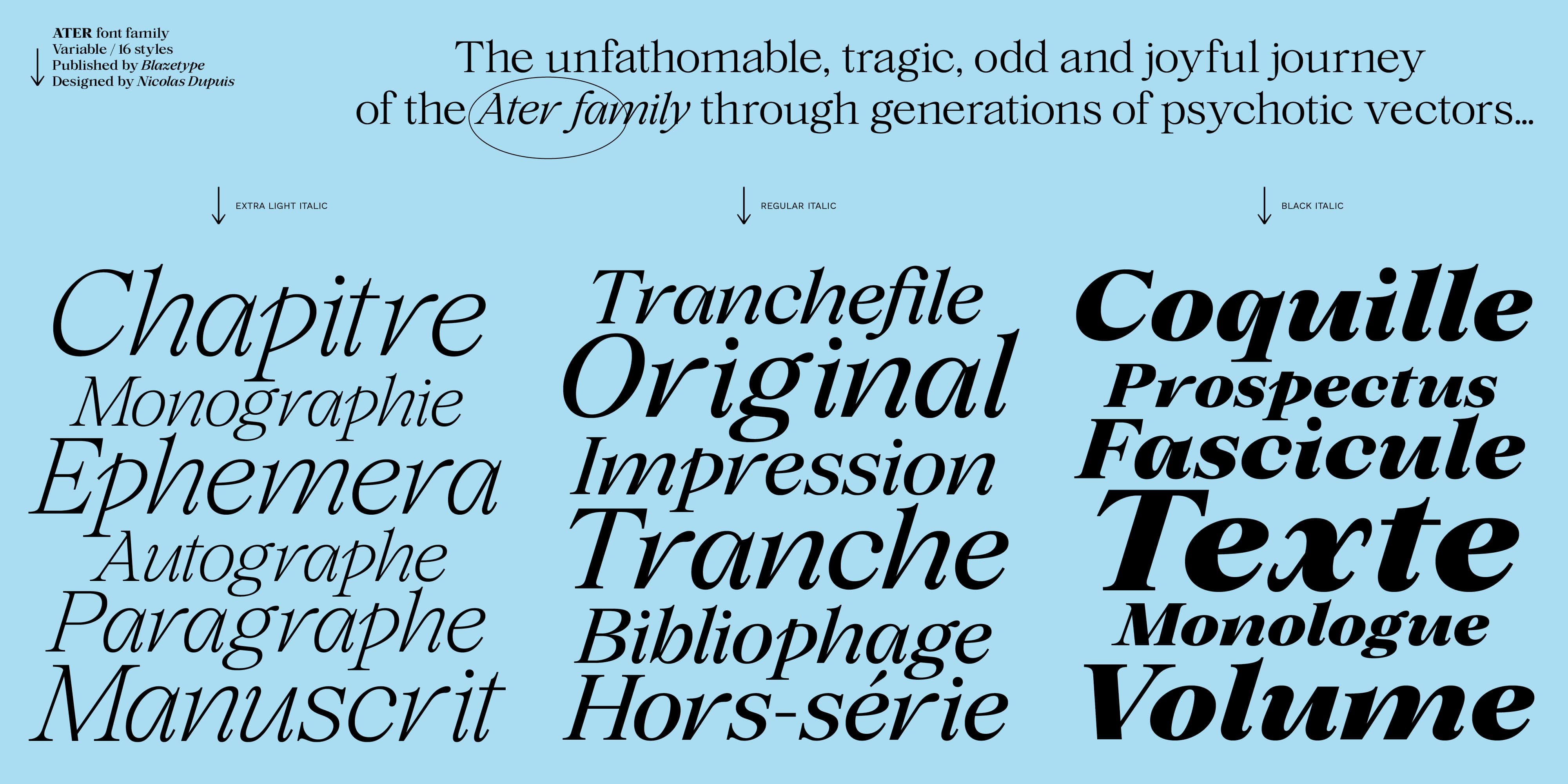 The Ater family was designed with the intention of being used for text editing and also display applications. Whether on a large poster or in a pocket book, the family can adapt to any format. An elegant family which borrows from classic serif typefaces as well as more contemporary forms. In a spirit of bringing together as many different mediums as possible with unity in the shapes. It is a variable typeface with a letter blackening approach, sometimes to the point of appearing in a display-style. The typeface plays with this ambiguity between classic and display shapes thanks to the great contrasts between the finest and darkest styles. This opens up a multitude of possibilities. From Extra light to Black, it goes to the extreme for optimal legibility in both small and large sizes. The word Ater in latin means “matte black,” a fitting name for a family that does not hesitate to fill a white page.