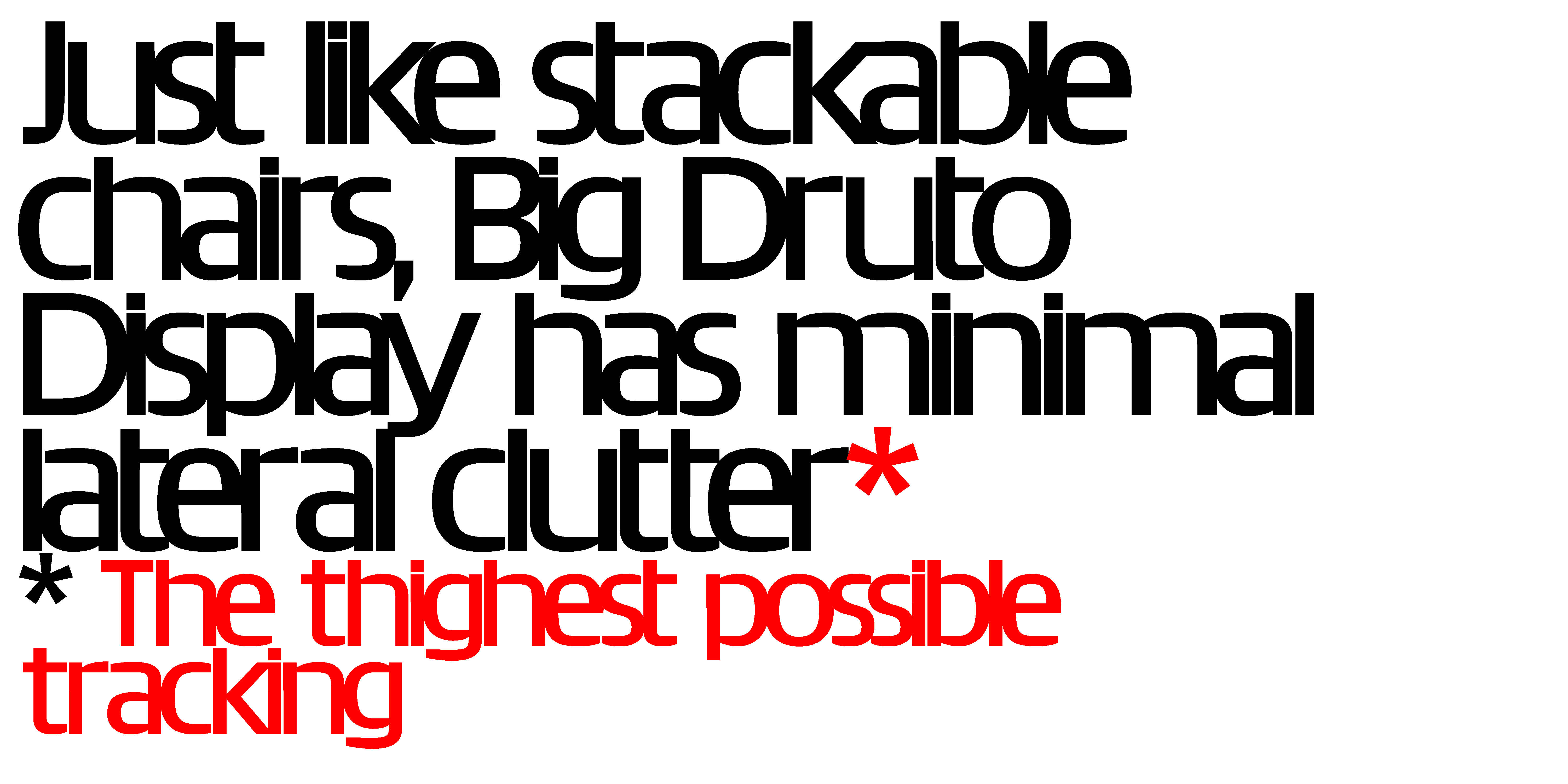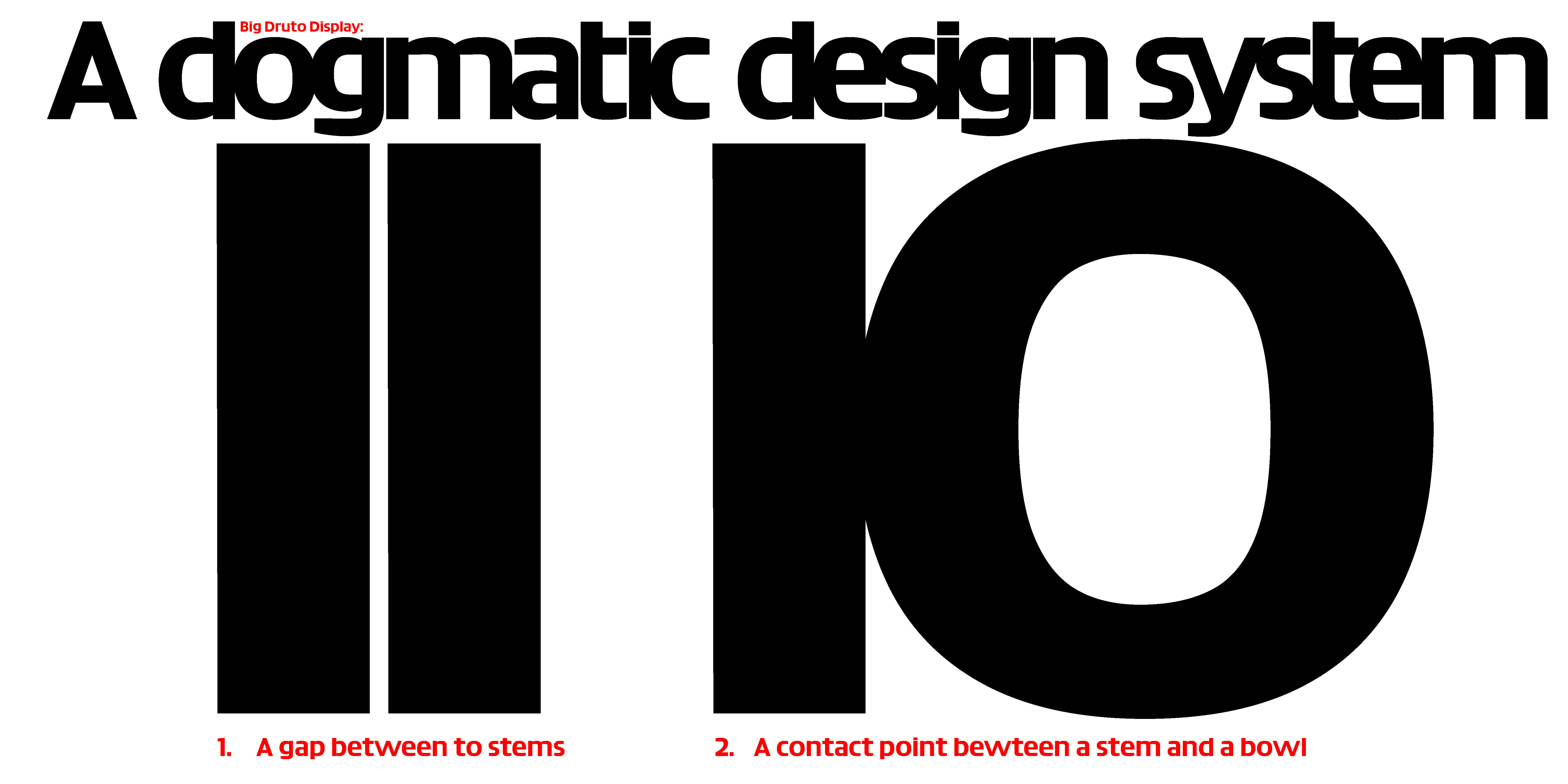 Big Druto Display is for even larger sizes, with still less white spaces remaining. So much so, that it is designed with negative tracking. Each glyph is designed, each terminal and each bowl is cut on the nose to create a uniform pattern of gaps and overlap. An elegant and systematic use of negative tracking, which cannot be achieved with tracking with an off-the-shelf font. Big Druto Display, although being of very low contrast, also brings contrast back. Negatives spaces become thin lines and start playing the role of high contrast, giving a subtle display quality.