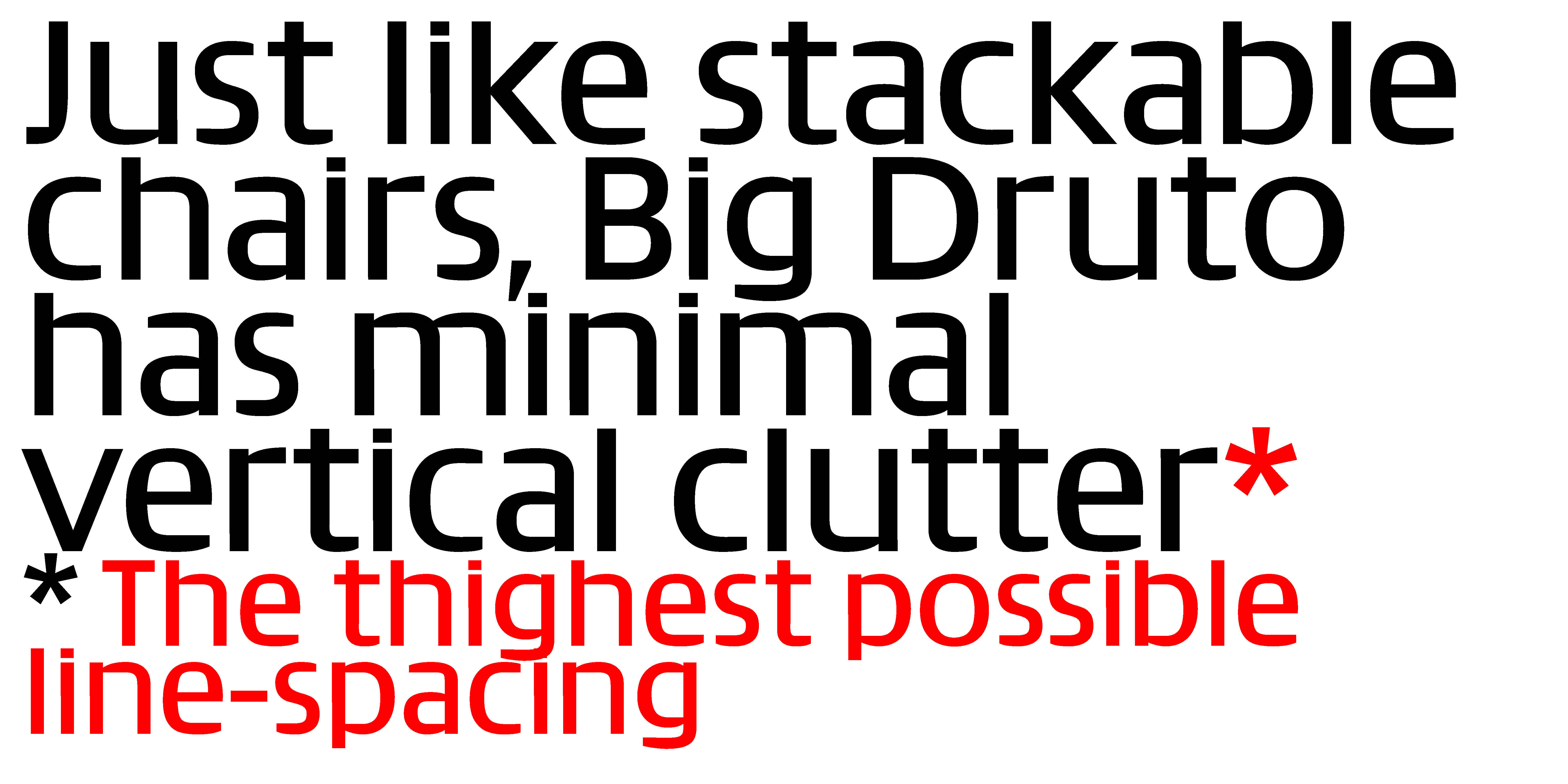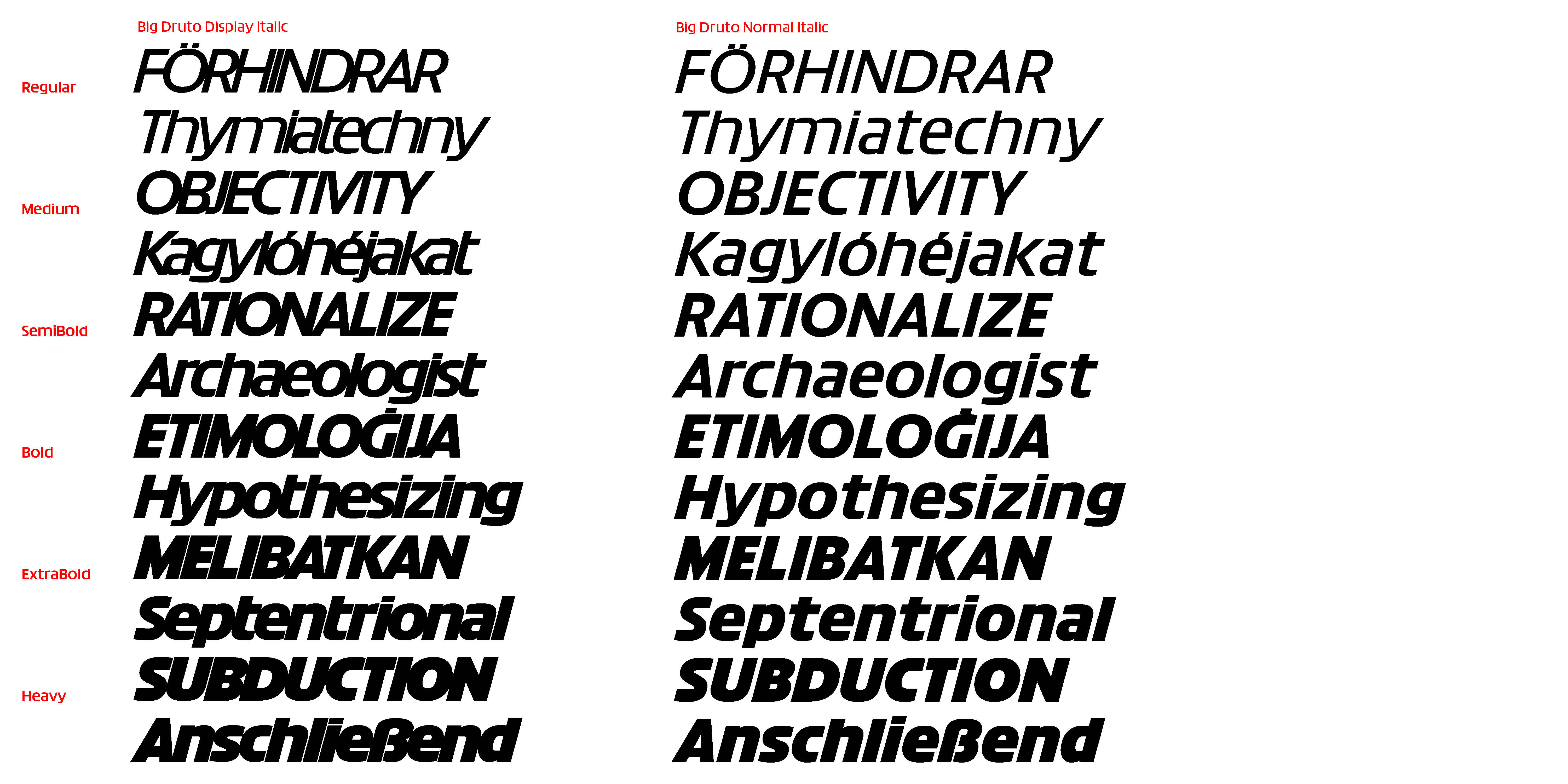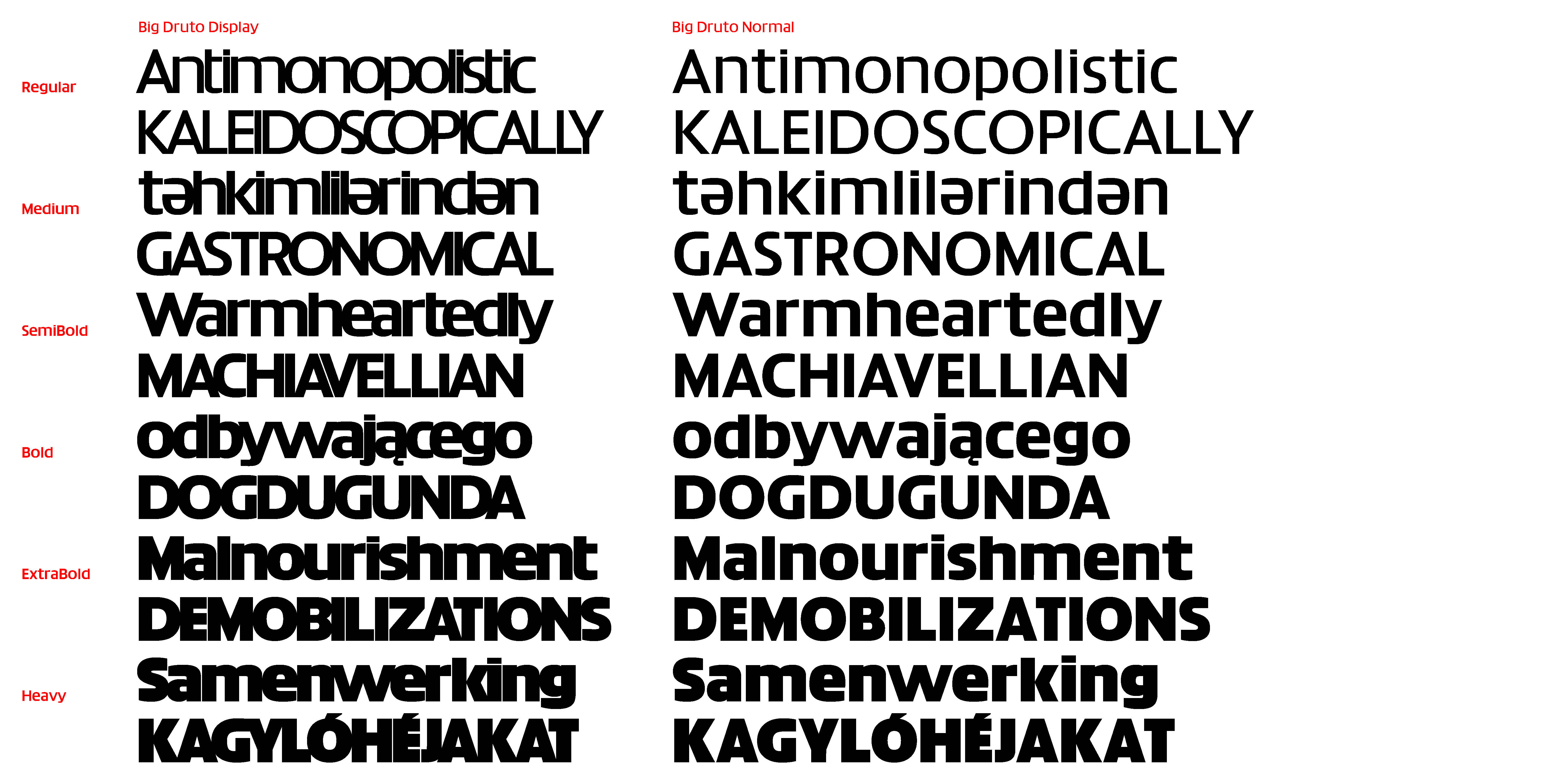 While Druto reflects on density in text, Big Druto pushes things further, as to become a study of density in larger sizes. It addresses white space in large titles as an issue. Big Druto has a bigger still x-height than Druto, which allows for minimal leading. It has squarish shapes, with less humanistic swing, that give an impression of fullness in text. Its diacritics are attached. It is overall made to look strong in large sizes, with low contrast and barely any descenders, while still remaining legible in smaller sizes.