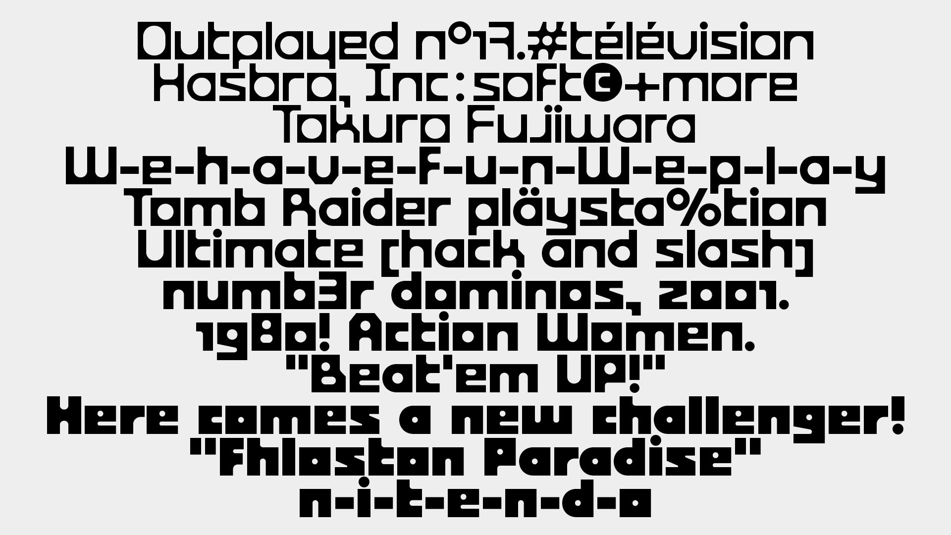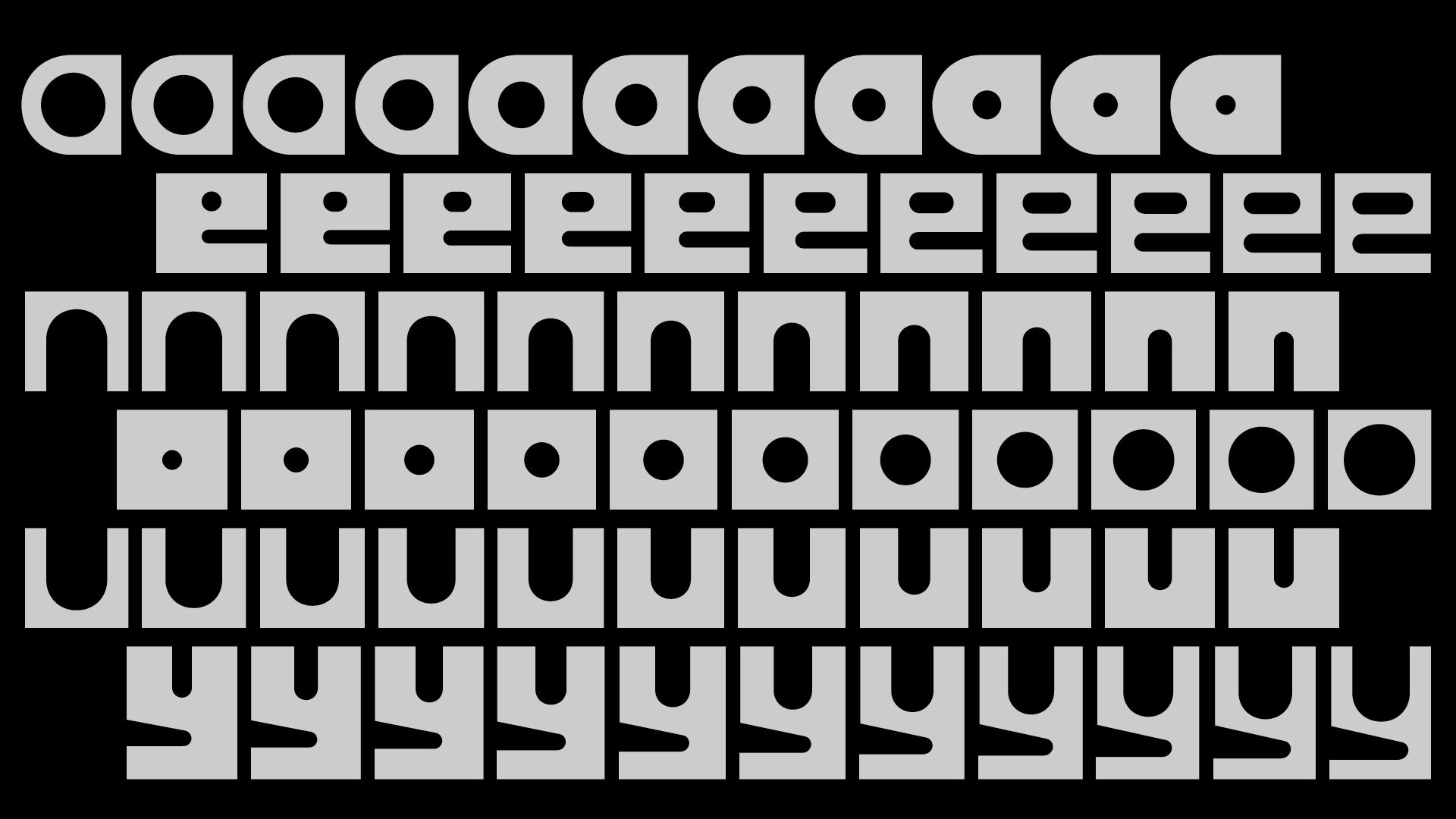 Built from a simple geometric formal repertoire, Bonto is an expressive display typeface that comes in four styles. Directly inspired by our childhood games, the idea of this typeface was to create the most expressive typeface with the most simple shapes. Like lego or puzzle games, the letters come together in a contrasting combination of right angles and roundness. Bonto is designed to encourage play and experimentation through typographic composition. Several alternative glyphs can help the designer find the right combination. The alternative glyphs "e", "s" and "z" behave like descenders passing under the baseline, allowing for variations in the reading rhythm. In its black style, Bonto can be similar to a domino game, while the regular brings out the contrast of the round counter-forms. Bonto is best used large and playful, perfect for creating impactful and user-friendly designs
