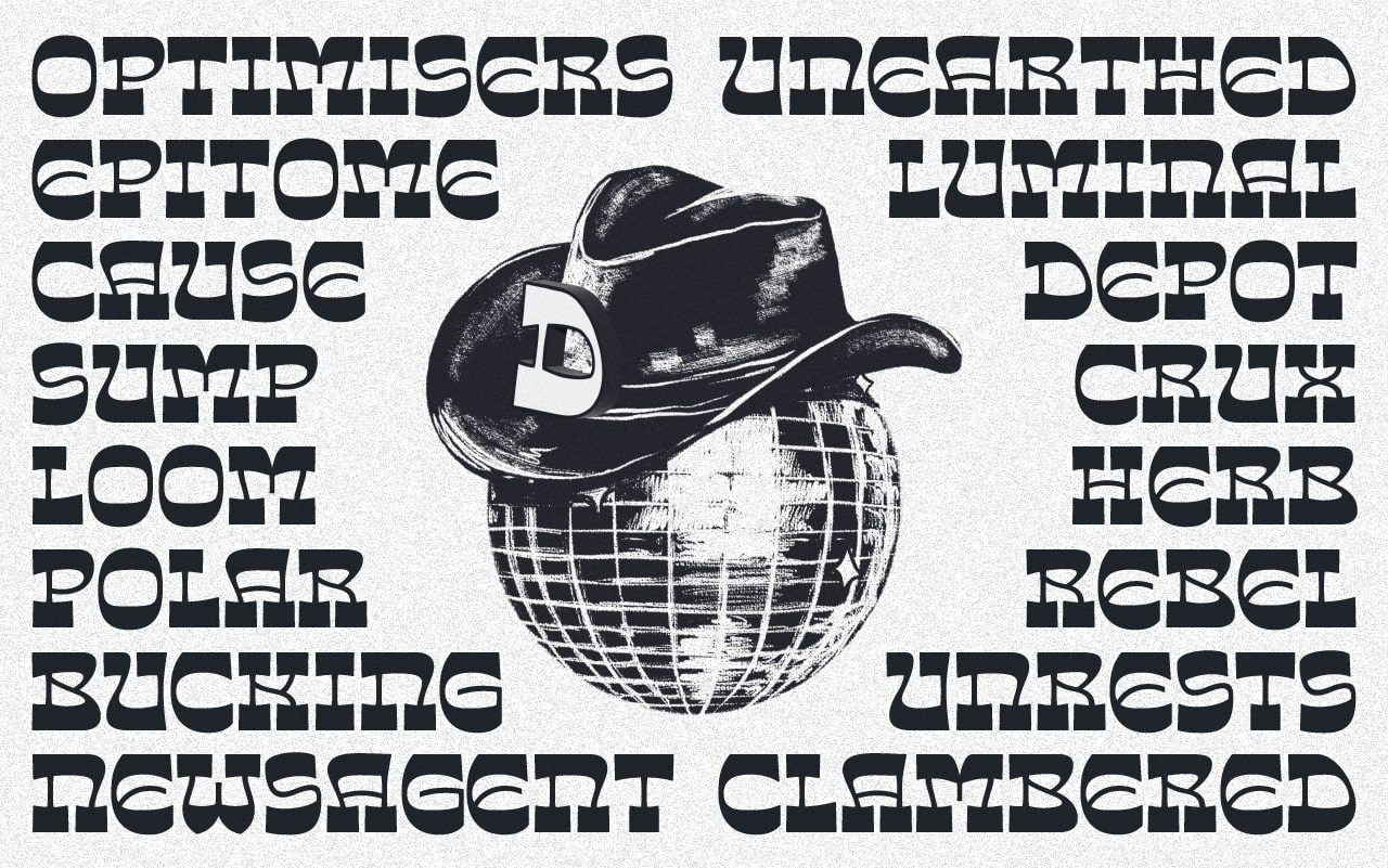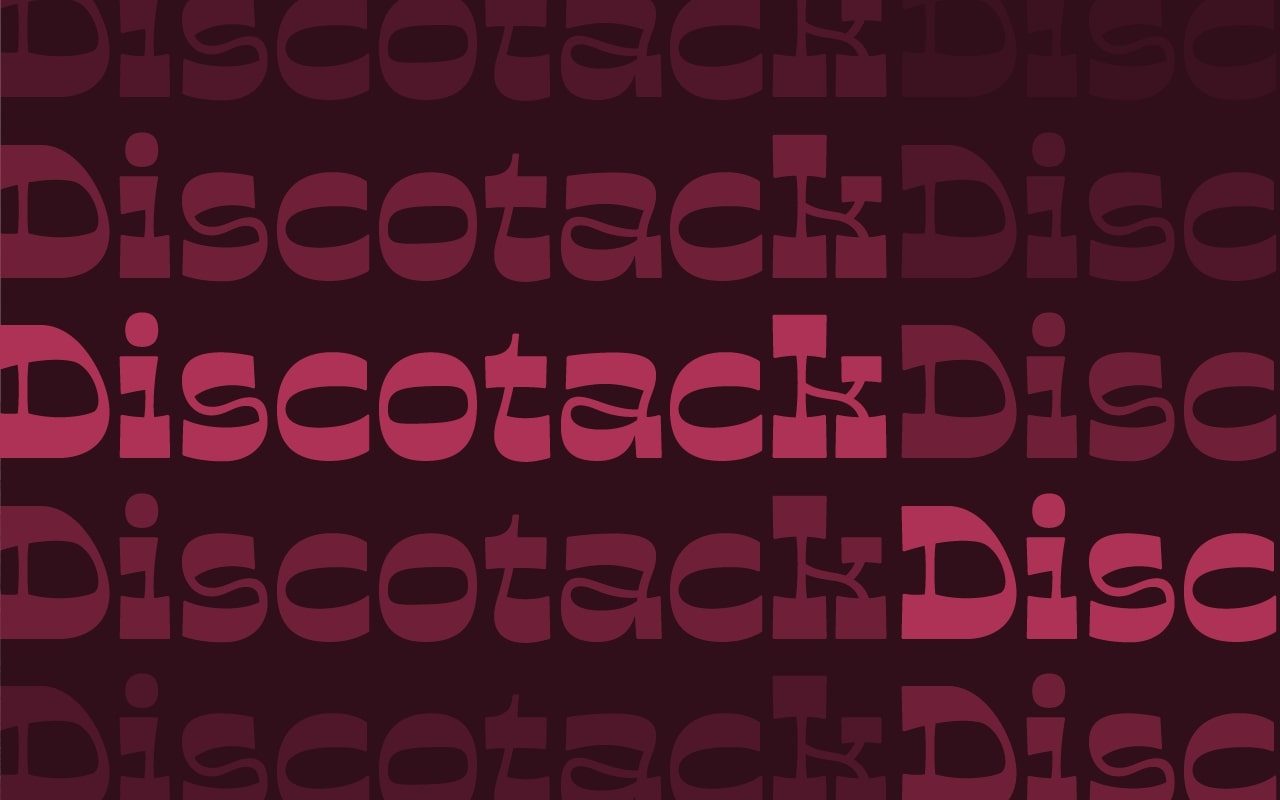Discotack is a mixture of Art nouveau and desert disco. It's a reverse contrast slab serif with organic, flowing strokes and a load of personality. Initially inspired by the uppercase forms of Benguiat’s Discotheque (1967), the font takes an off-kilter approach to a genre typically marked by straight lines and angles. Set it in all caps for a (mostly) flat top and bottom to your lines of text, or add in the lowercase to introduce a playful wavy texture to your type. Discotack is perfect for headlines and logos.