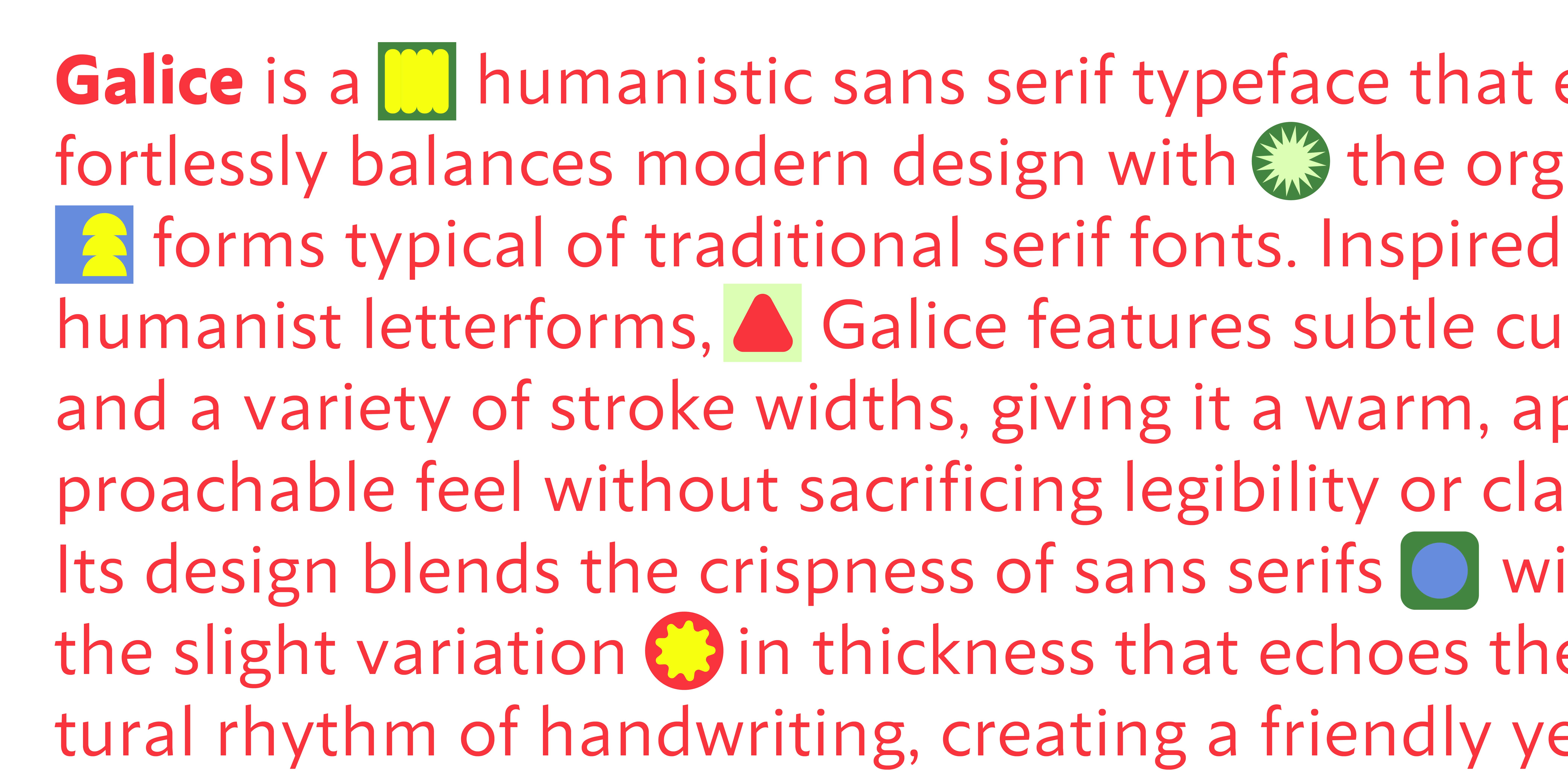 Galice is a humanistic sans serif typeface that effortlessly balances modern design with the organic forms typical of traditional serif fonts. Inspired by humanist letterforms, Galice features subtle curves and a variety of stroke widths, giving it a warm, approachable feel without sacrificing legibility or clarity. Its design blends the crispness of sans serifs with the slight variation in thickness that echoes the natural rhythm of handwriting, creating a friendly yet professional appearance.