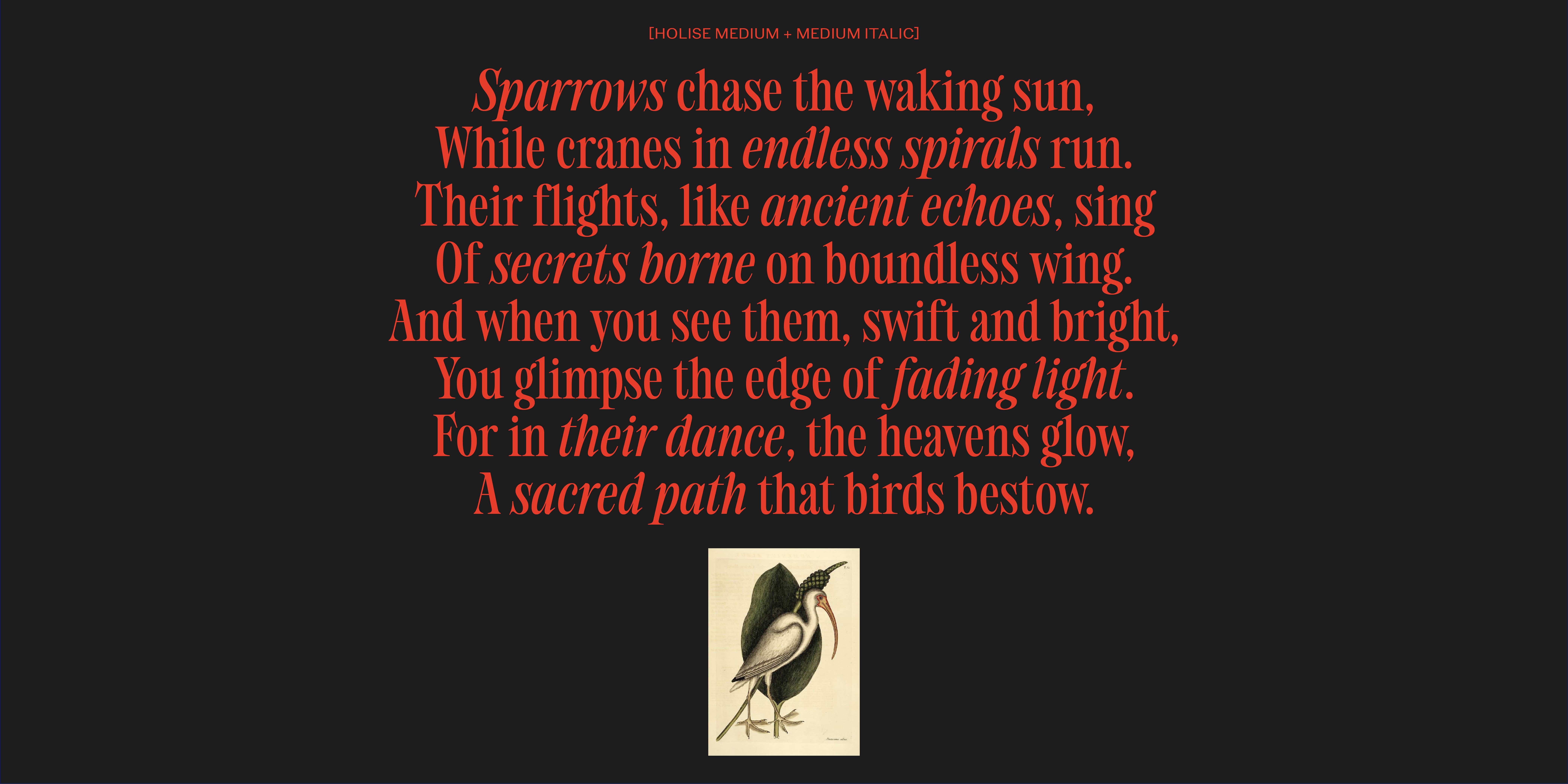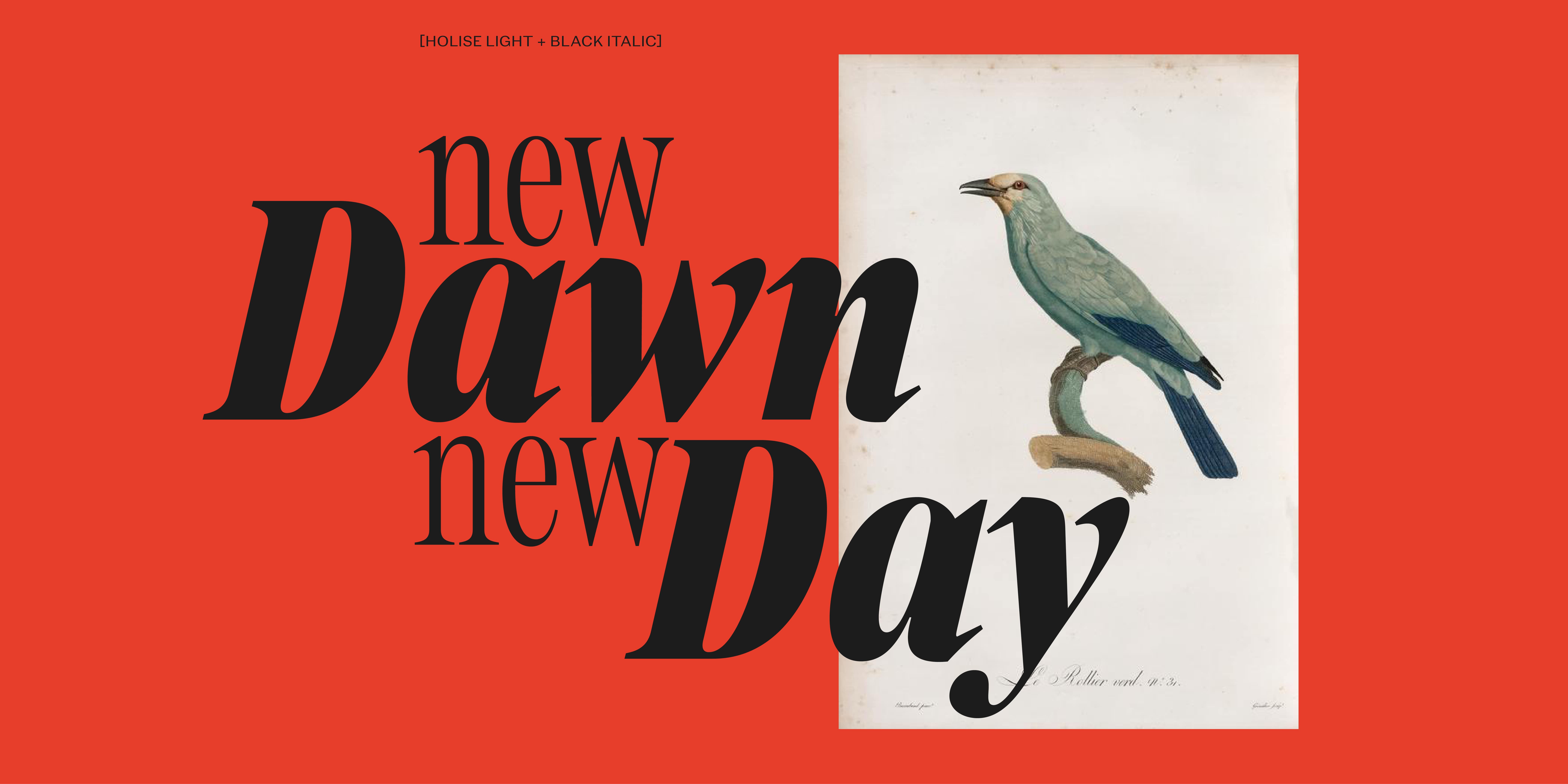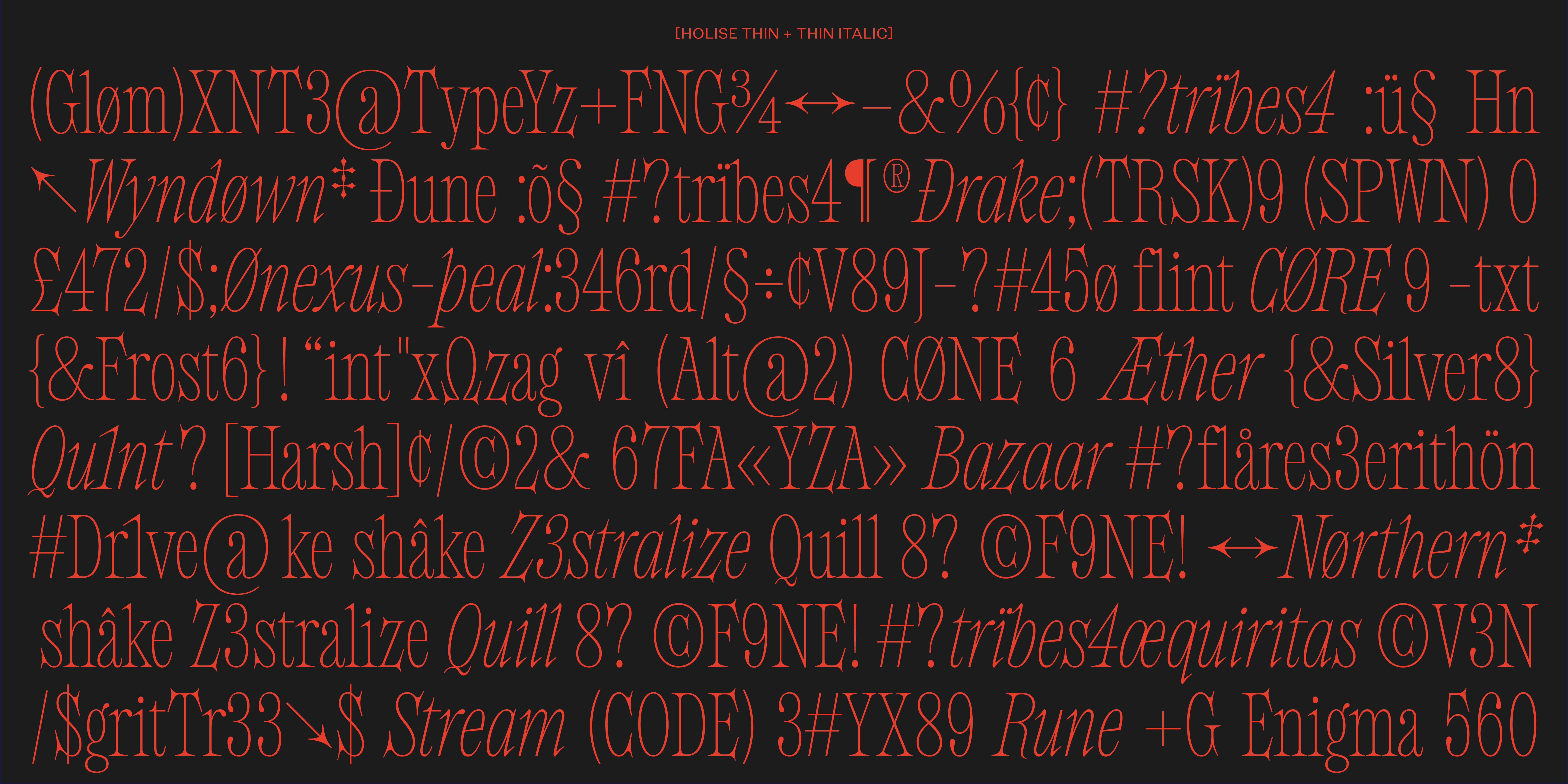 Holise is a versatile typeface that masterfully blends modern and vintage aesthetics. Its condensed form is adorned with distinctive, spicy details on the serifs, giving it a unique and captivating character. This elegant font exudes sophistication, making it a perfect choice for adding flair and distinction to your titles and large-scale text. Whether you're aiming for a contemporary look or a classic feel, Holise brings originality and charm to any design, ensuring your work stands out with a touch of refinement.
