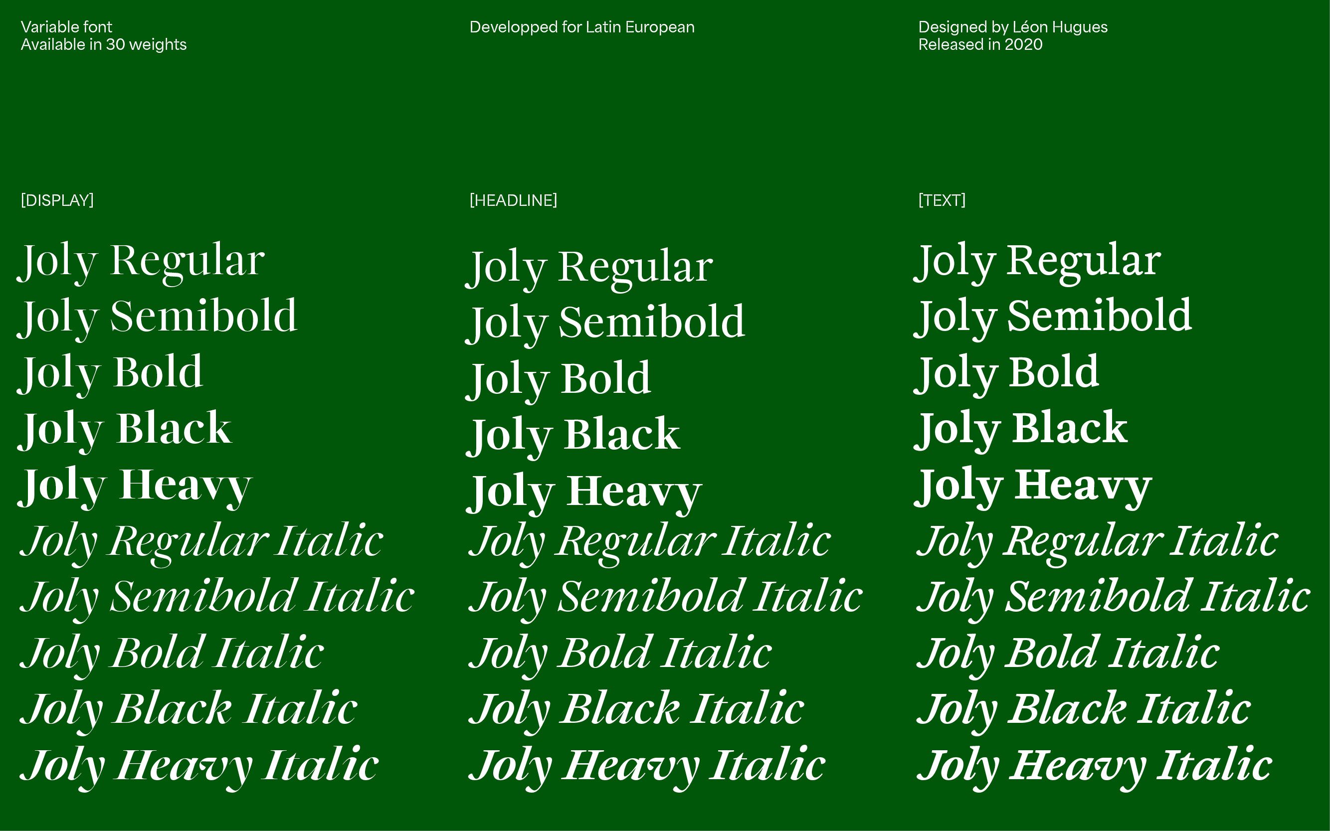 Joly is a Dutch inspired font family designed especially for complex text layouts: multiple optical sizes (Text, Headline, Display) makes it a complete type tool. Elegant and eloquent, Joly is a trustworthy tool to get to the heart of your readers.