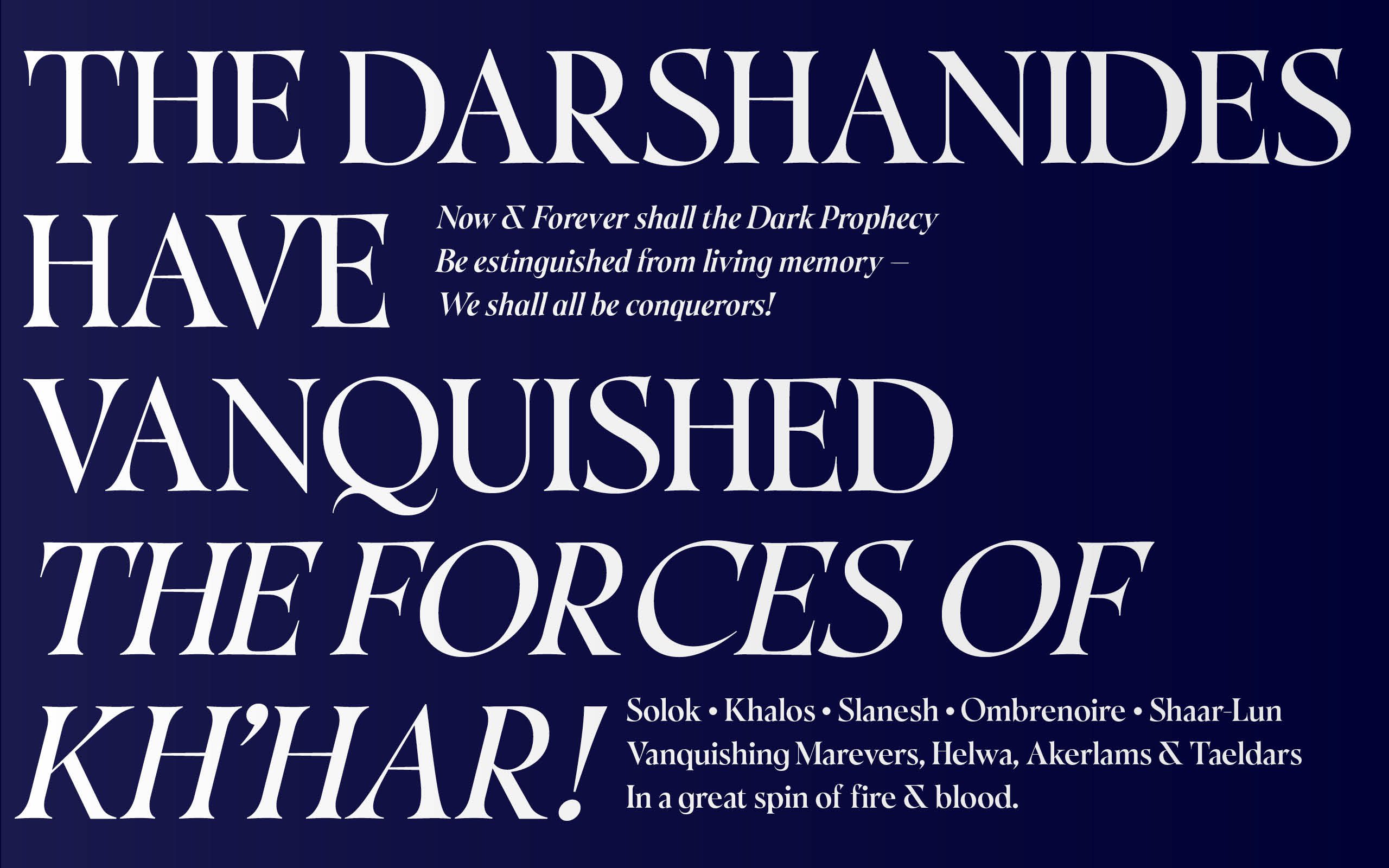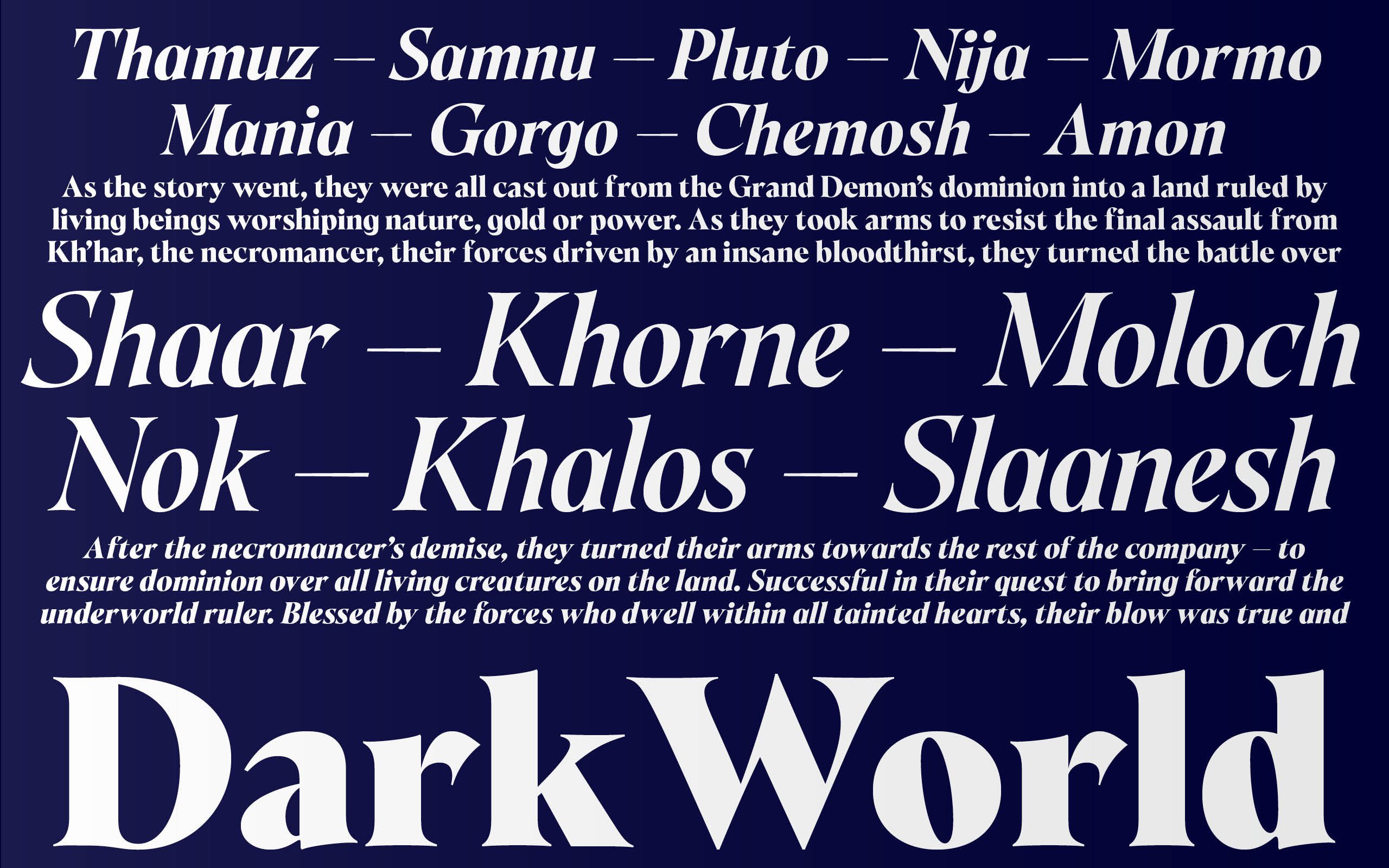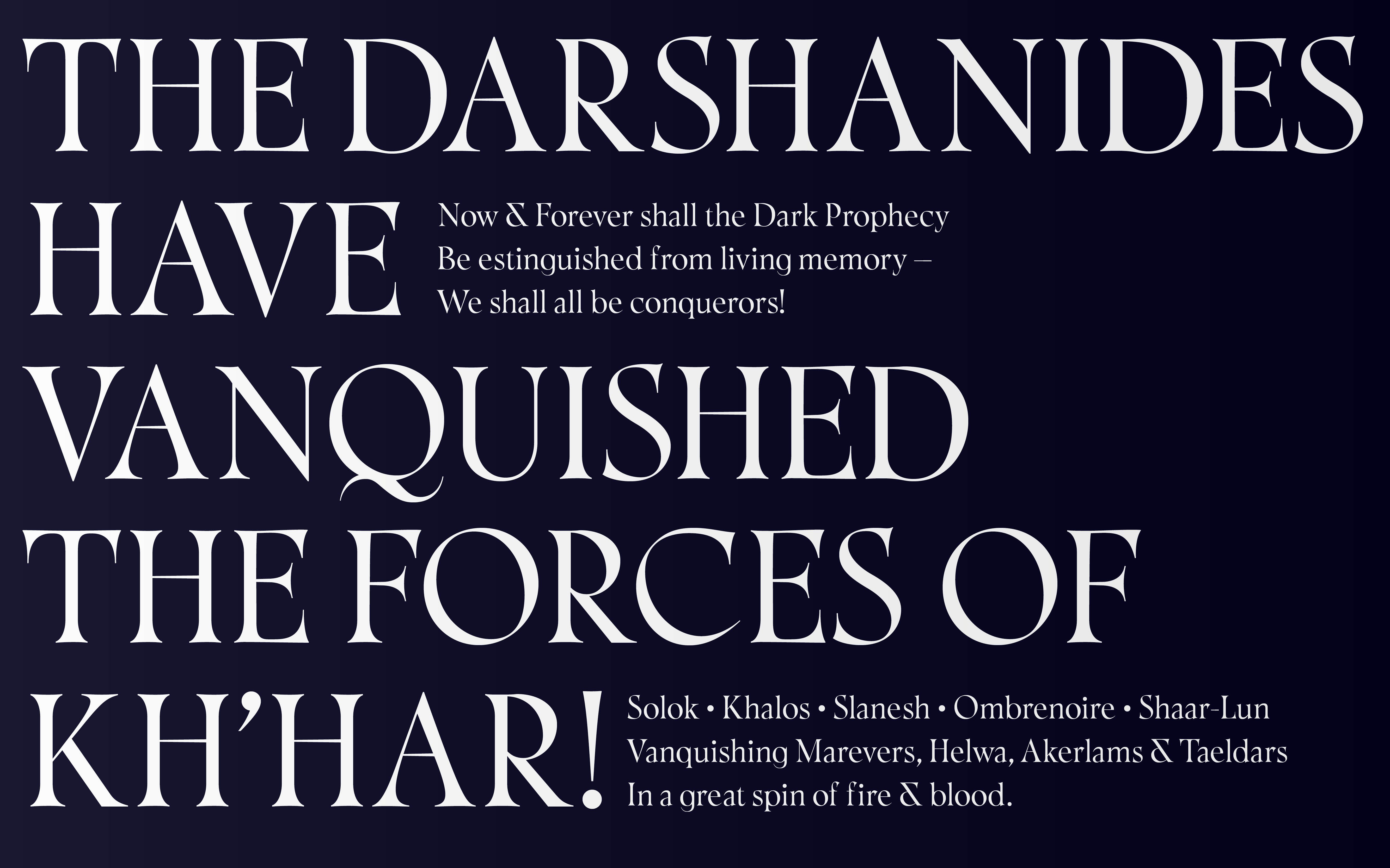 Khalos is a font inspired by the adventures of a group of Darshanides on the video game Ultima Online, and more specifically on the Dark Prophecy shard circa 2002. Its long spiky serifs and highly contrasted round shapes are a balance between elegance and barbed feelings. A true echo to the world of Ultima online and the adventures of Shaar, Mentax, Ombrenoire, Khorne, Slanesh, Arcatus and Khalos. This font is a bridge between historical calligraphic ductus and a more modern and sensitive approach to the overall width rhythmic.