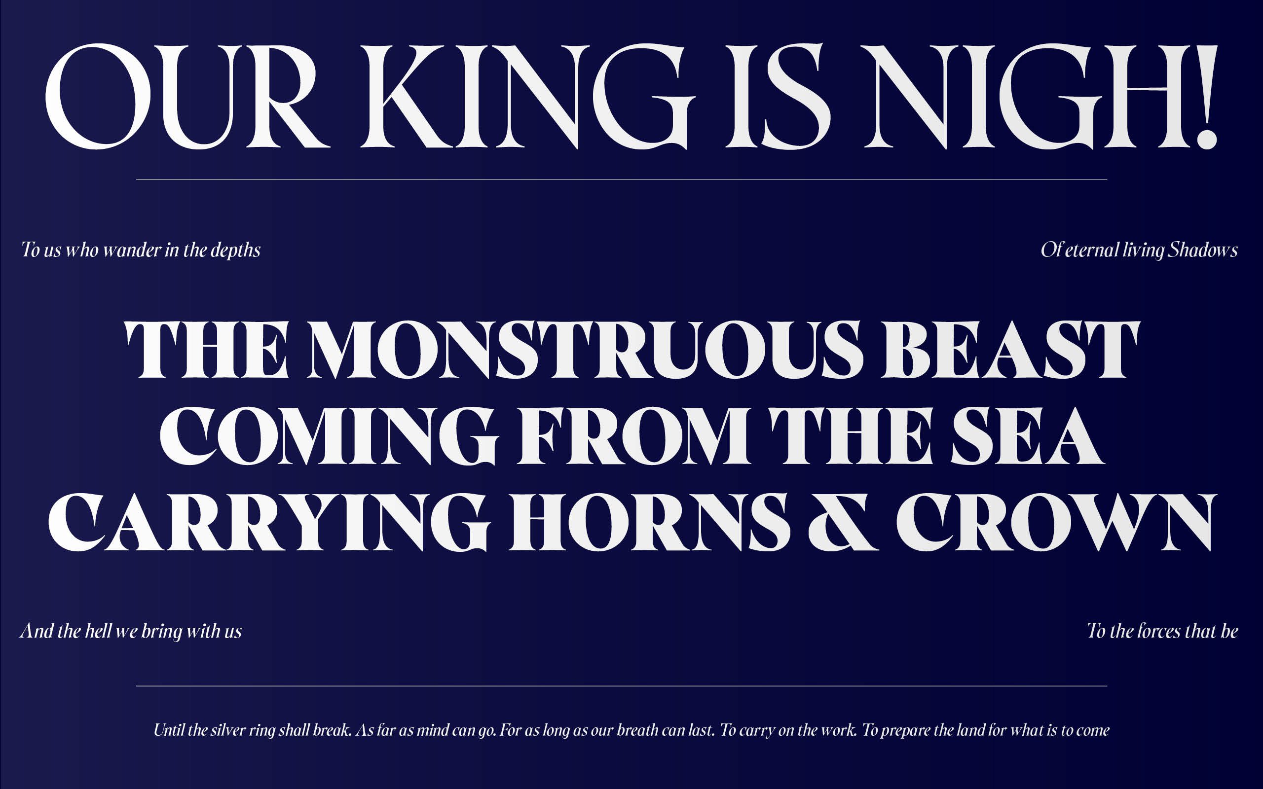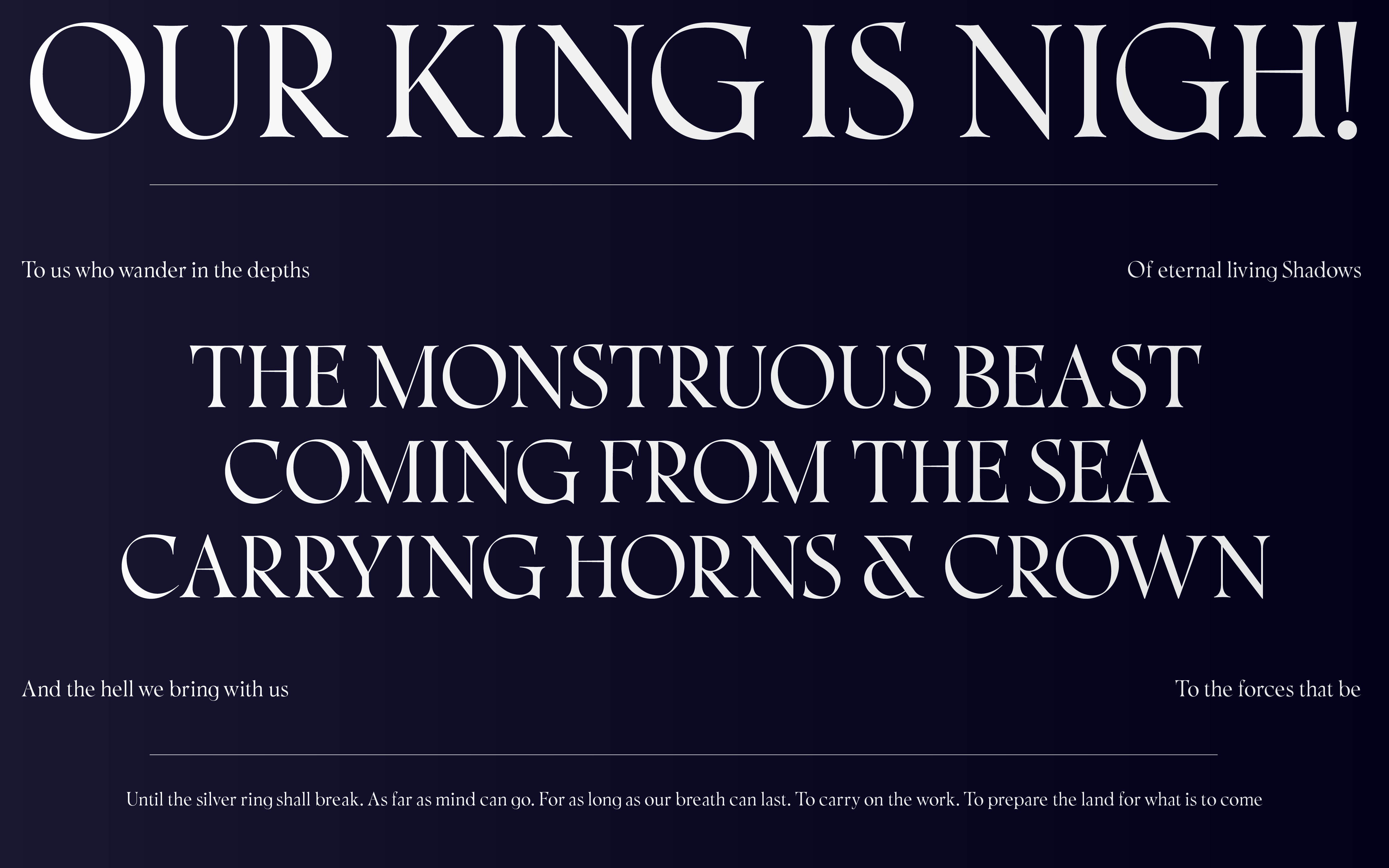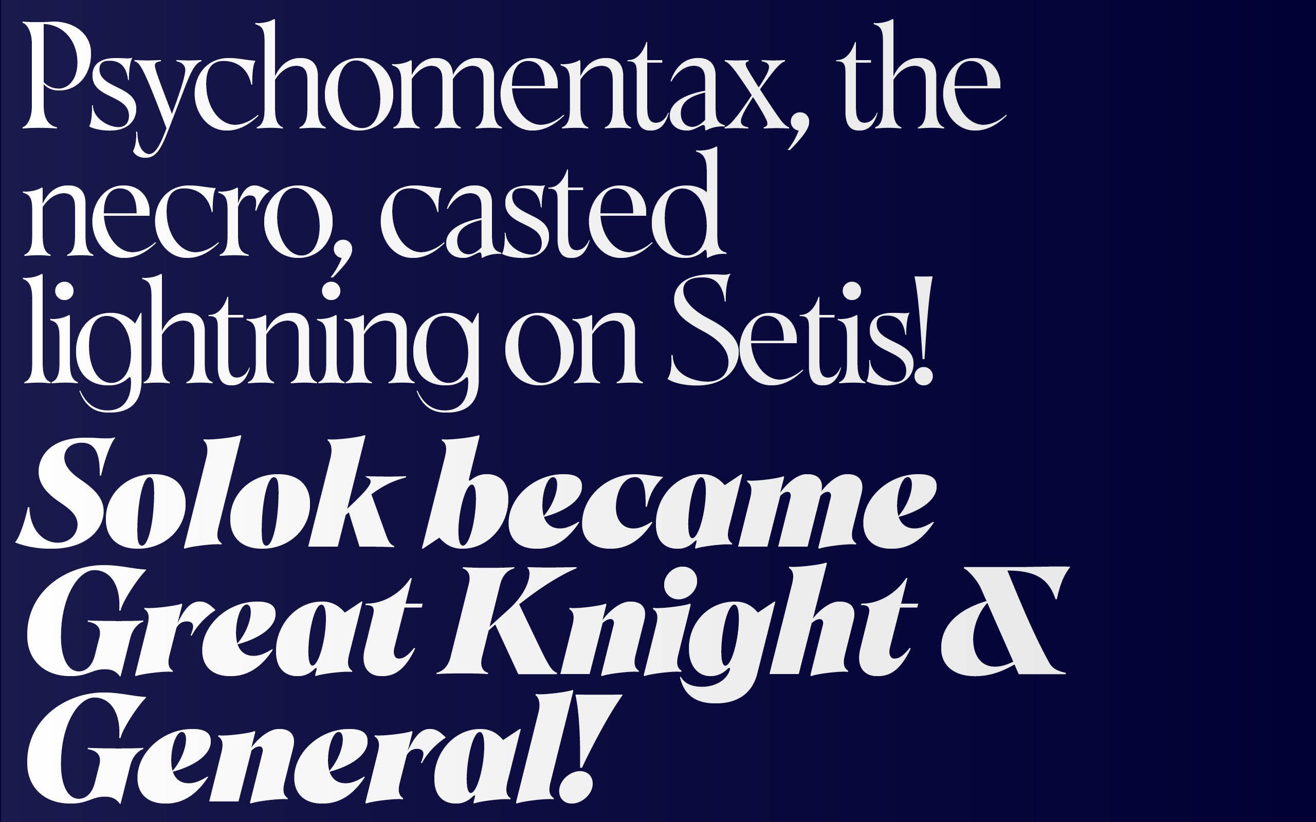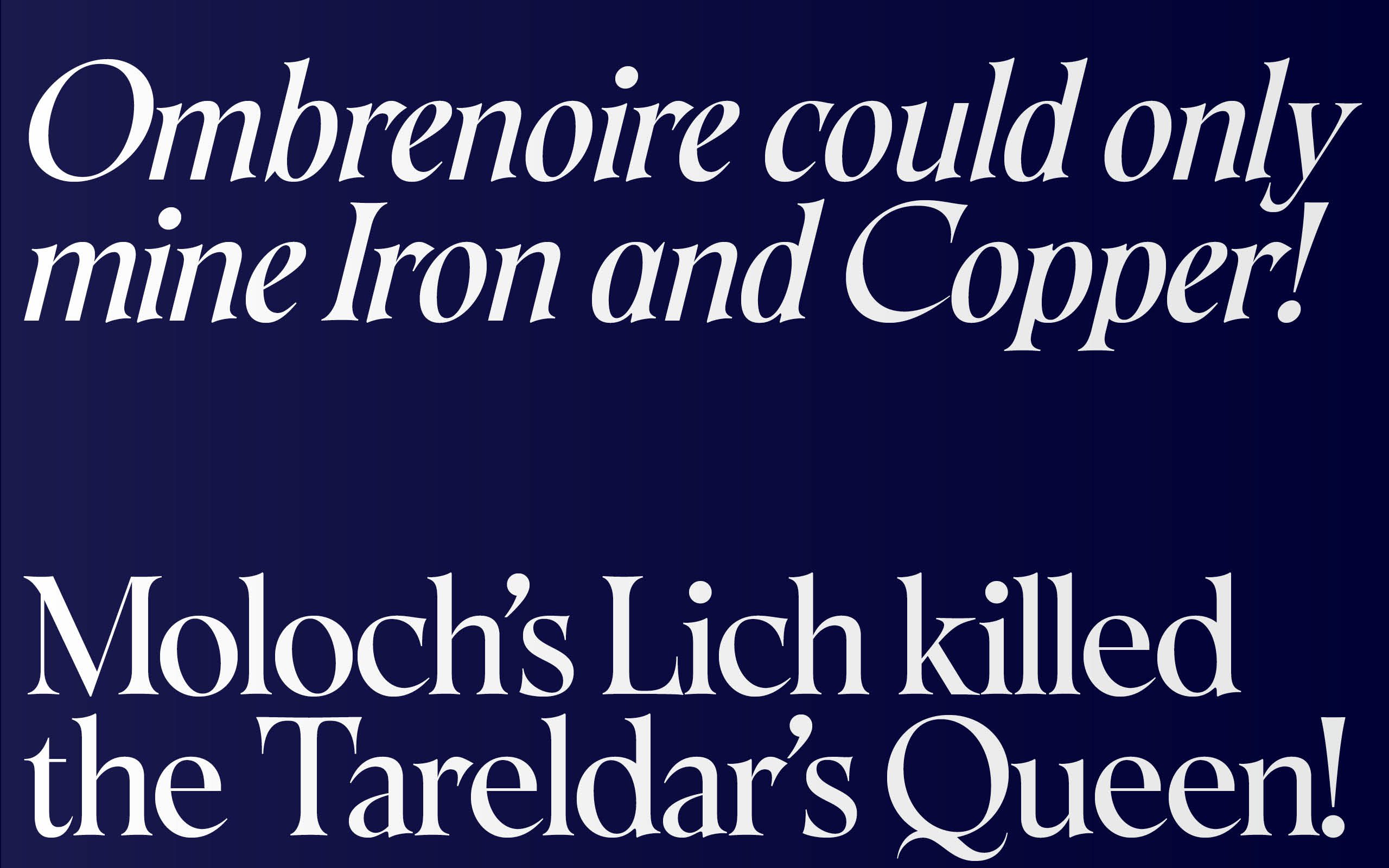 Khalos is a font inspired by the adventures of a group of Darshanides on the video game Ultima Online, and more specifically on the Dark Prophecy shard circa 2002. Its long spiky serifs and highly contrasted round shapes are a balance between elegance and barbed feelings. A true echo to the world of Ultima online and the adventures of Shaar, Mentax, Ombrenoire, Khorne, Slanesh, Arcatus and Khalos. This font is a bridge between historical calligraphic ductus and a more modern and sensitive approach to the overall width rhythmic.