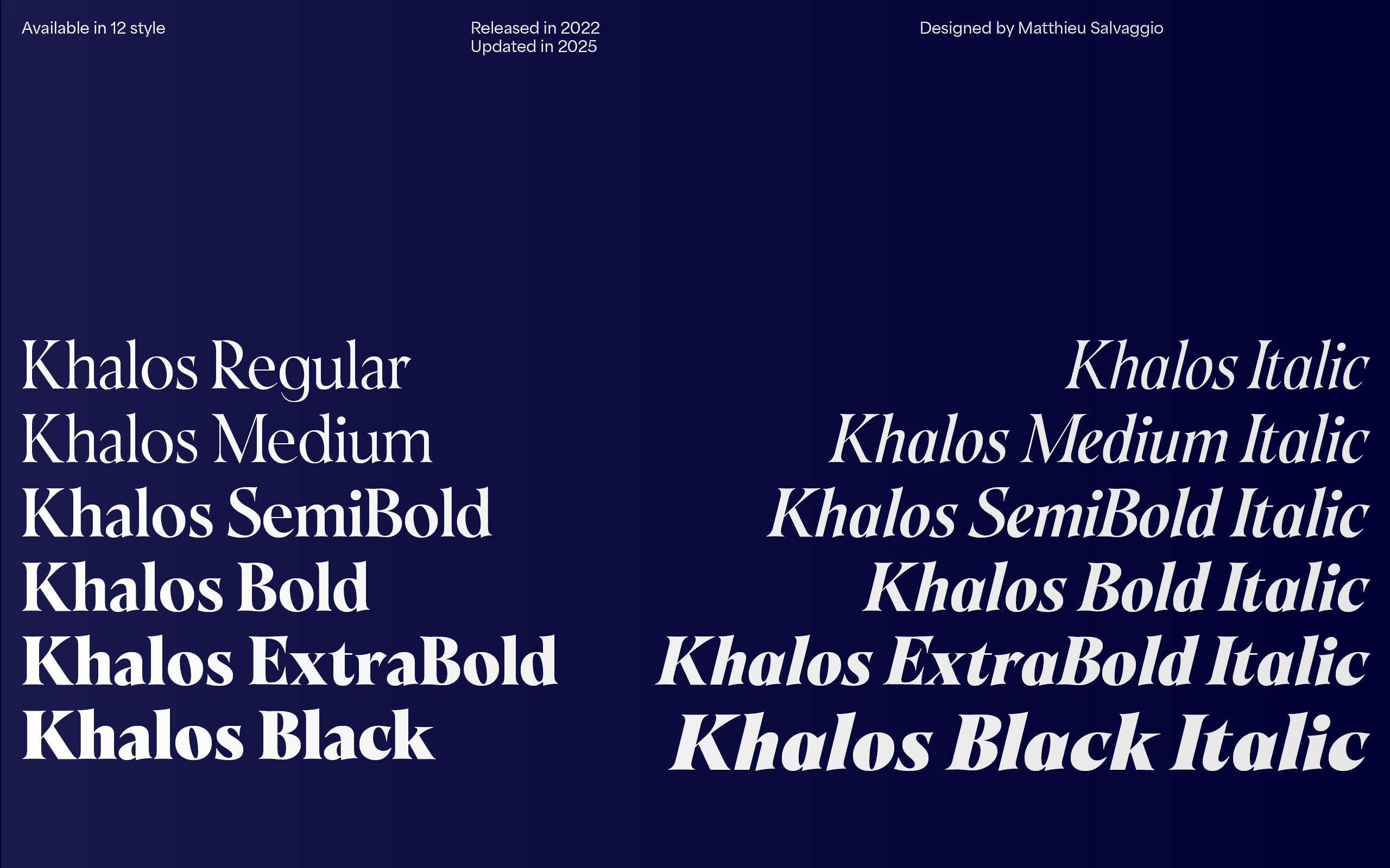Designed for heavy display uses, Khalos will make wonders when used in headlines, high font sizes on posters, books, websites, apps and video games screens.