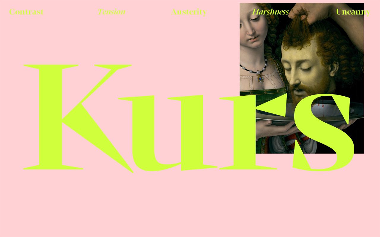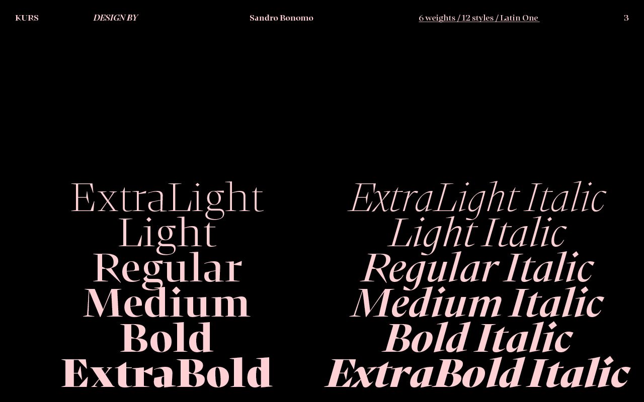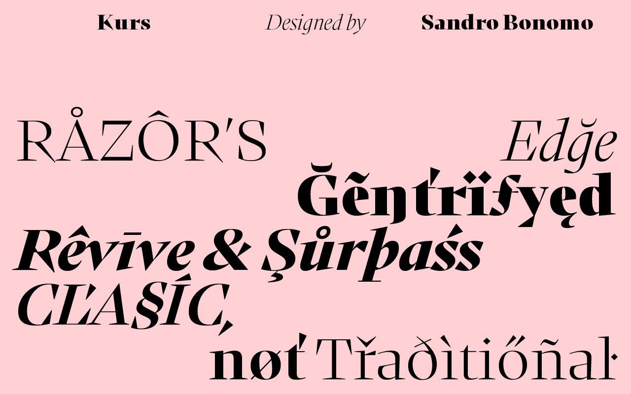 Kurs is a display serif inspired by the concept of the “New Renaissance”, which rethinks the Renaissance as a moment of transition between the Medieval and Modernity. When paradigms shift—without new models to stand with—insecurity grows alongside anxiety, bringing consequences in society that we can clearly see then, as well as today. These concepts translate into shapes with stark contrasts between thick and thin lines, soft and flat curves, spiky serifs and terminals. Harshness and opposition of shapes were at the core of an attempt to depict a small part of what it means to live today. The name Kurs is the German word for “course”, which fits both thematically and phonetically with the typeface. Additionally, there is assonance with words like curse, cursive, and kursiv, all of which, in their own way, identify within the appearance of the shapes.