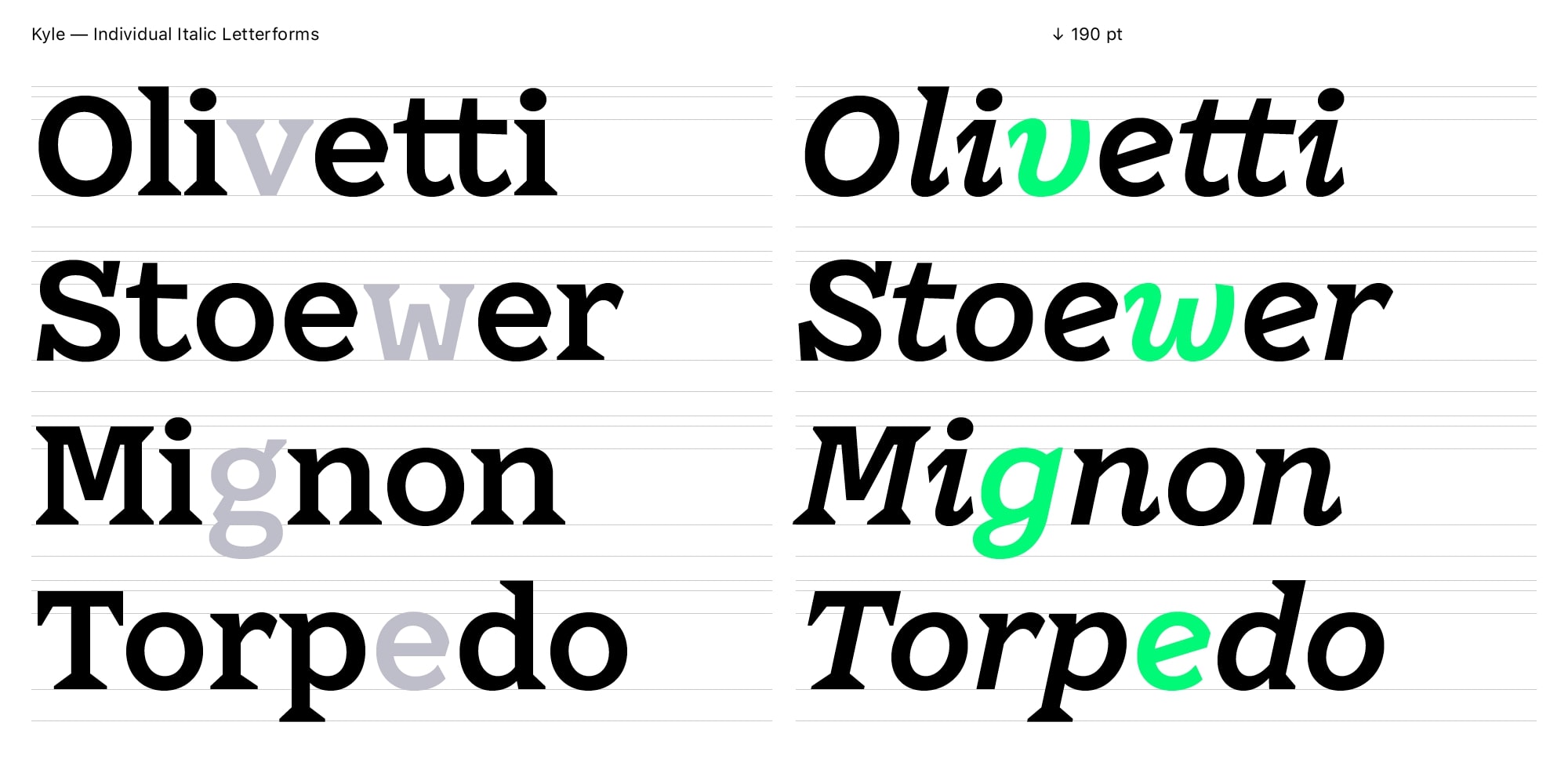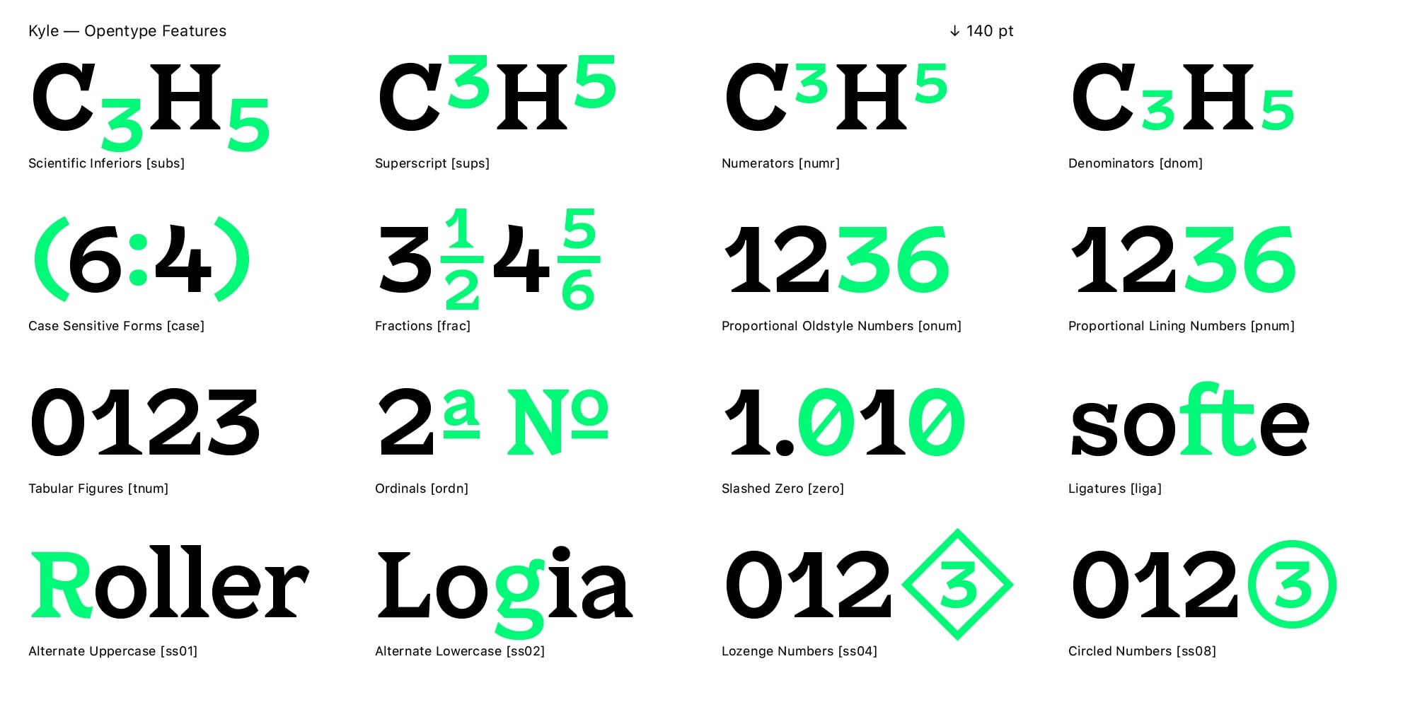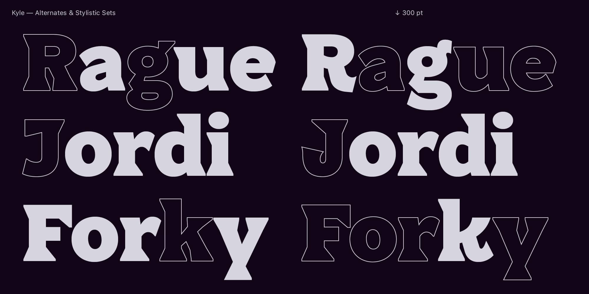 Kyle is a contemporary monoline serif font family with a typewriter touch. It changes its character with increasing weight: The fonts have sharp, triangular serifs, that gain momentum as the weight grows. The serifs change their look from the typical slab like typewriter form to strong triangular extremities, giving the font a strong standing and a lot of character. The heavier weights gain headline quality, showing detail that attracts attention and makes Kyle a great choice for a wide range of uses. The family is well equipped for todays typographic needs, including the most commonly used OpenType features like lining figures, ordinals, superior numbers and fractions. It also has an extended character set containing more than 800 glyphs supporting Eastern European languages as well as Central and Western European languages. Additionally it contains many practical symbols. The spacing of the letters was adjusted with a lot of care, preventing language typical spacing issues. Extensive testing in all common European languages leads to comfortable reading.
