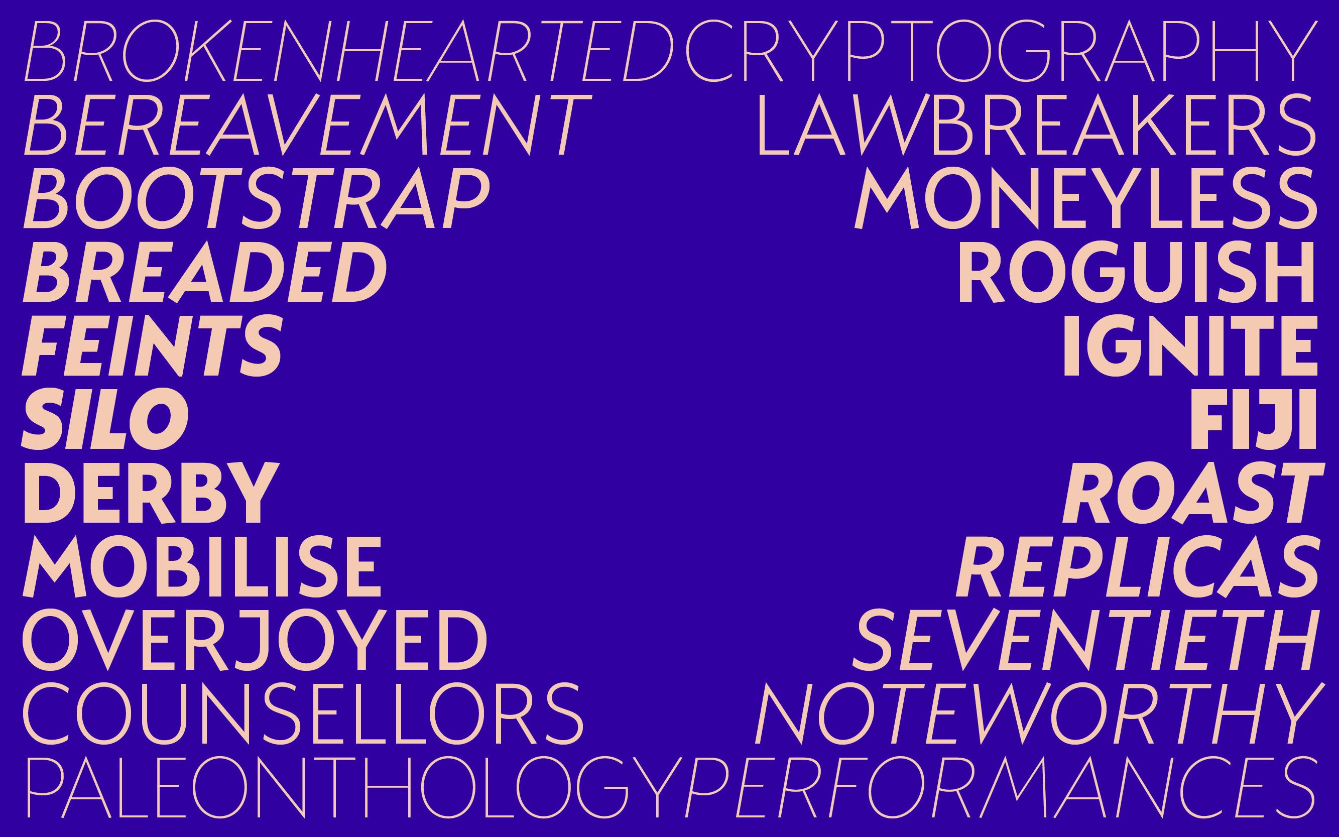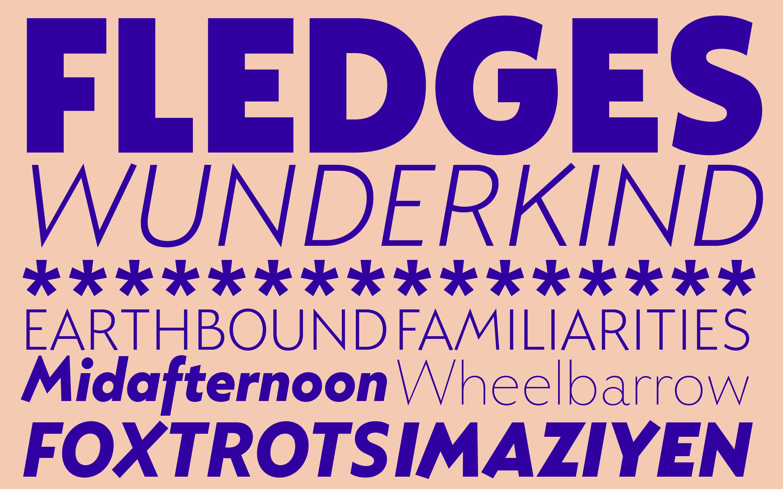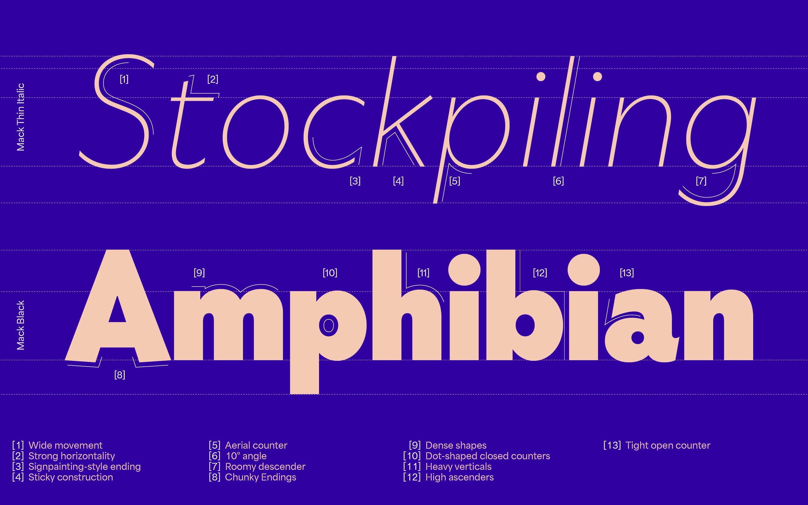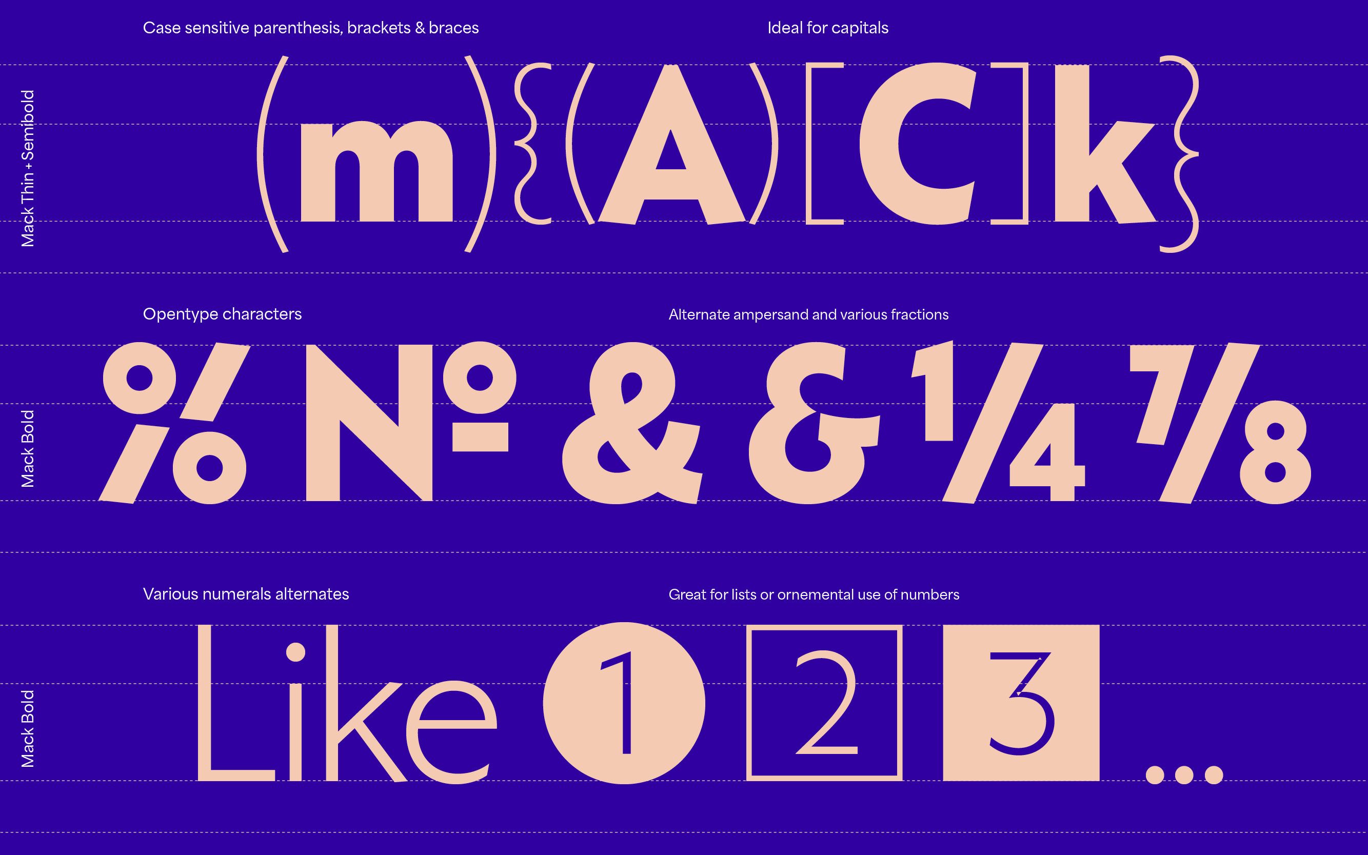 Mack is a humanist sans serif inspired by the natural, brush-made variations of details originally rooted in geometry. The spark for the creation of Mack came from lettering on a map of Mackinac Island whose angled terminals, pointed peaks, and variation of proportion were all details that set it apart from the strictly geometric forms it appears to reference. Rather than copying the few letters there and extrapolating them into a whole font, Mack is an original sans serif design following similar principles. Its structure and contrast resemble those of mid-century geometric typefaces while its curves and terminals are angled to emulate the stroke of a brush.