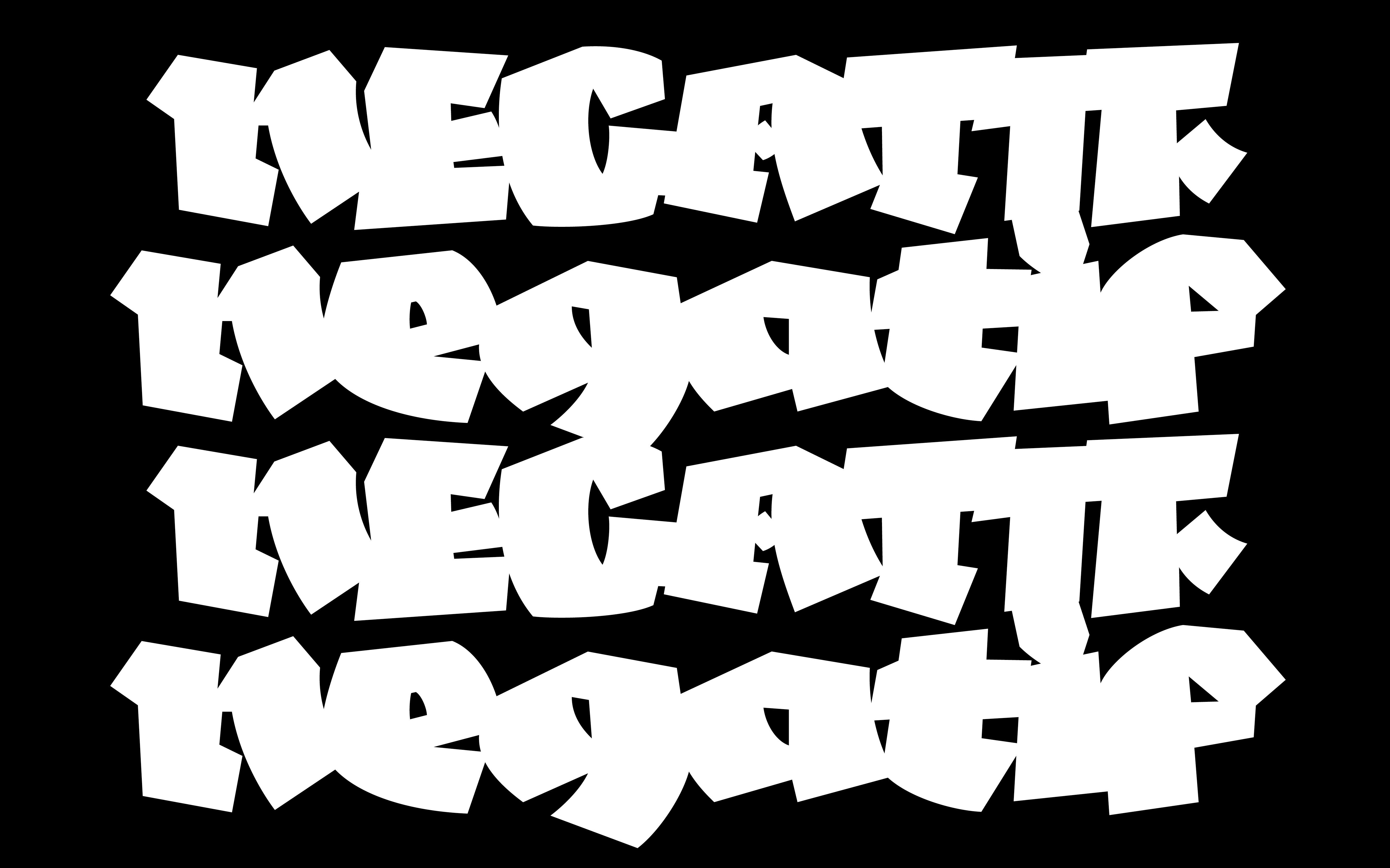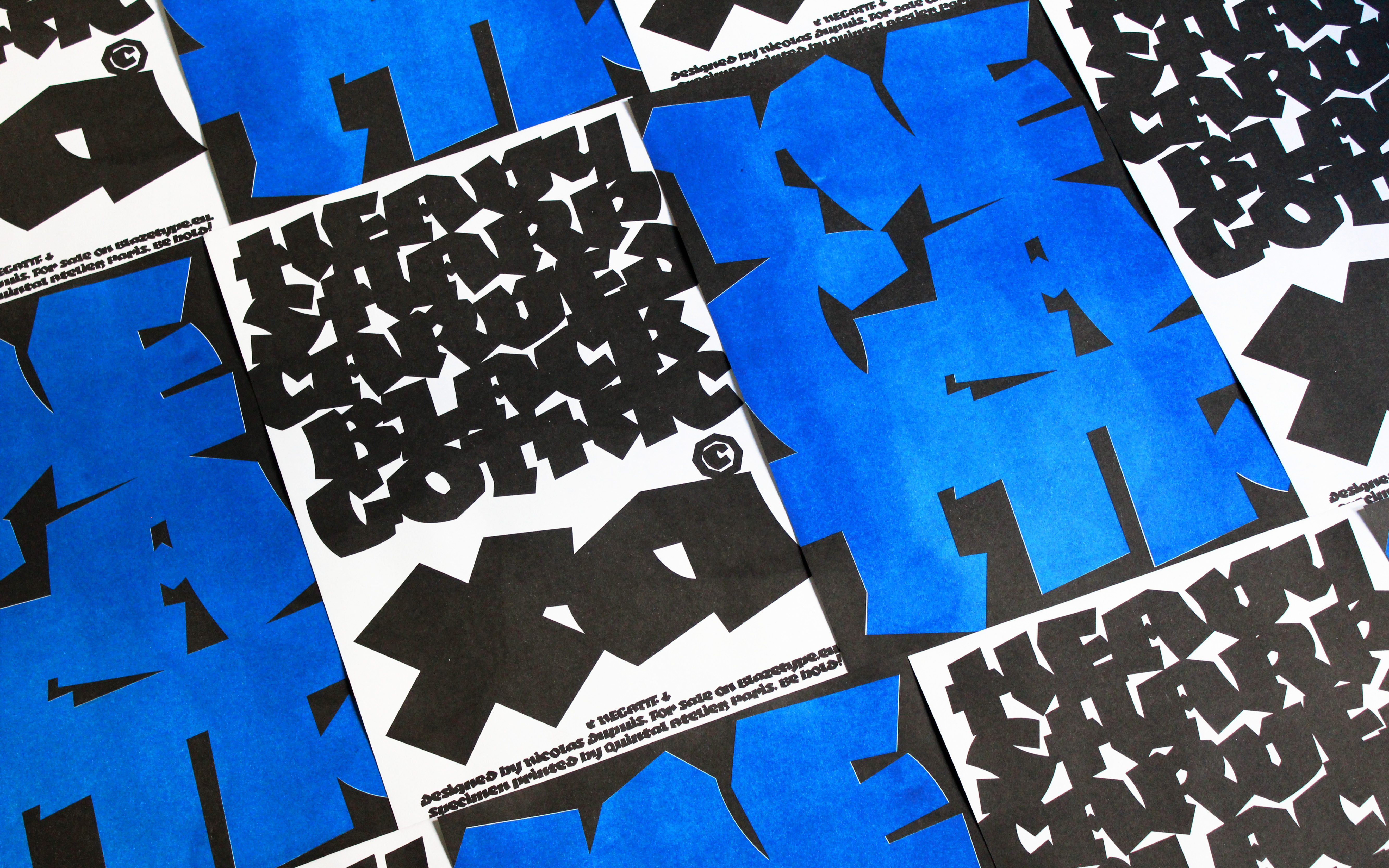 Negatif font comes from an intention to simplify the gothic letter with a unique black style. The letters were first designed with some calligraphic research and then cut out in black paper. With the aim of obtaining raw, incisive, cutting forms. Negatif font consists in carving in the matter as sculpture, retaining the gothic inspiration..