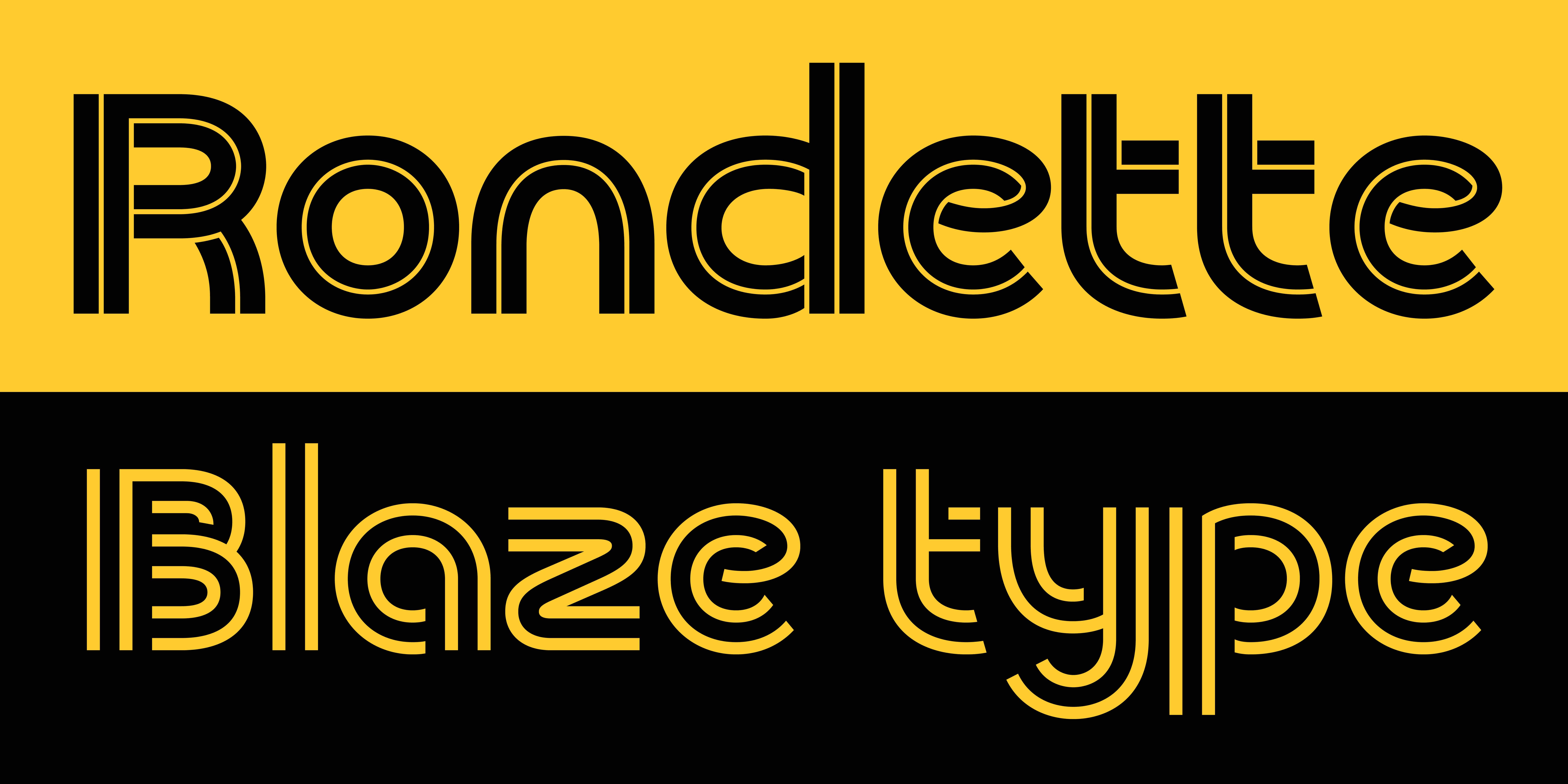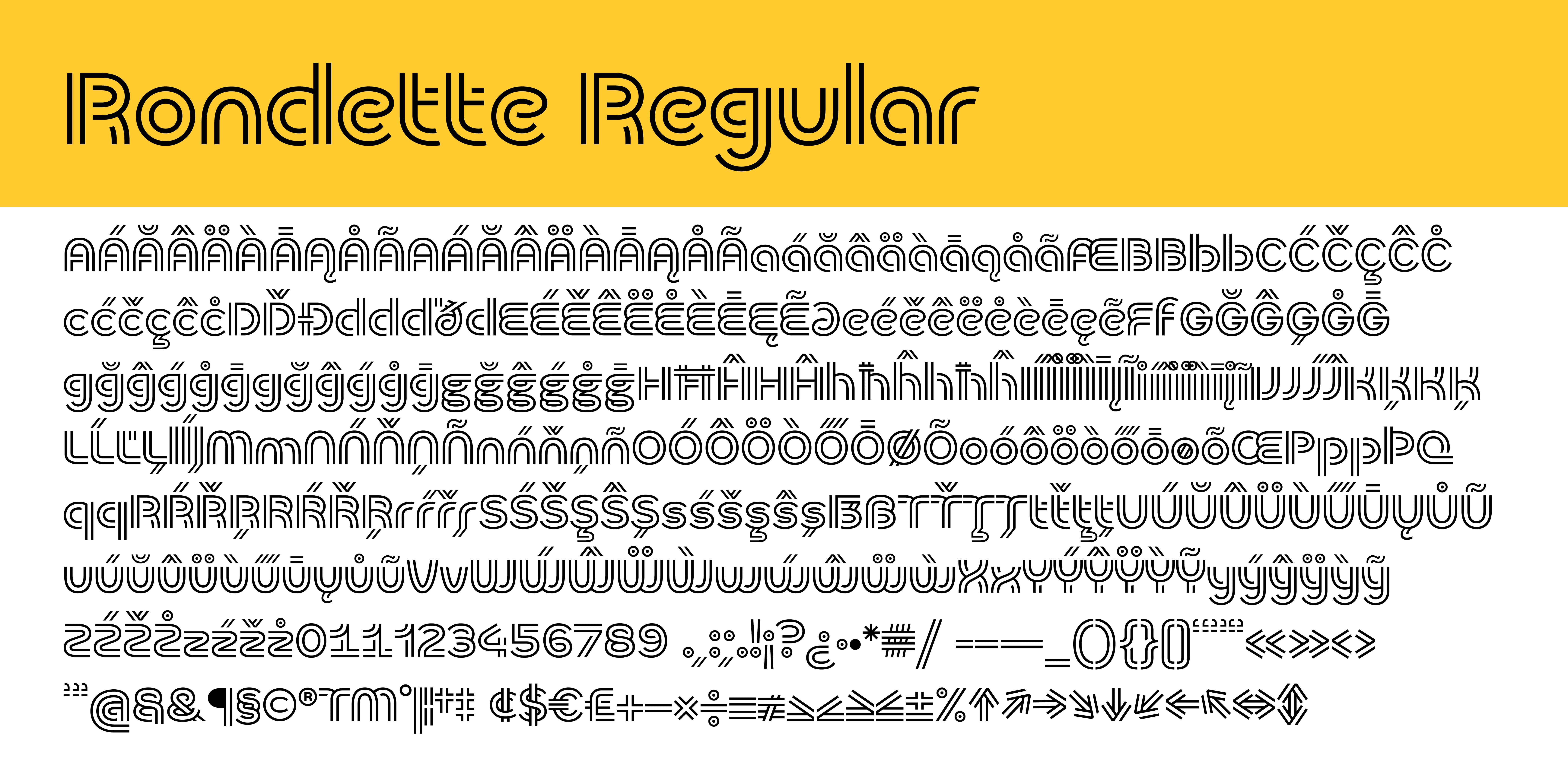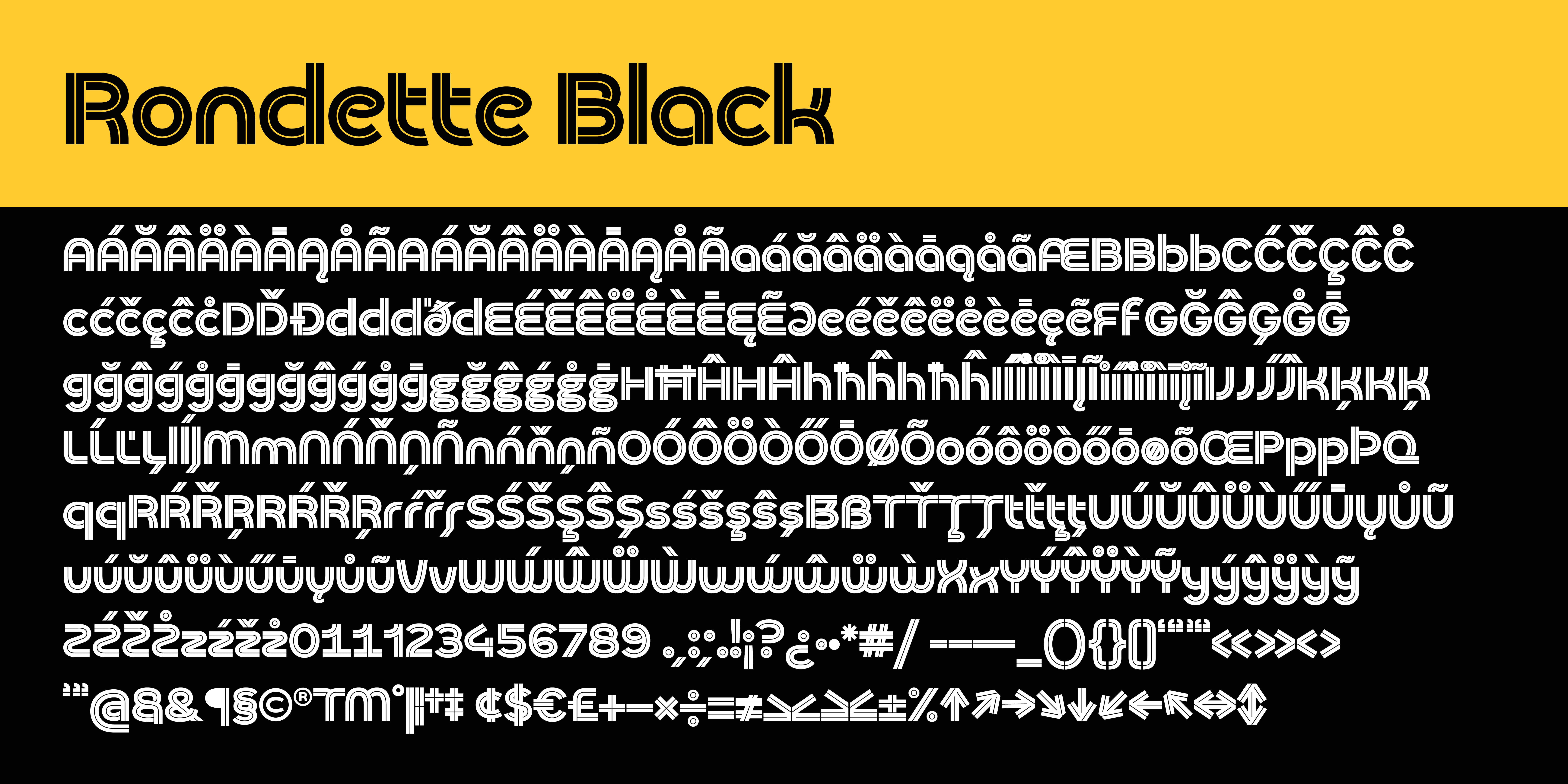 Rondette is a display typeface available in four weights: Regular, Medium, Bold, and Black. It’s rich in stylistic alternatives—like the unique legs of the R and K, the distinctively shaped bowls of b, d, p, and q, and both single- and double-storey g's—allowing for compositions that stand out with variety and flair. The typeface's sharp diagonal cuts on letters like S, C, and G, combined with rounded elements in A, E, and F, give it a vibrant, athletic quality.