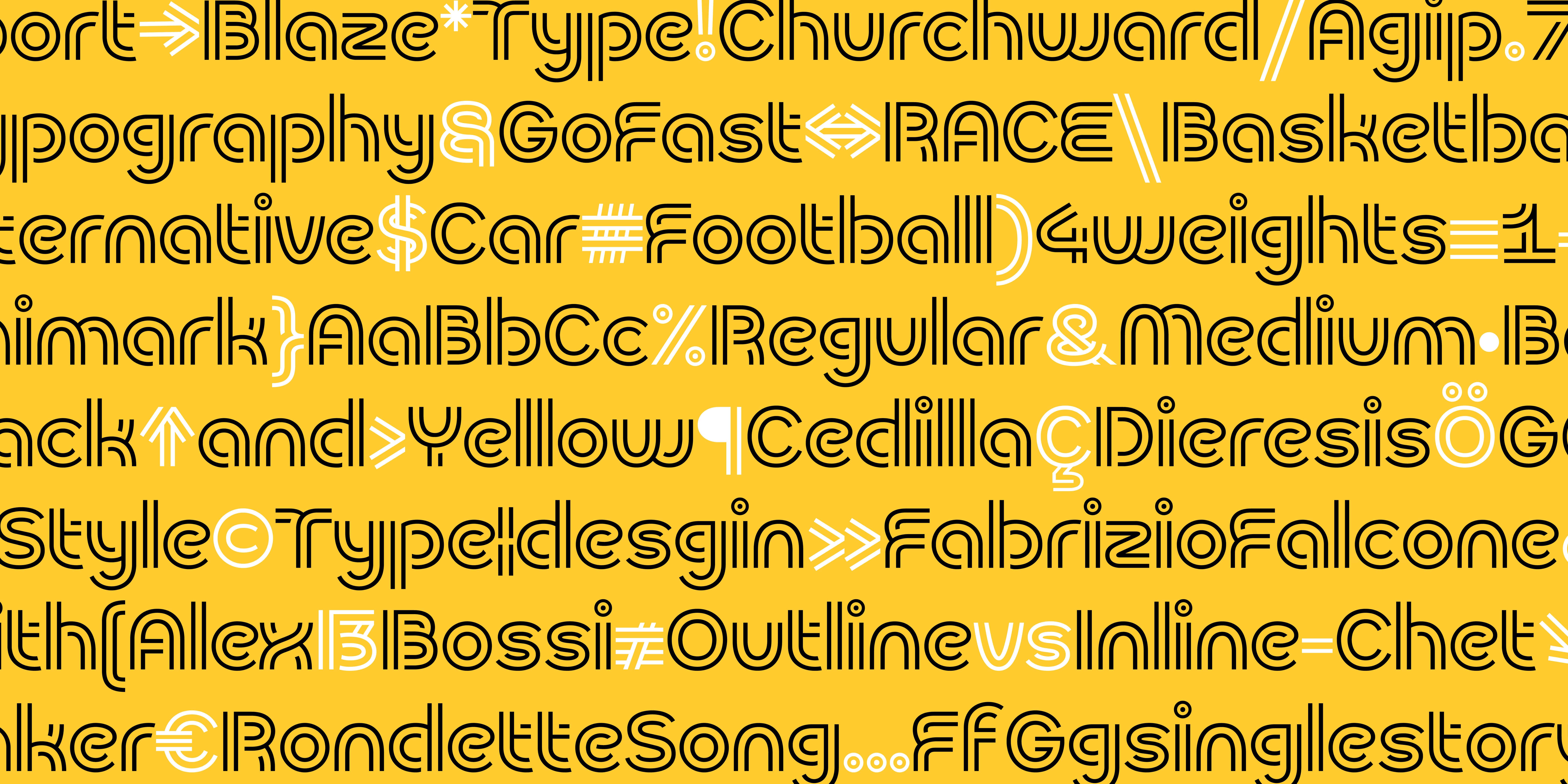 Rondette is a display typeface available in four weights: Regular, Medium, Bold, and Black. Itâs rich in stylistic alternativesâlike the unique legs of the R and K, the distinctively shaped bowls of b, d, p, and q, and both single- and double-storey g'sâallowing for compositions that stand out with variety and flair. The typeface's sharp diagonal cuts on letters like S, C, and G, combined with rounded elements in A, E, and F, give it a vibrant, athletic quality.