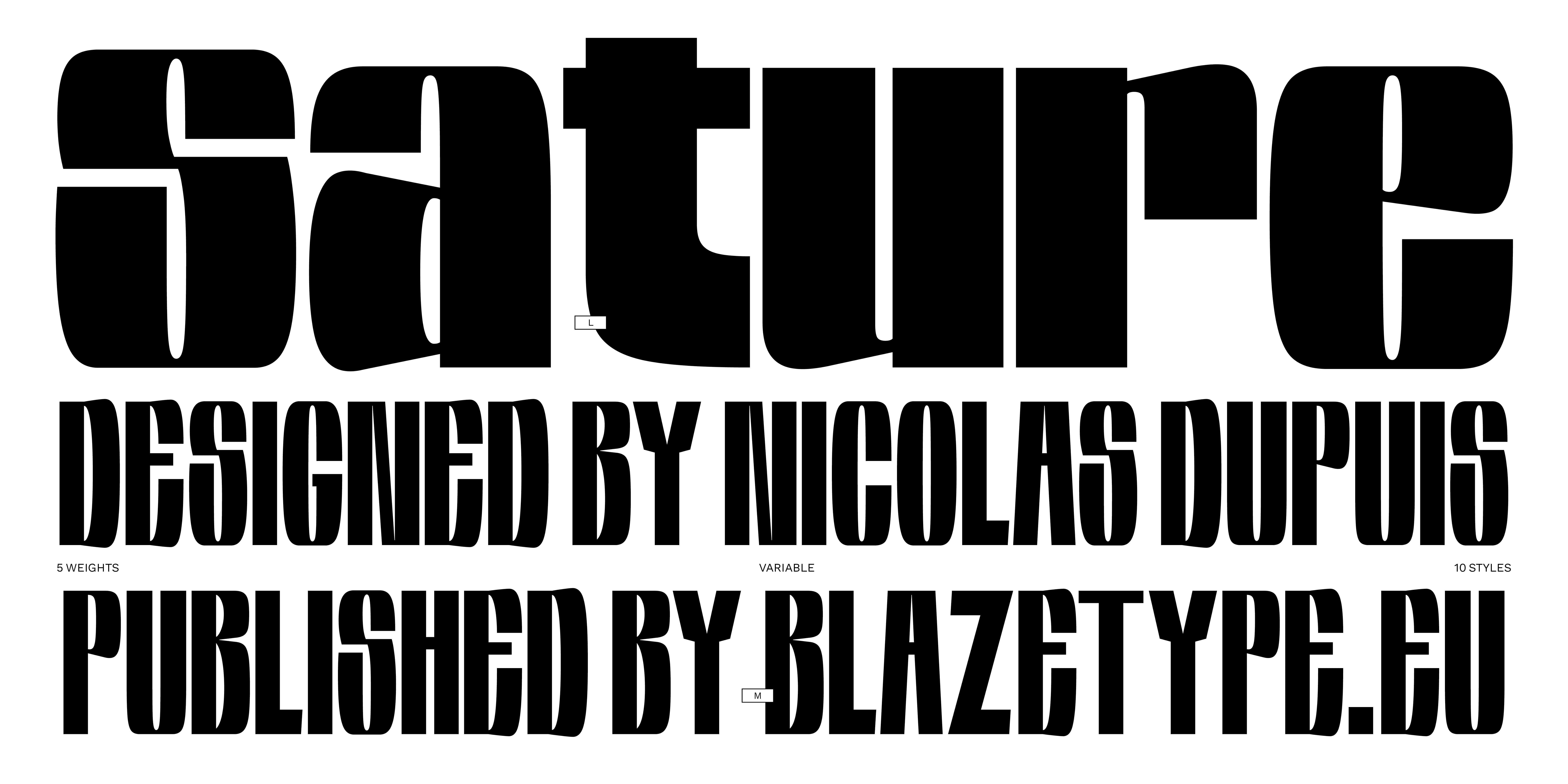 Designed from large-print lettering drawn on paper, the Sature font family came from a desire to create a complete family that unfolds. The letters are the result of an adjustment of hand-made lettering. All styles can be used together to create contrasts in the layout.