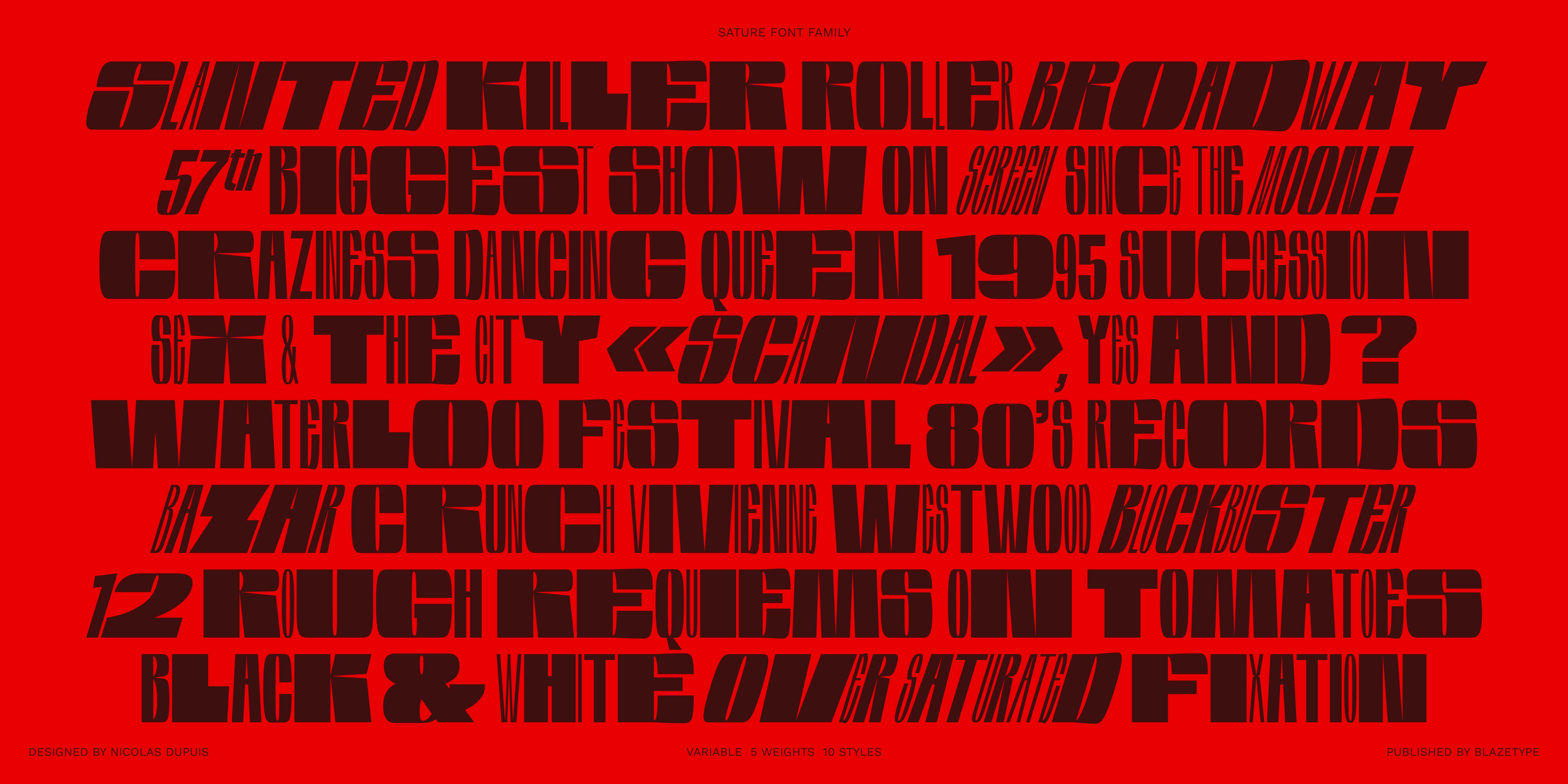 The name of the font comes from the french word «Saturer», meaning to overtake with excess. Feel free to maximise. With its 5 heights and 10 styles with the slant, the family offers a wealth of possibilities for creating saturation effects. A variable font that gives the impression that between each style appears a doubling of the letter, like a felt-tip marker that enlarges the letter. Horizontal processing was carried out to give the letters their fullness, making it easy for use in large sizes and high-impact messages