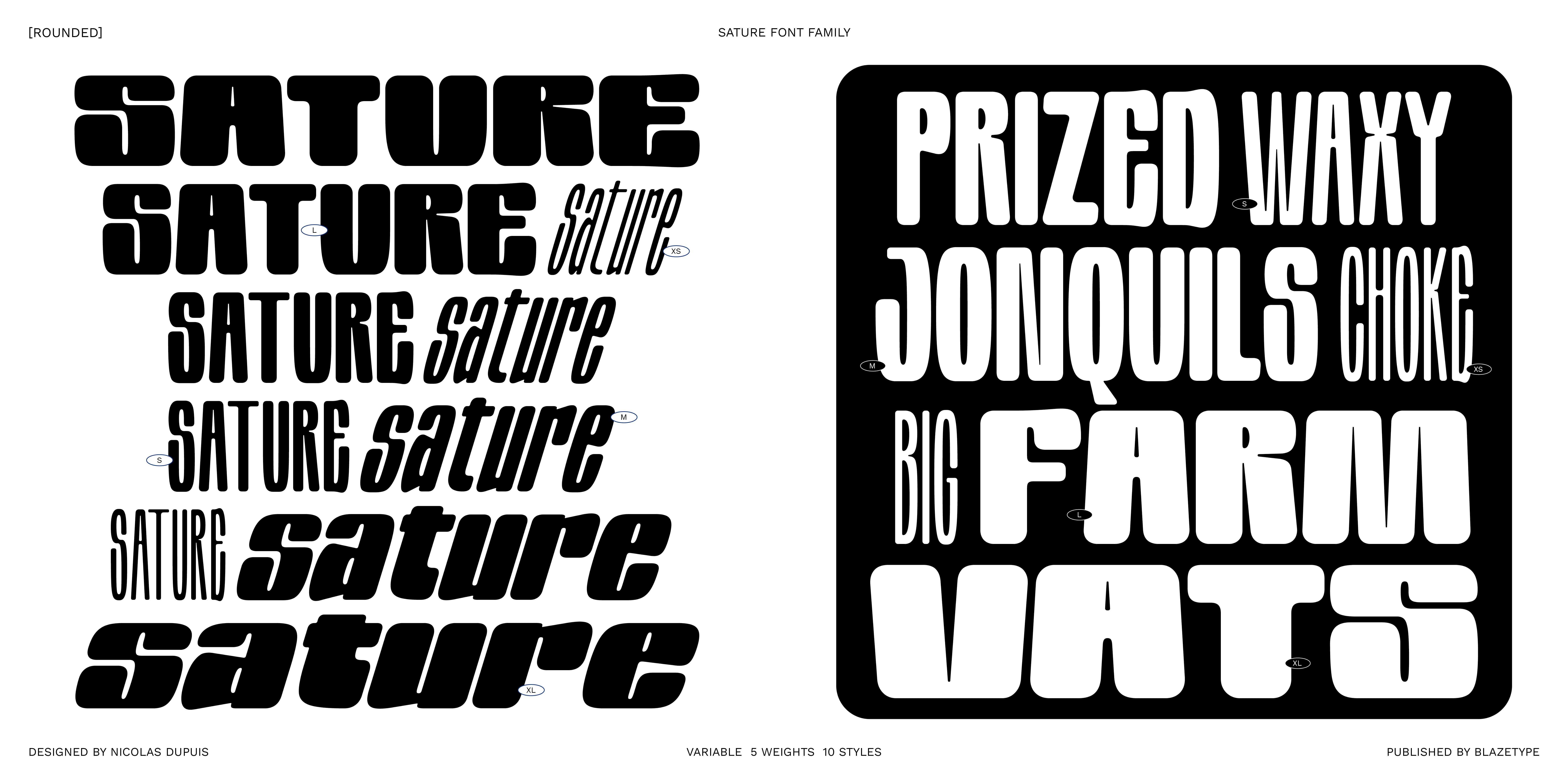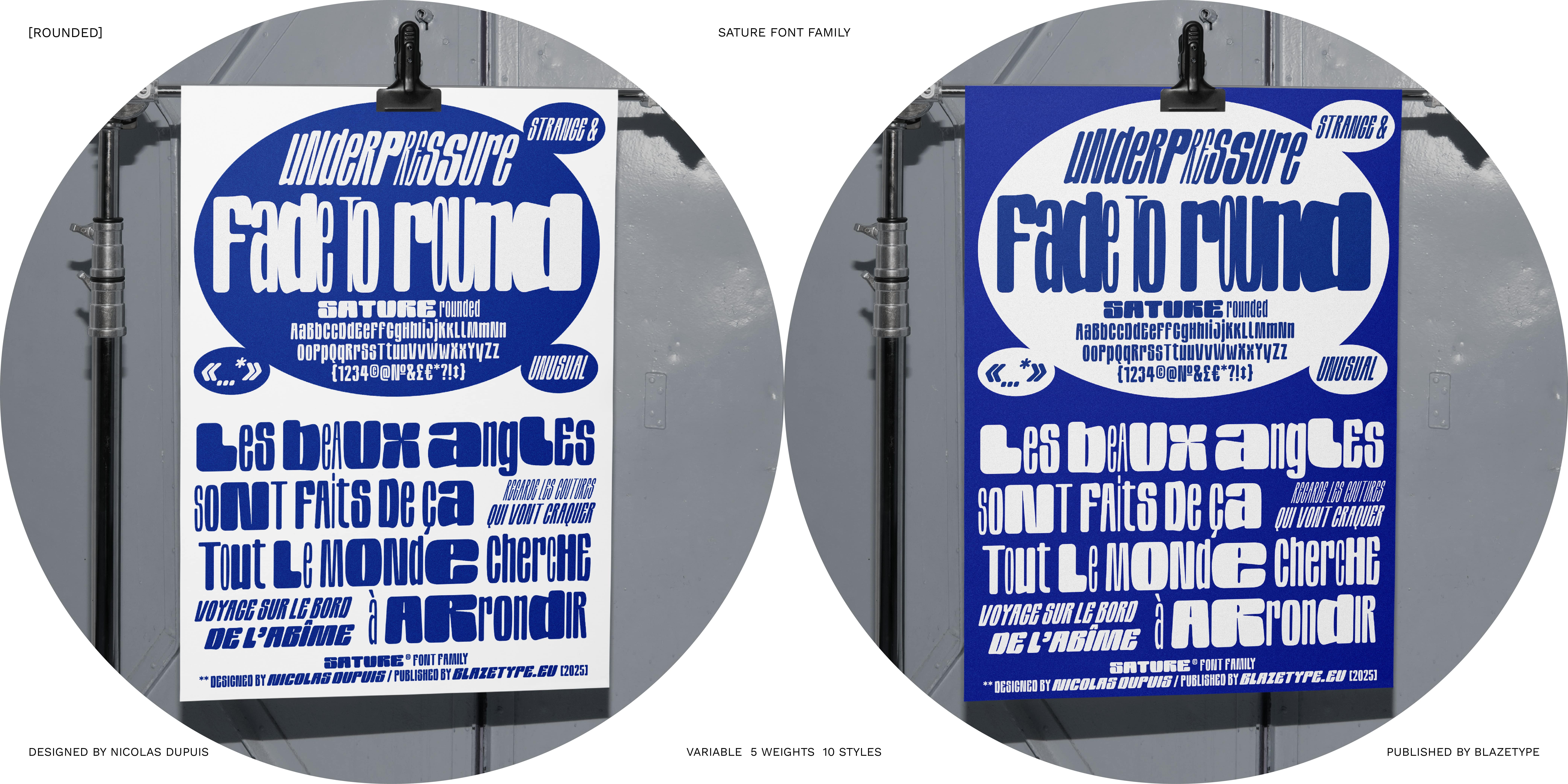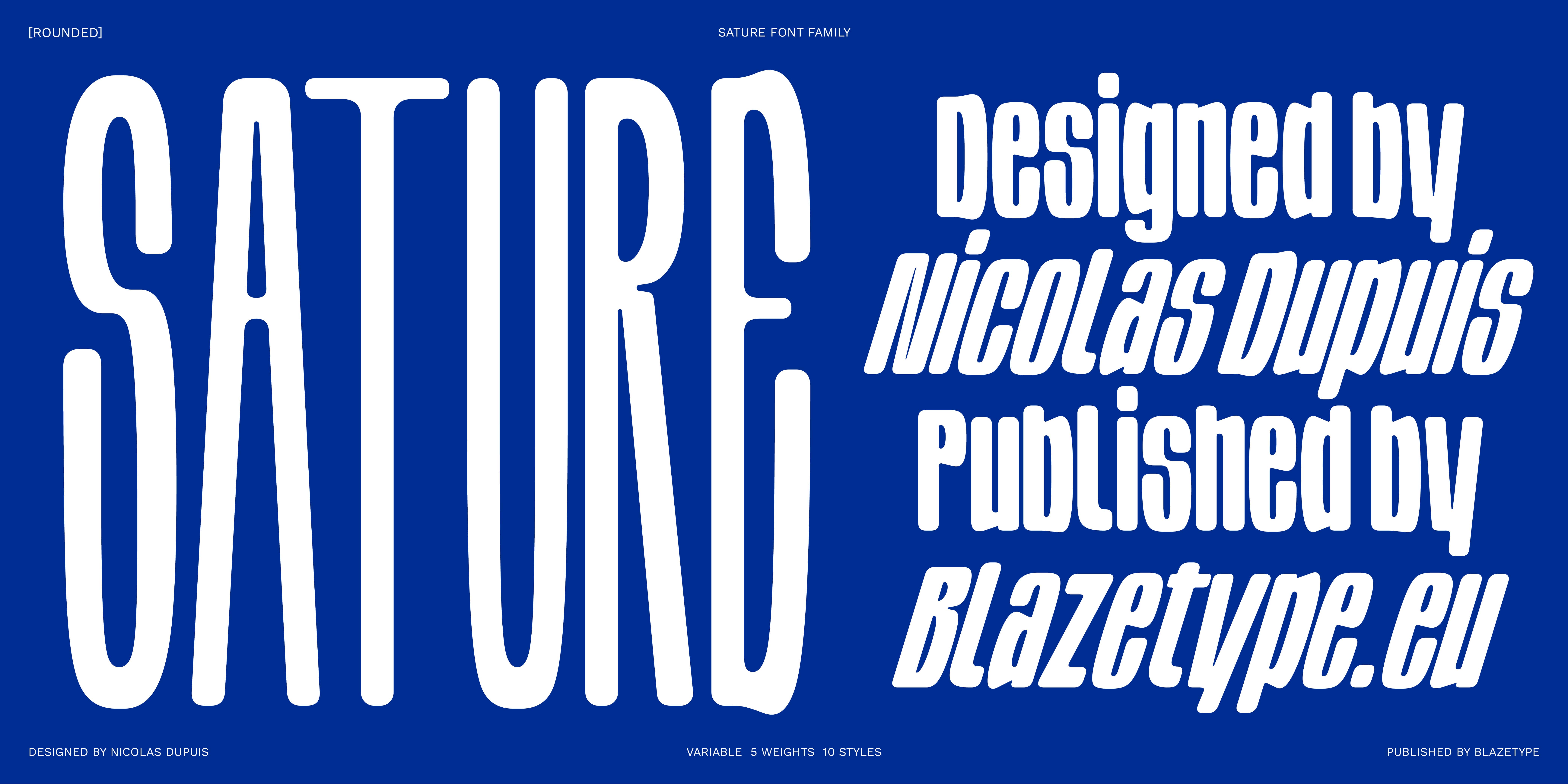 Designed from large-print lettering drawn on paper, the Sature font family came from a desire to create a complete family that unfolds. With this rounded version, there are no more sharp angles! It is a flexible way to share some good vibes. All styles can be used together to create contrasts in the layout. The name of the font comes from the french word «Saturer», meaning to overtake with excess. Feel free to maximize. With its 5 heights and 10 styles with the slant, the family offers a wealth of possibilities for creating saturation effects. A variable font that gives the impression that between each style appears a doubling of the letter, like a felt-tip marker that enlarges the letter. Horizontal processing was carried out to give the letters their fullness, making it easy for use in large sizes and high-impact messages.