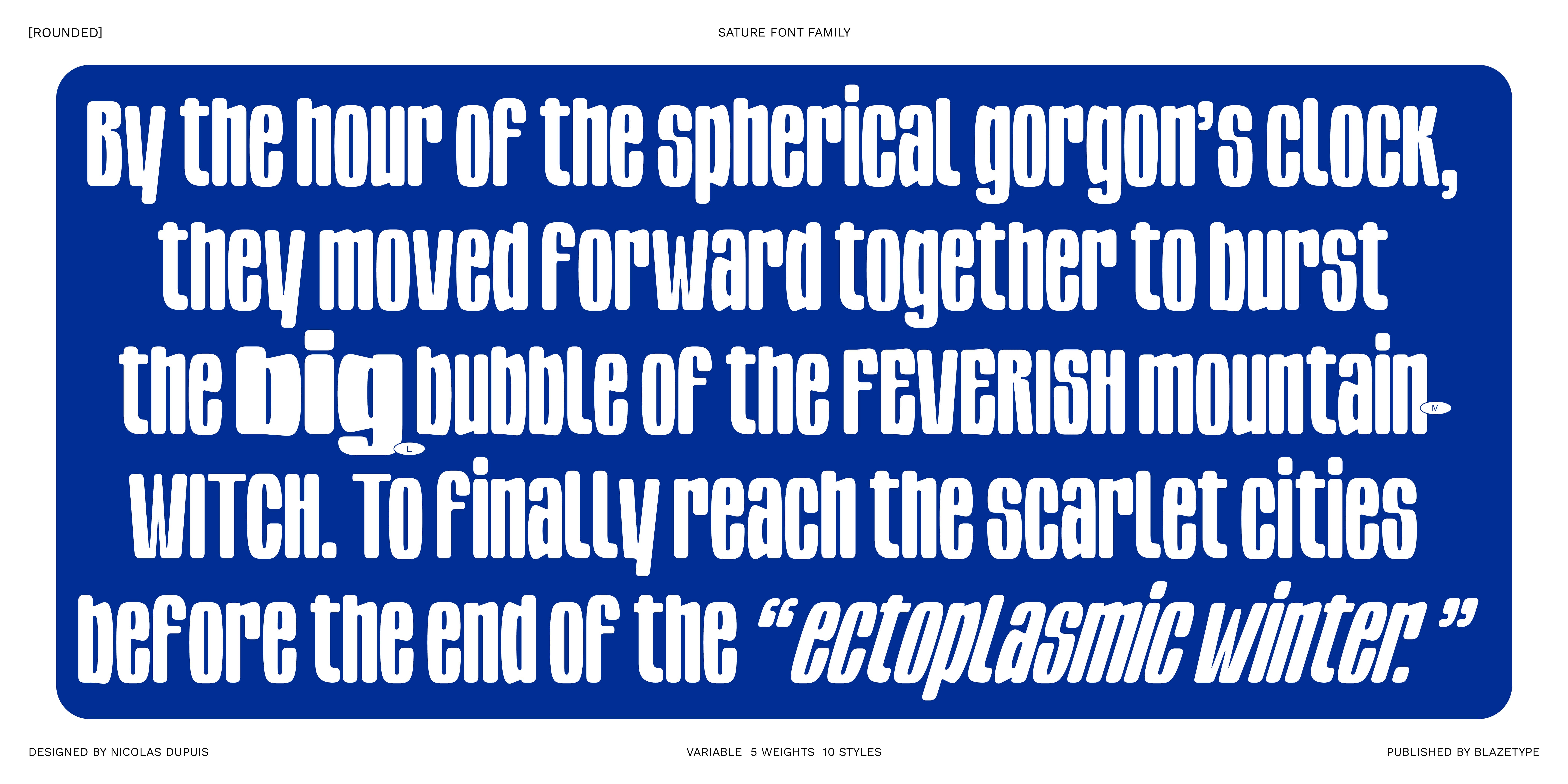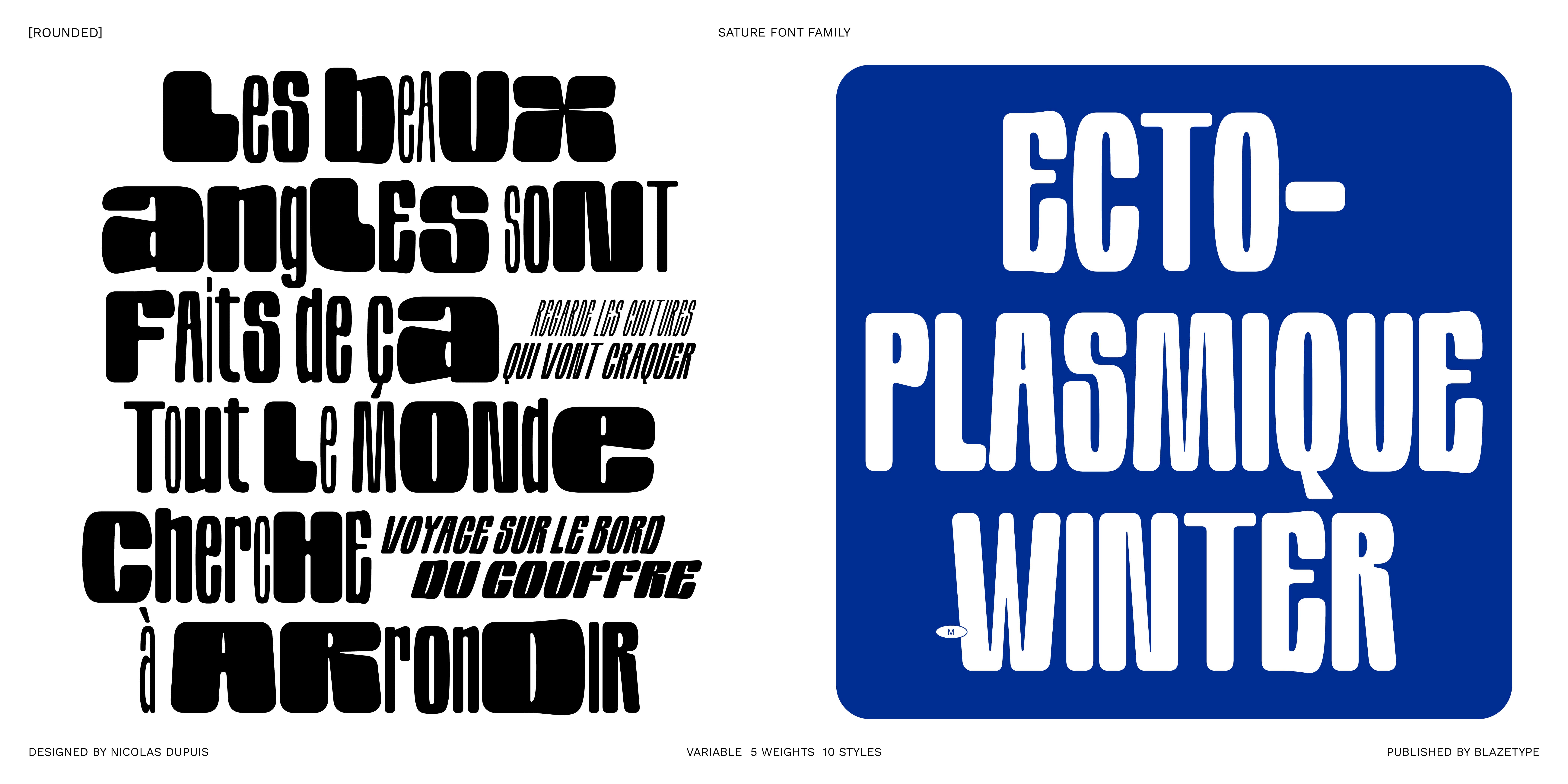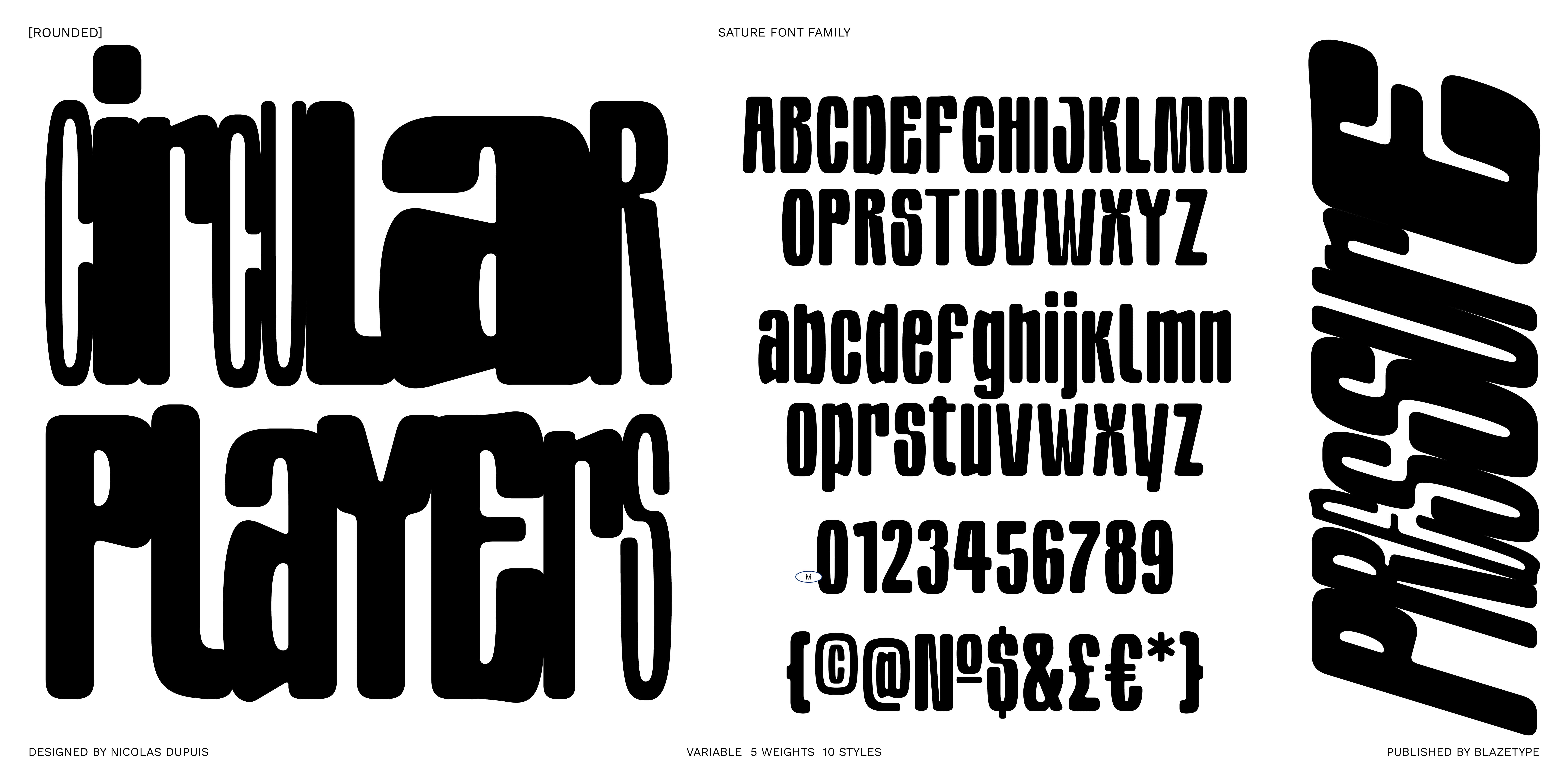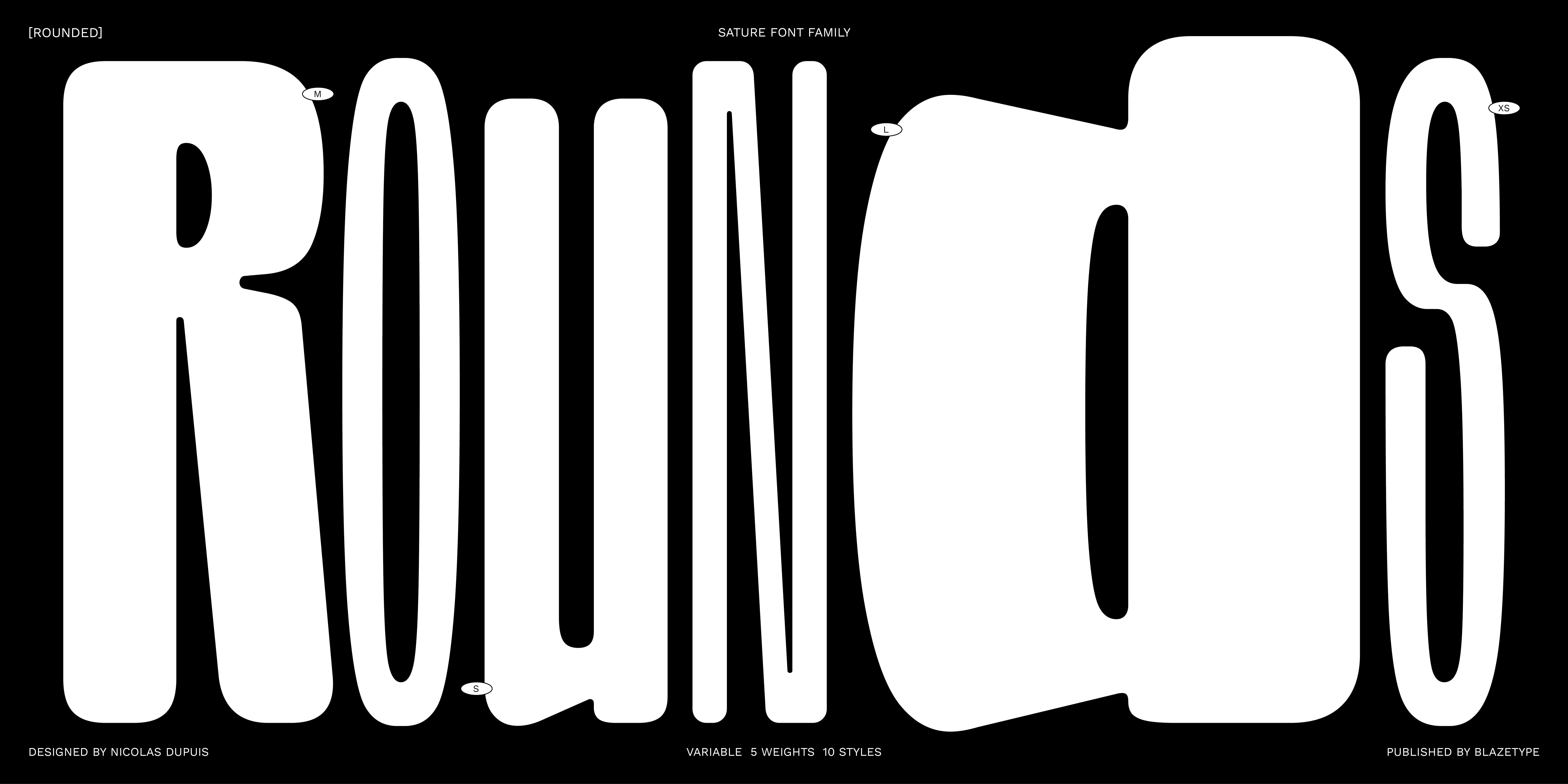 Designed from large-print lettering drawn on paper, the Sature font family came from a desire to create a complete family that unfolds. With this rounded version, there are no more sharp angles! It is a flexible way to share some good vibes. All styles can be used together to create contrasts in the layout. The name of the font comes from the french word «Saturer», meaning to overtake with excess. Feel free to maximize. With its 5 heights and 10 styles with the slant, the family offers a wealth of possibilities for creating saturation effects. A variable font that gives the impression that between each style appears a doubling of the letter, like a felt-tip marker that enlarges the letter. Horizontal processing was carried out to give the letters their fullness, making it easy for use in large sizes and high-impact messages.