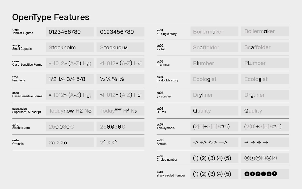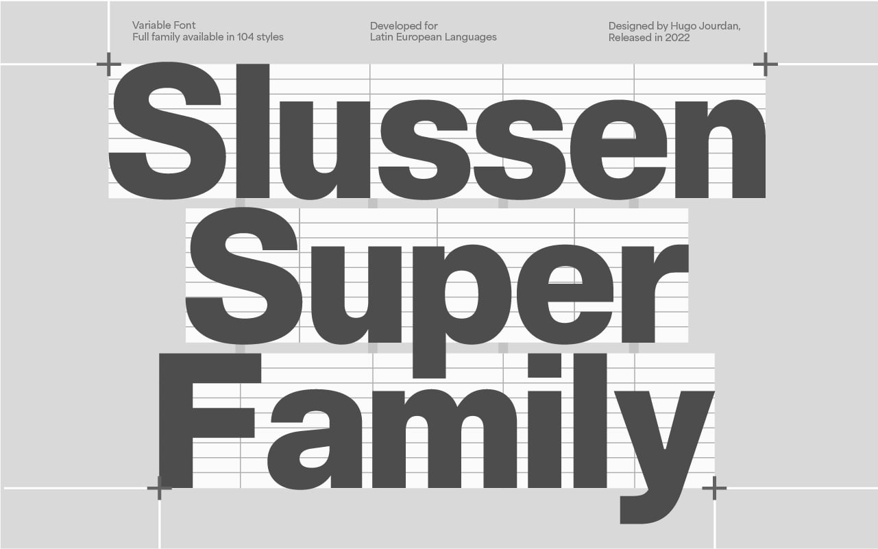 Slussen is a Neo-Grotesque typeface well suited to tech and industrial companies. Slussen's inspiration comes from rhythm and organisation of construction sites. When compared to more conventional Neo-Grotesque typefaces, Slussen's design structure is based on a linear evolution throughout angular outlines. Combined with flat endings and a slight contrast in letterforms, this font family has been designed to cover a very large range of uses, from small captions to huge titles. From Compressed to Expanded, the complete family ranges across 6 widths and 8 weights + matching italics for a total of 104 styles in order to fit all types and sizes of supports, both print and on screen. The family includes a Stencil version in reference to construction sites, ideal for designing signage tools and a Monospace version which combined with the standard version, allows Slussen to be a strong font system.