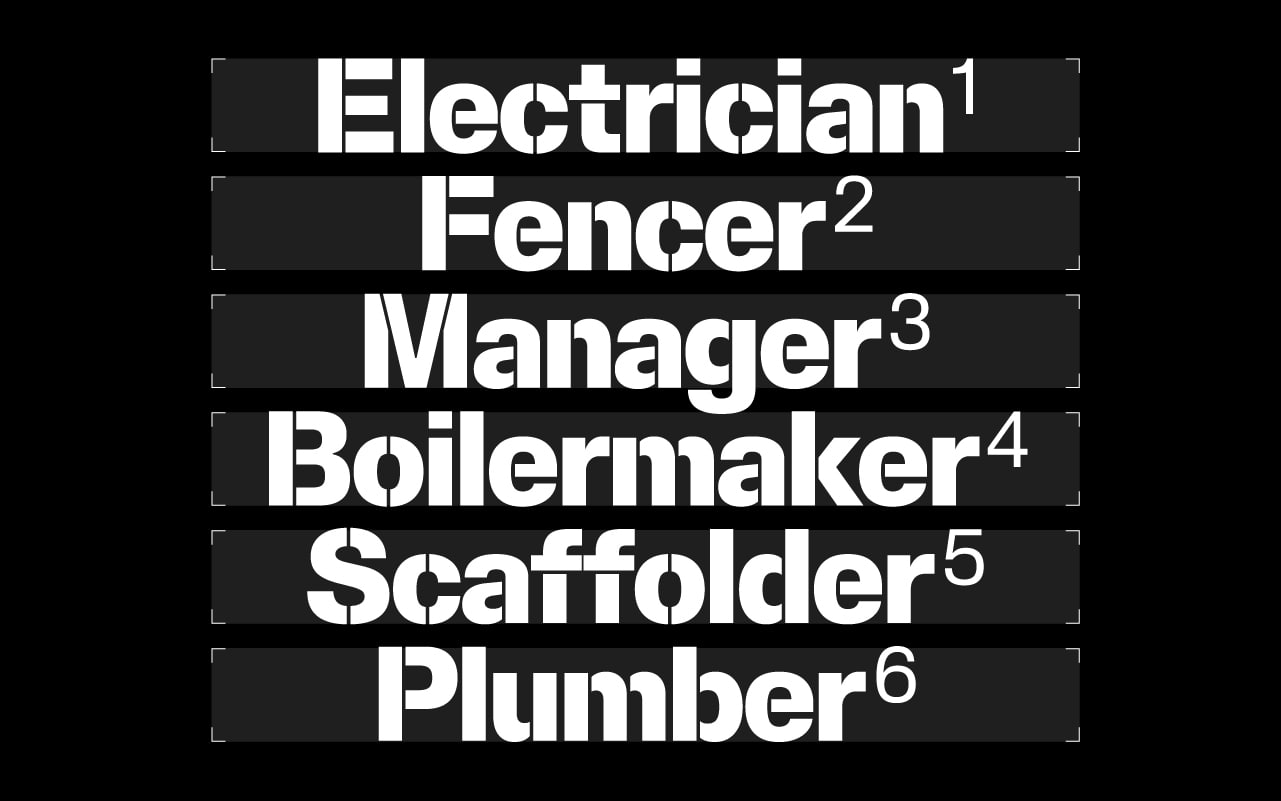 Slussen Stencil is the other variation of Slussen. Created in reference to construction sites, it is ideal for designing signage tools. Stencil is defined by its bold, geometric and simplified cutout letterforms.