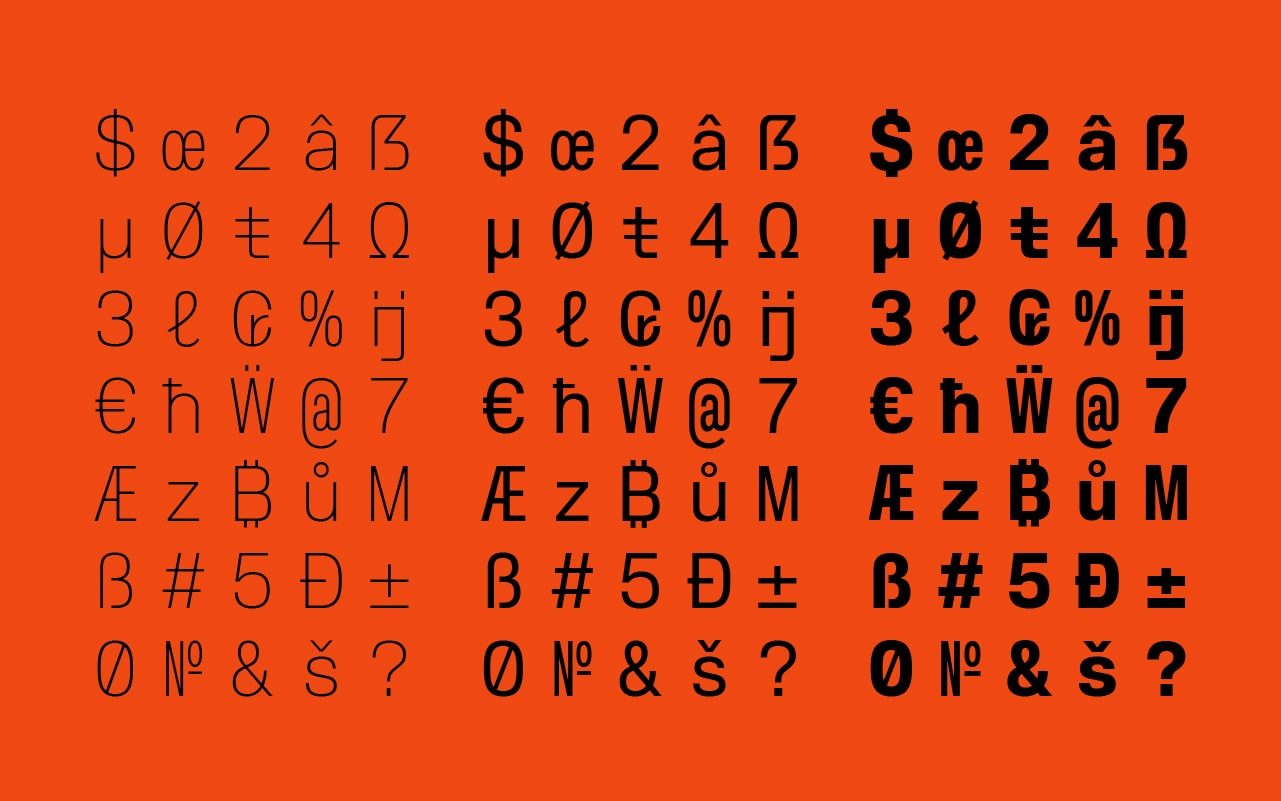 Slussen is a Neo-Grotesque typeface well suited to tech and industrial companies. Slussen's inspiration comes from rhythm and organisation of construction sites. When compared to more conventional Neo-Grotesque typefaces, Slussen's design structure is based on a linear evolution throughout angular outlines. Combined with flat endings and a slight contrast in letterforms, this font family has been designed to cover a very large range of uses, from small captions to huge titles. From Compressed to Expanded, the complete family ranges across 6 widths and 8 weights + matching italics for a total of 104 styles in order to fit all types and sizes of supports, both print and on screen. On top of this Stencil variant, the font family also includes a Monospace version which combined with the standard version, allows Slussen to be a strong font system.